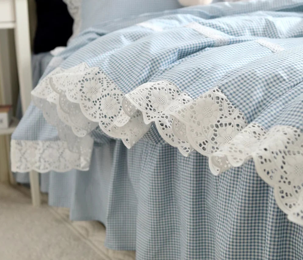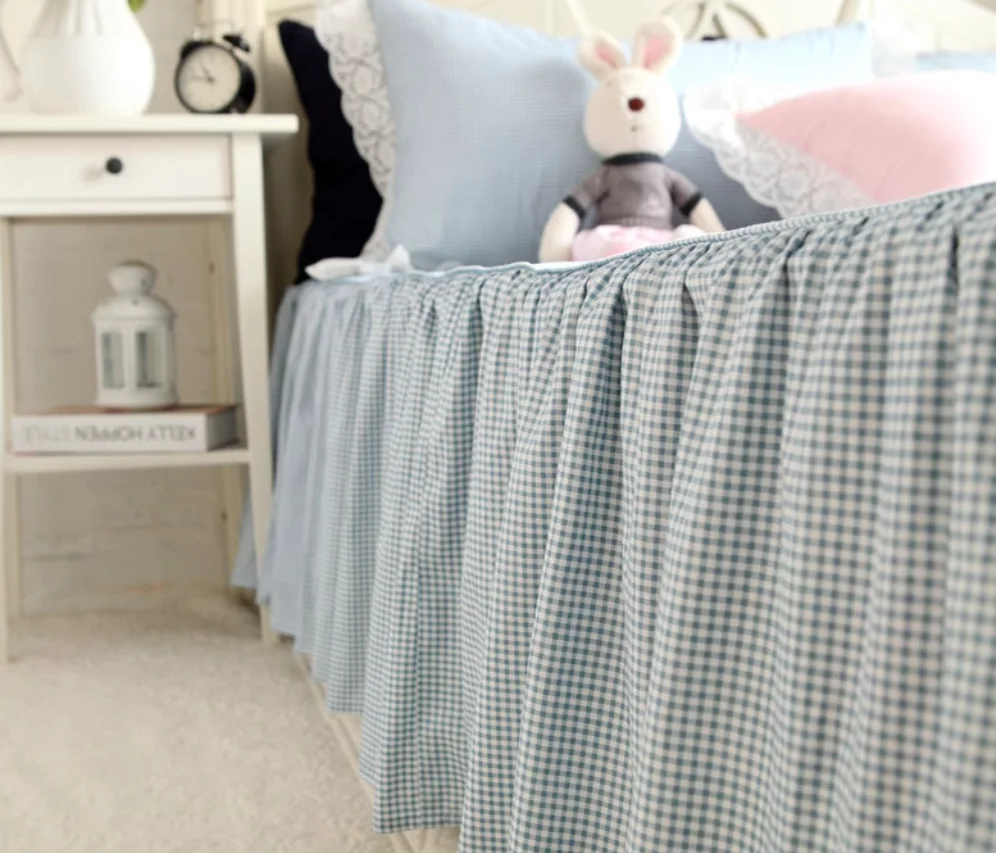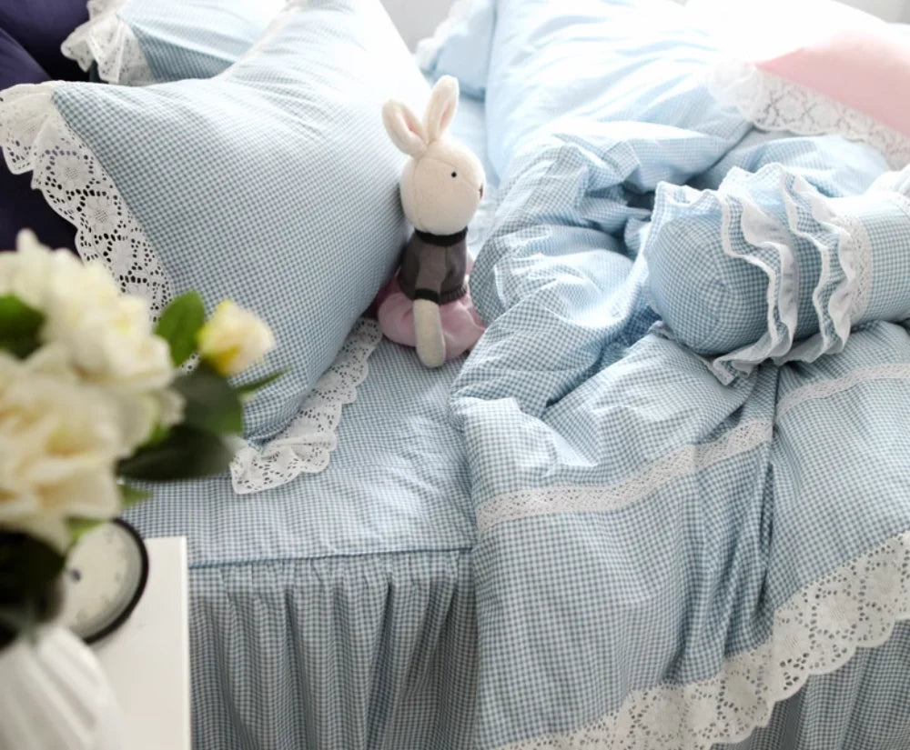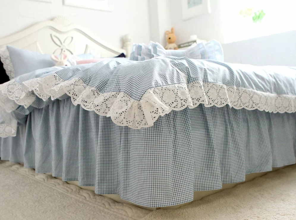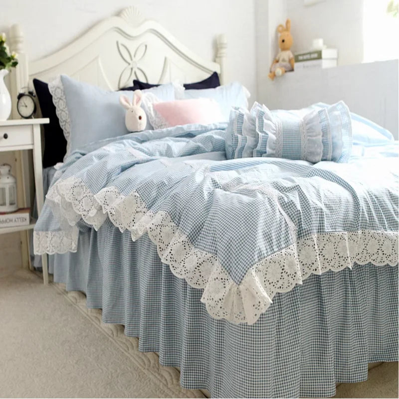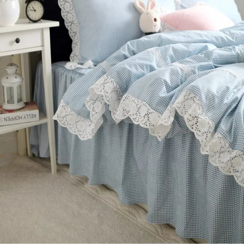 Purpdrank 100% Cotton Bedding Set Luxury Blue Plaid Printing Princess Lace Duvet Cover Bed Skirt Bedspread Pillowcases Home Textile