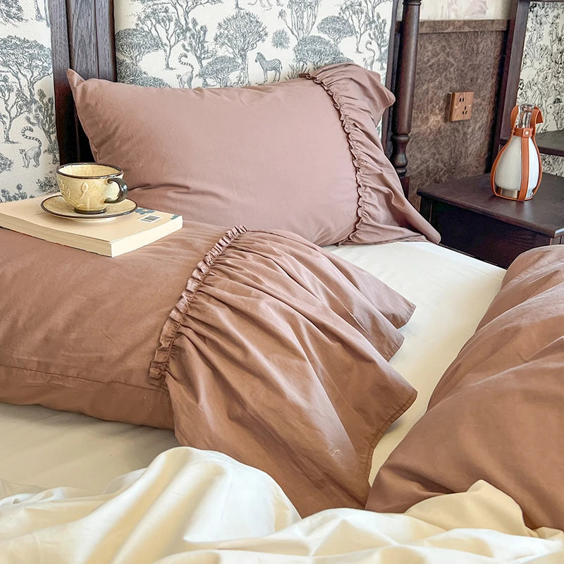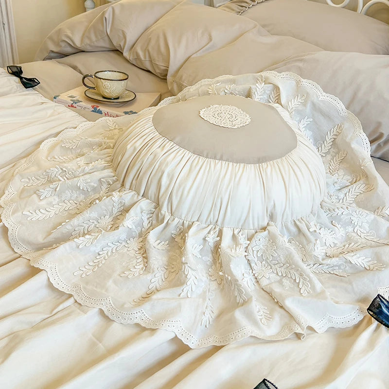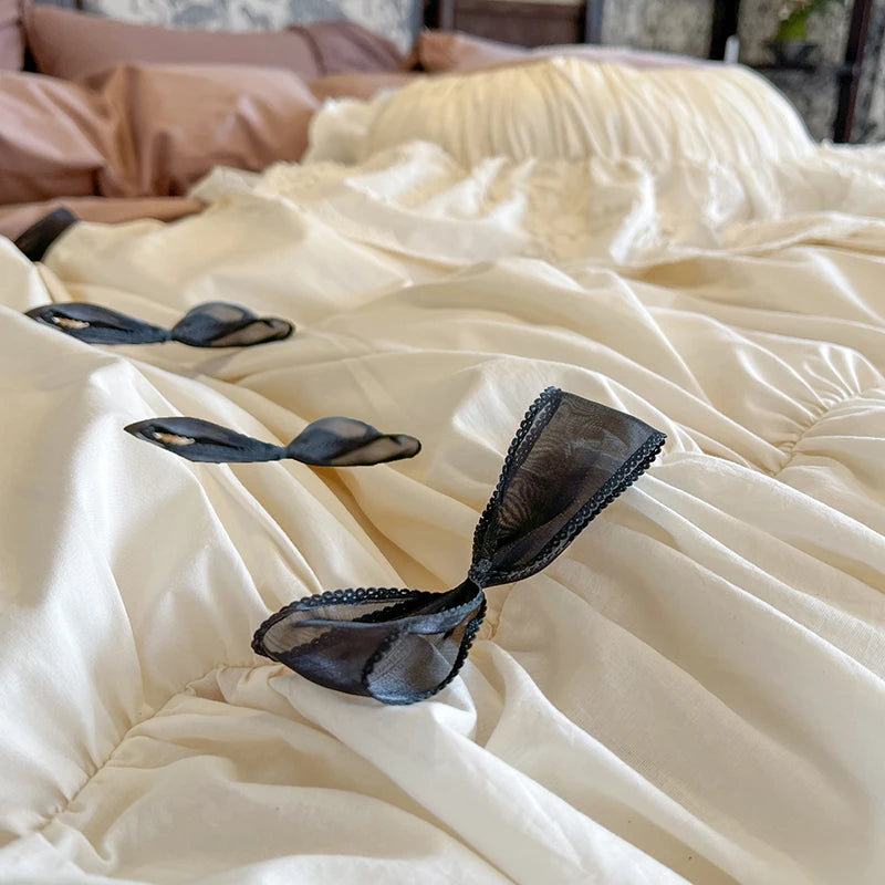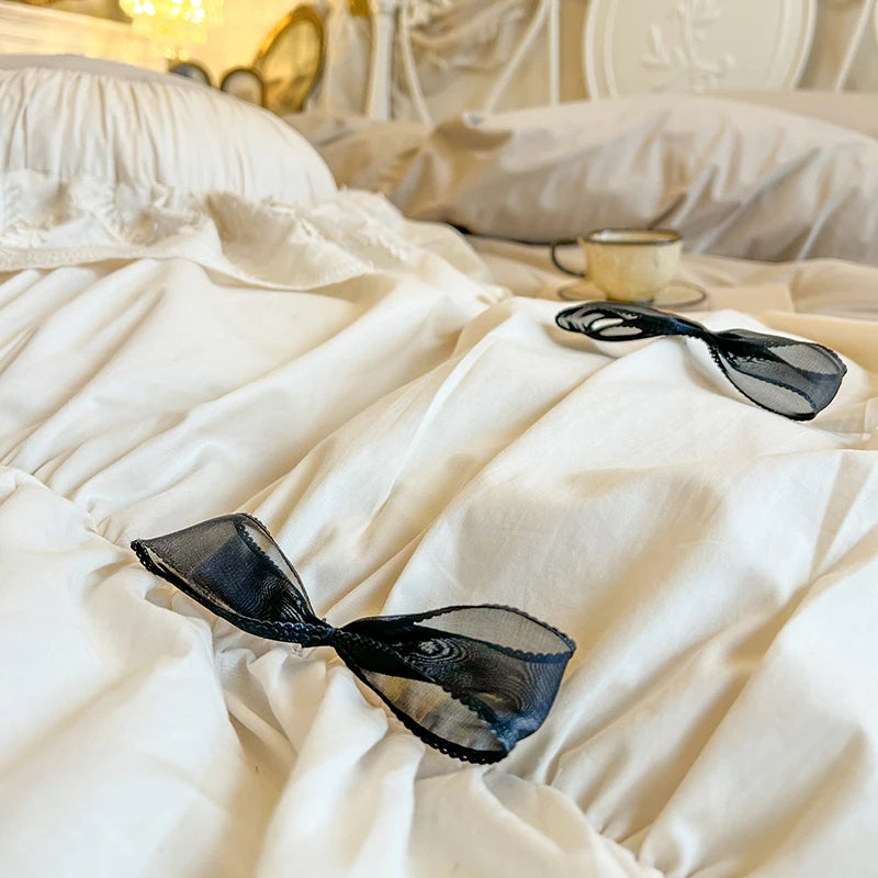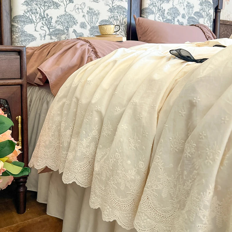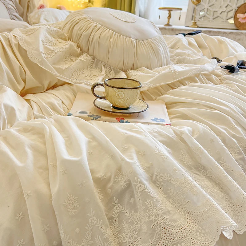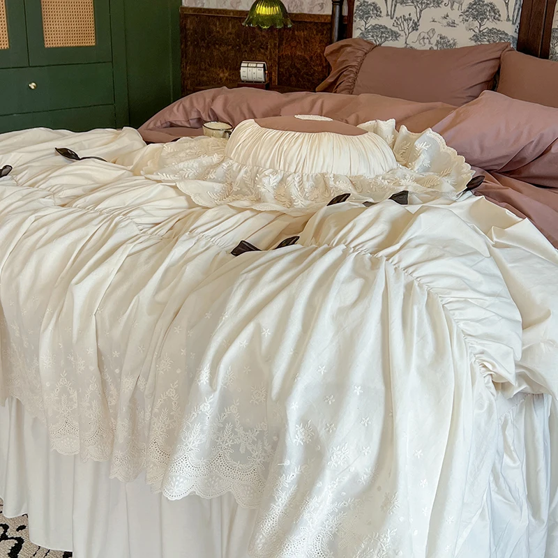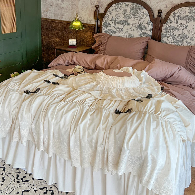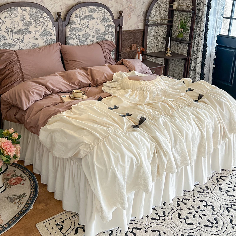 Purpdrank 100% Cotton Vintage French Pleated Lace Ruffles Bow Princess Bedding Set Duvet Cover Set Bed Skirt Bedspread Pillowcases