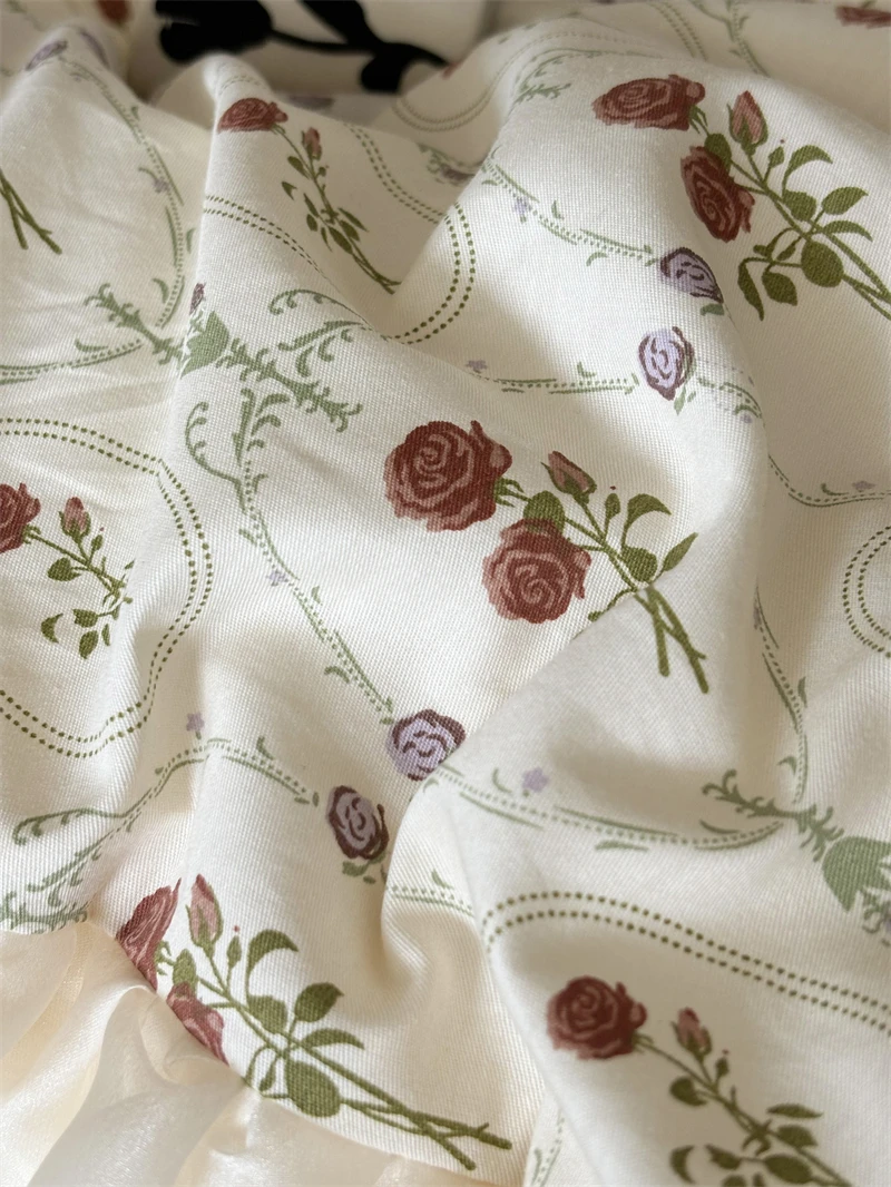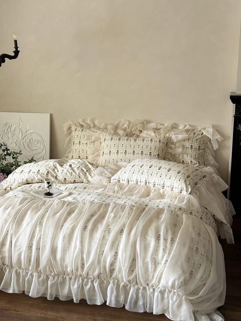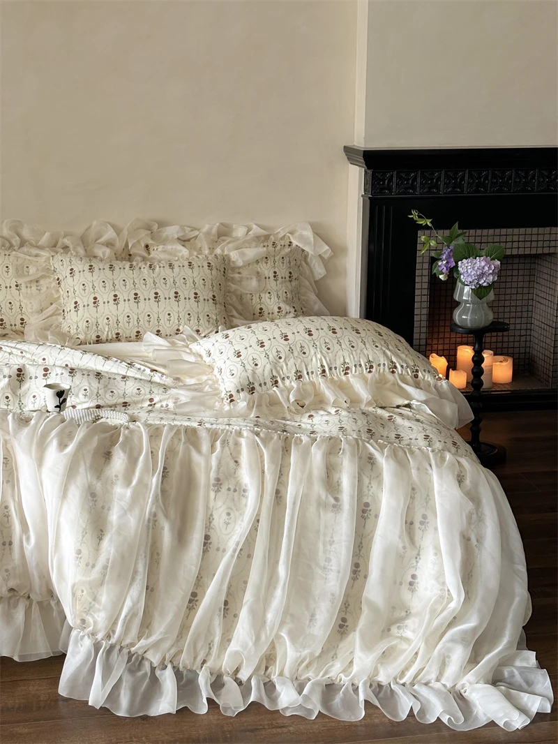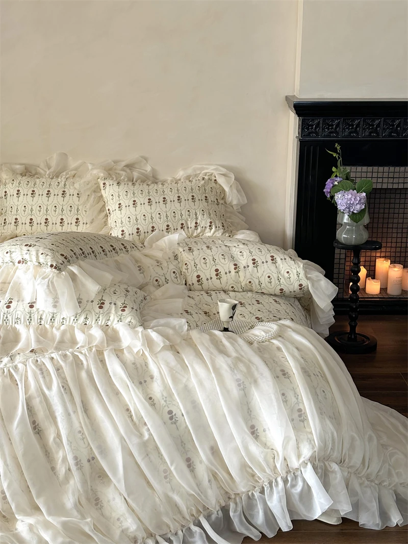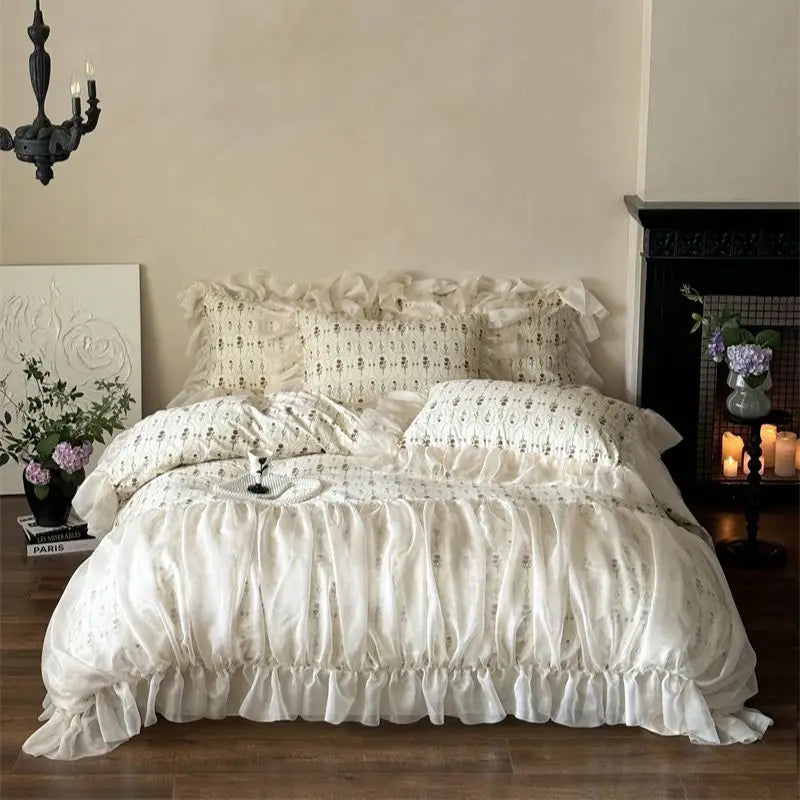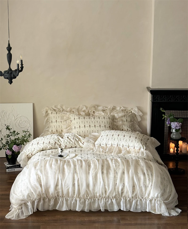 Purpdrank 100% Cotton Vintage French Rose Print Pleat Lace Ruffles Princess Bedding Set Duvet Cover Bed Sheet/Fitted Sheet Pillowcase 4Pcs