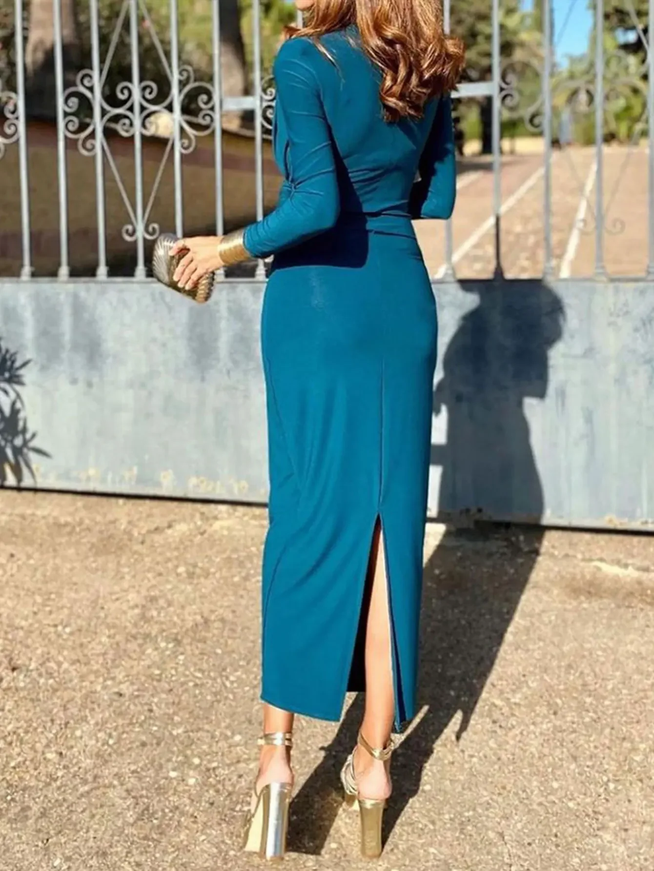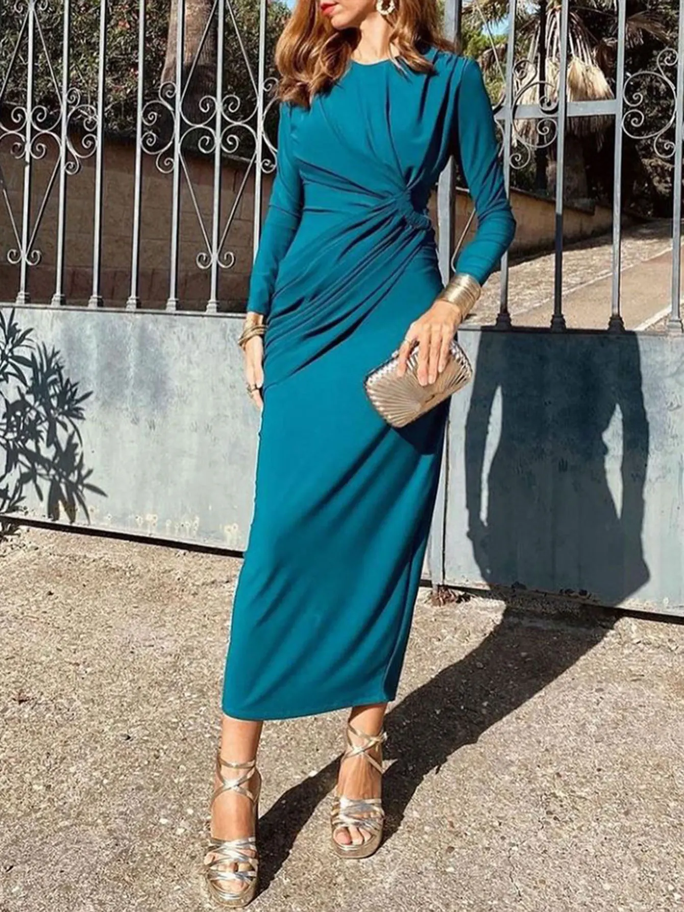 Purpdrank Autumn Dresses Women's Elegant Plain Ruffled Waist Long Sleeve Crew Neck Midi Draped Basics Dresses