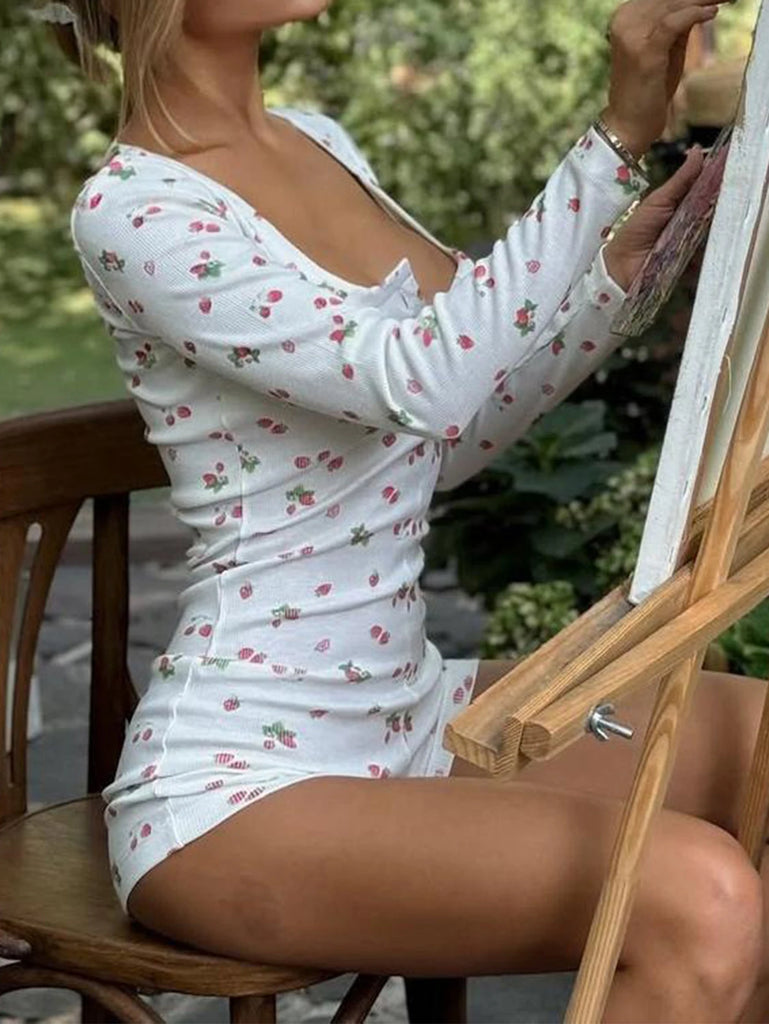 Purpdrank Autumn Jumpsuits 2025 Women's Sweet Strawberry Print Long Sleeve Square Neck Short Skinny Fit Casual Jumpsuits