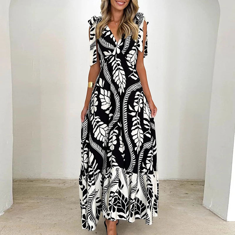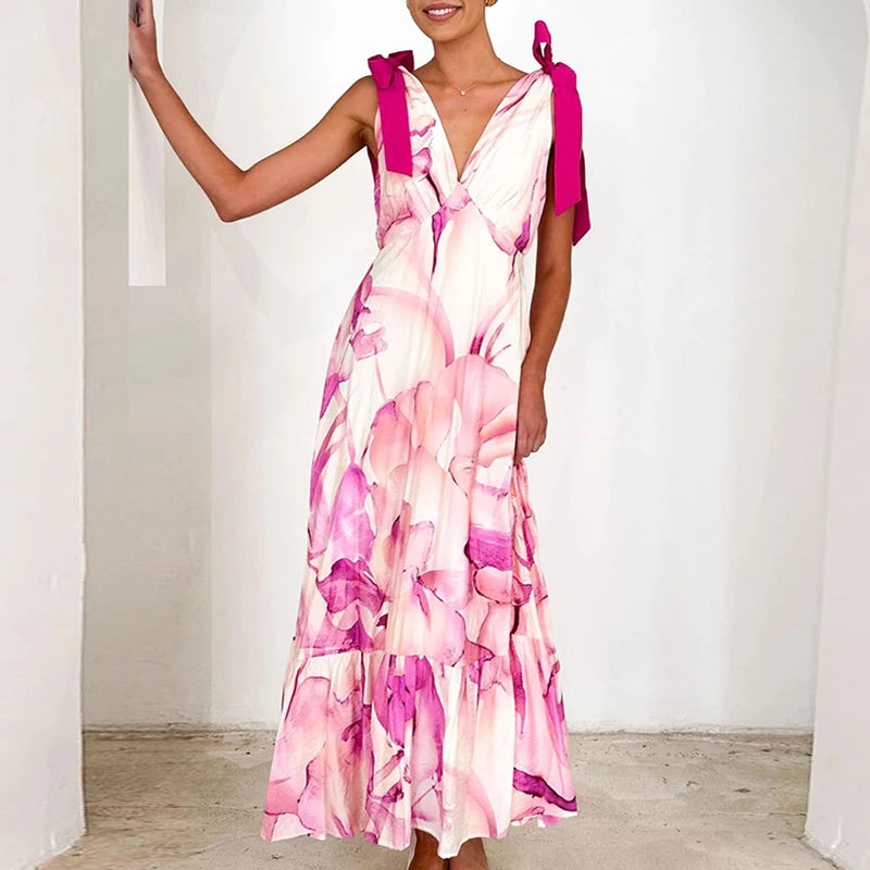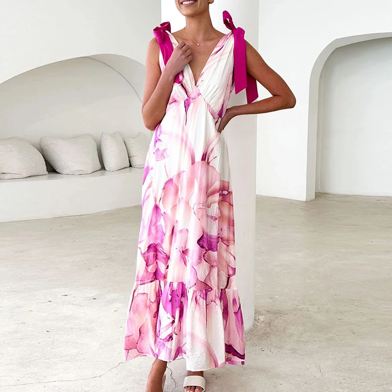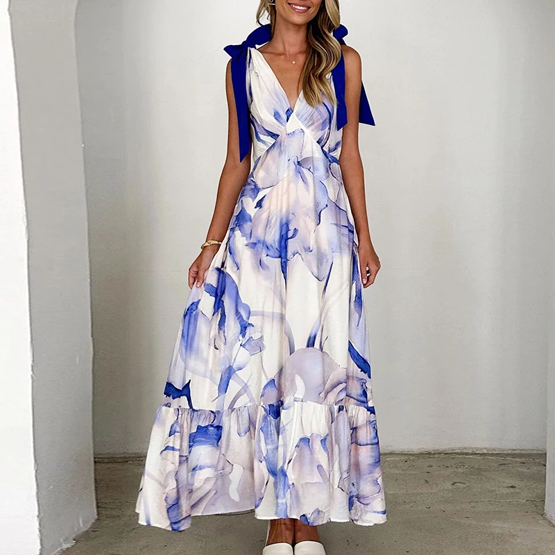 Purpdrank Bow Tie Up High Waist Holiday Long Dress Sexy Sleeveless Pleated Suspender Dresses Women's V Neck Print Bohemian Dress Vestidos