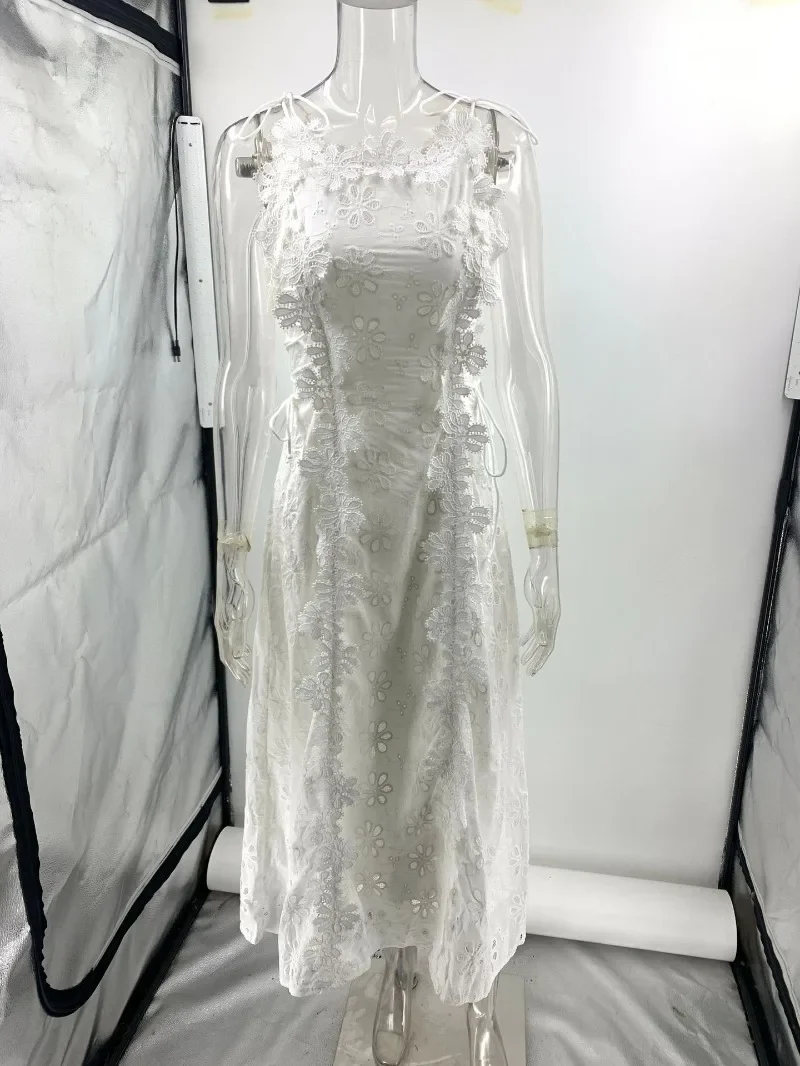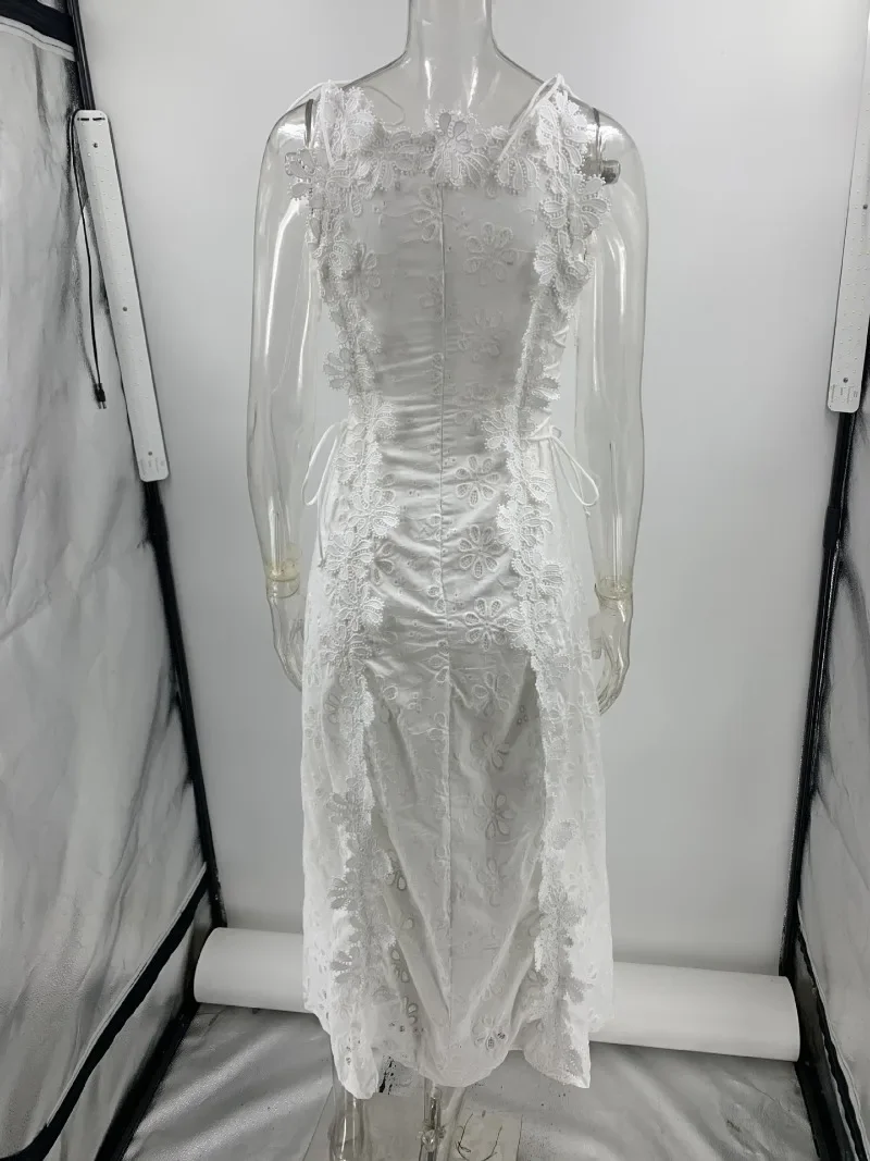 Purpdrank Casual Spring Loose O Neck Lace Appliques Bandage Sleeveless Hollow Out Beach Vacation Long Dress Summer Party Dress for Women