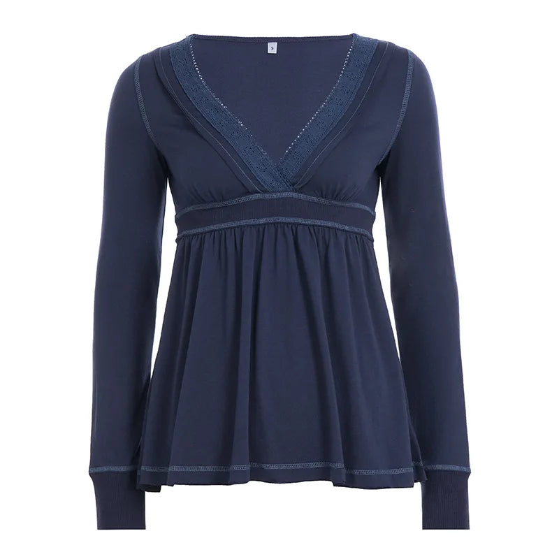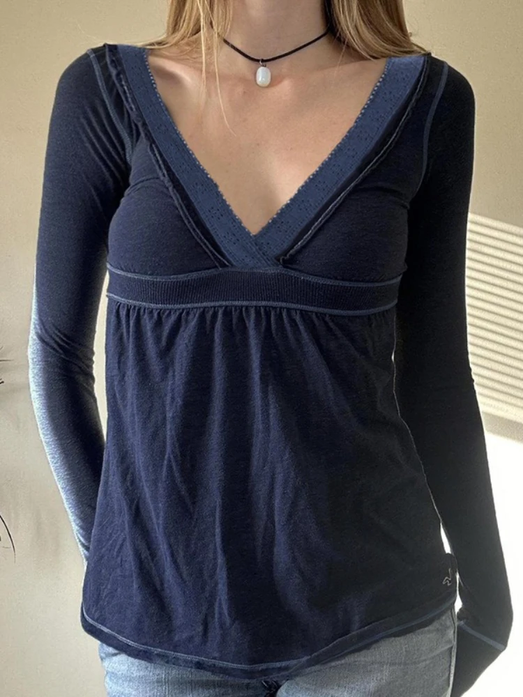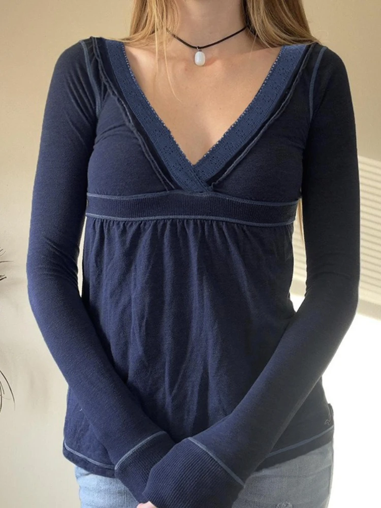 Purpdrank Casual Sweet All Match V Neck Loose Long Sleeve Solid High Waist Y2k Patchwork Sexy T-Shirts