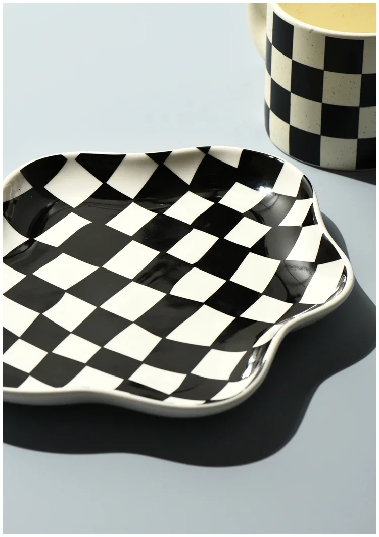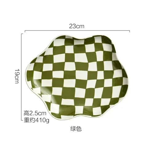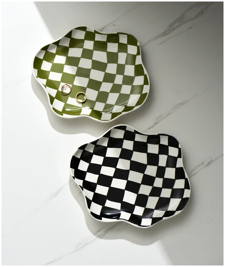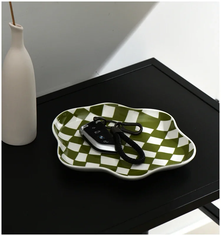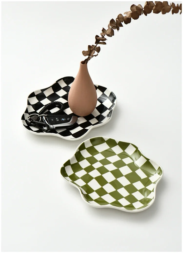 Purpdrank Ceramic Tray Checkerboard Jewelry Storage Plate Ring Earing Dessert Plate Home Decoration Retro Desk Organizer Kitchen Tableware
