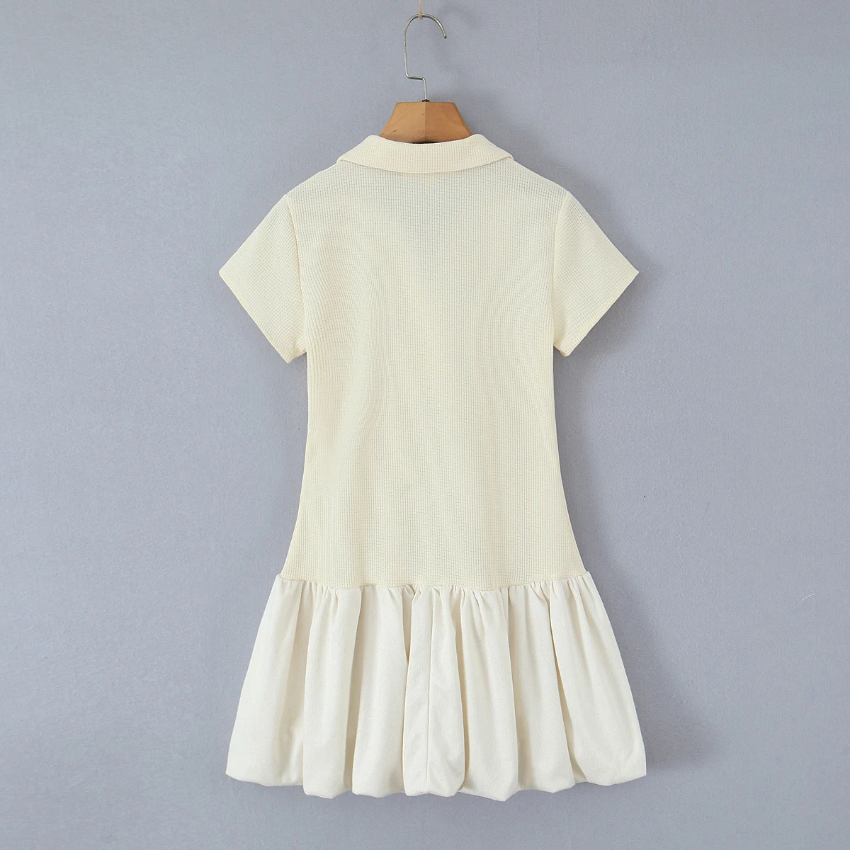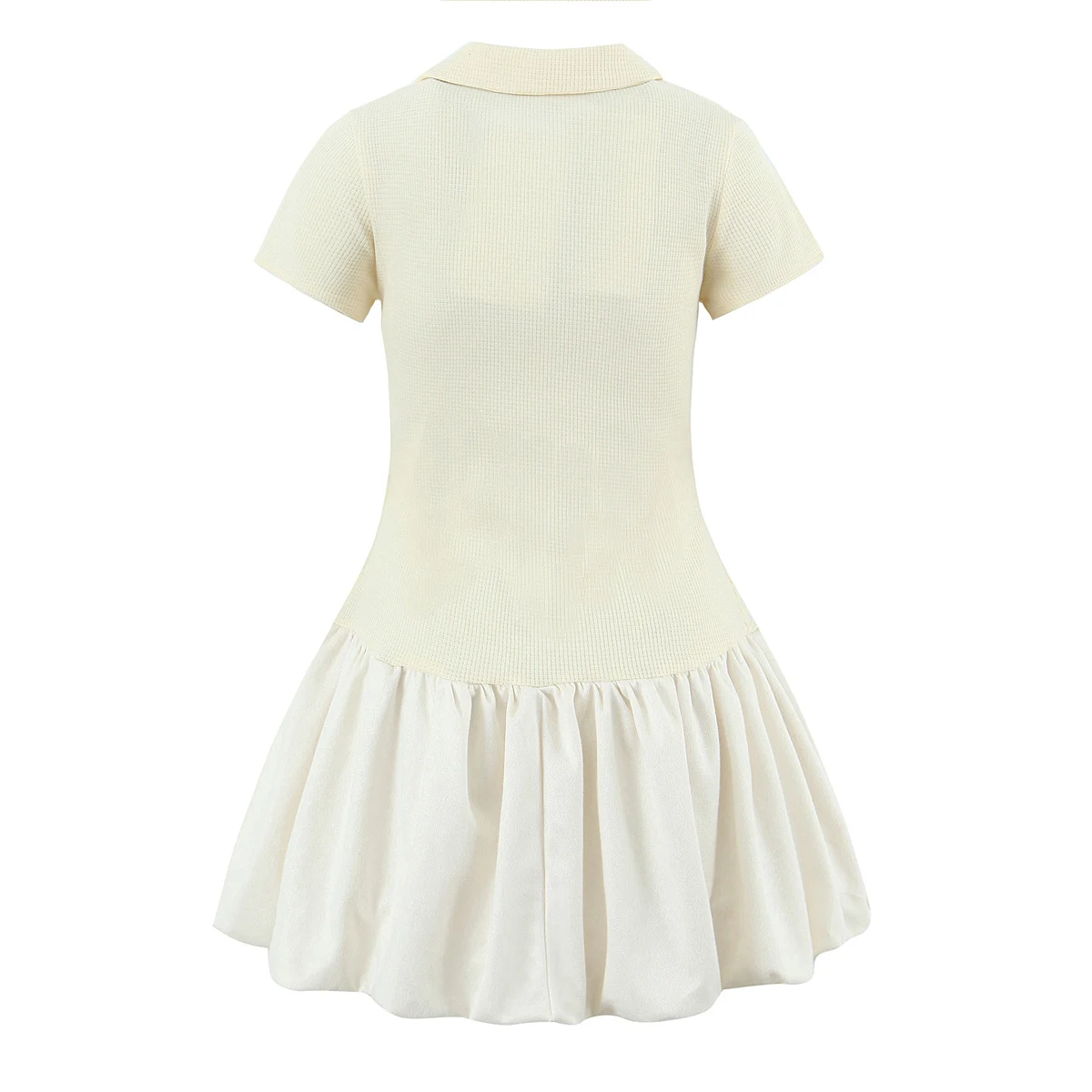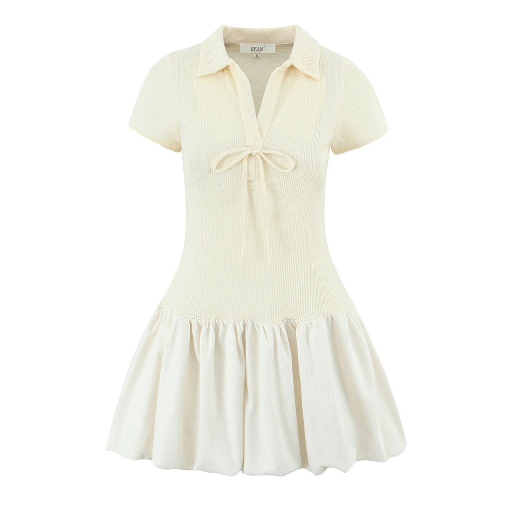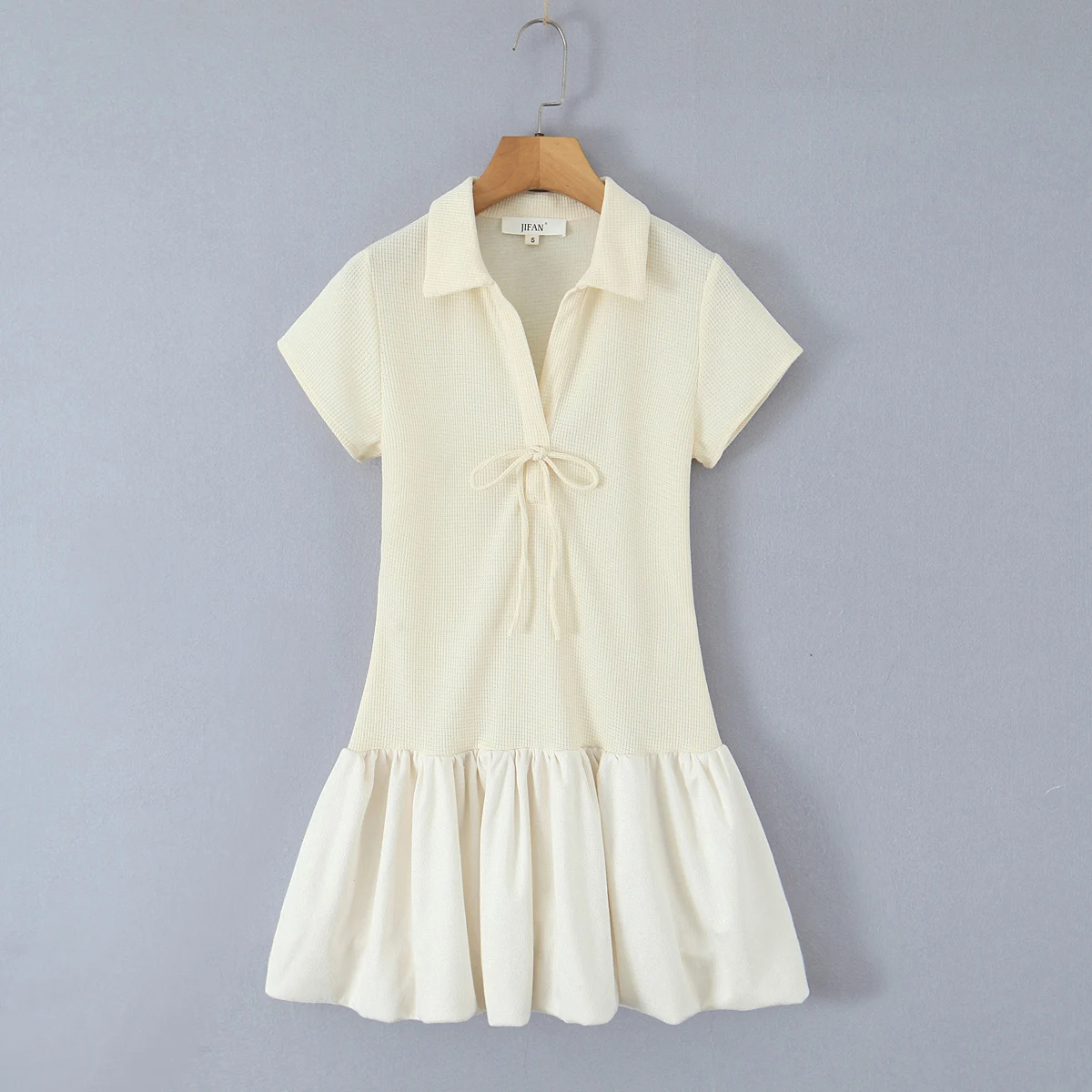 Purpdrank CHIC Beige Polo Collar Bow Lapel V Waffle Knitted Short Sleeve Dress Women Slim Waist Spliced BUD Swing Short Dresses Robe