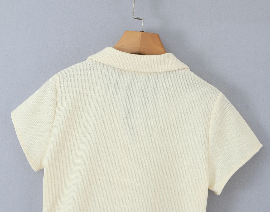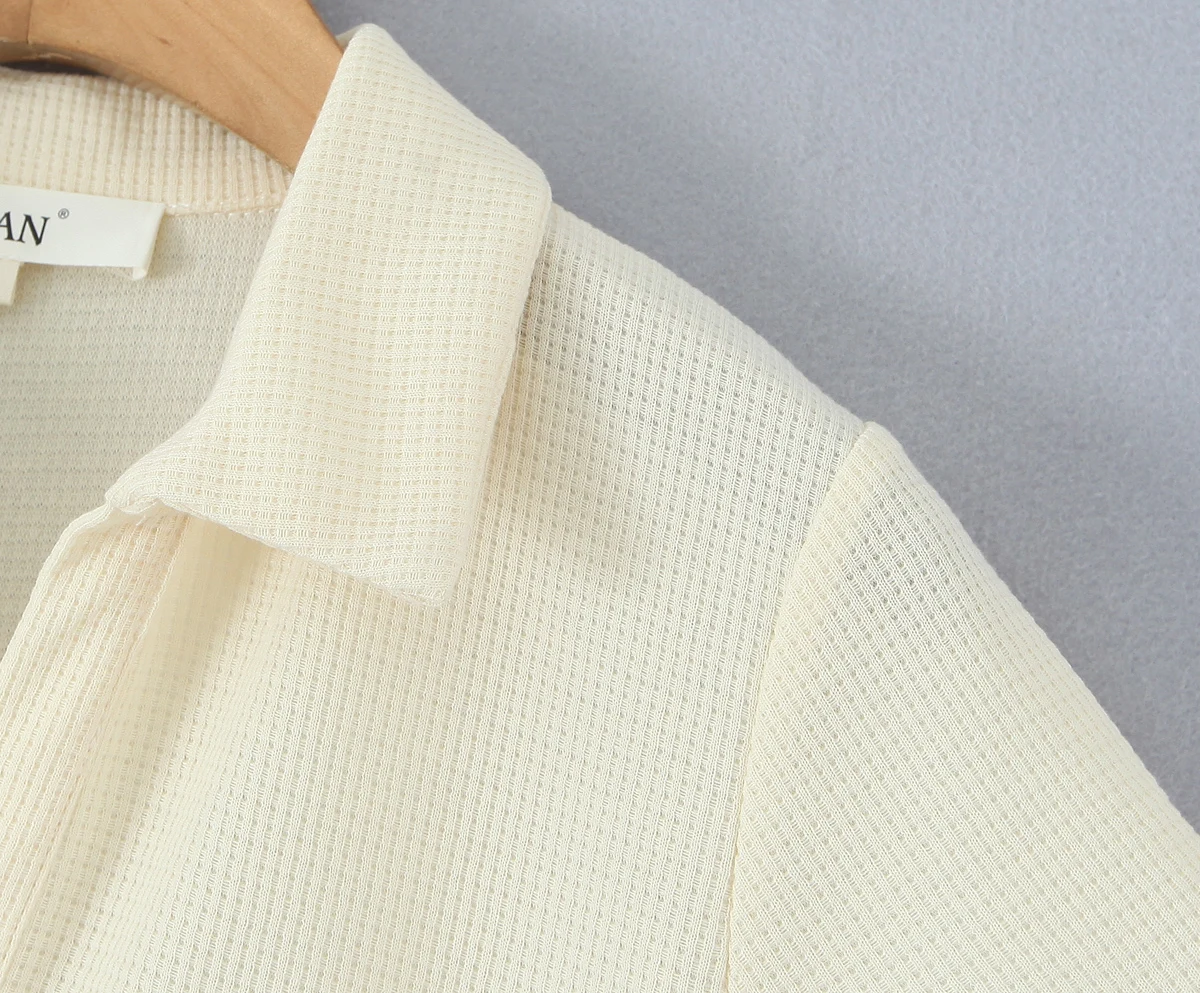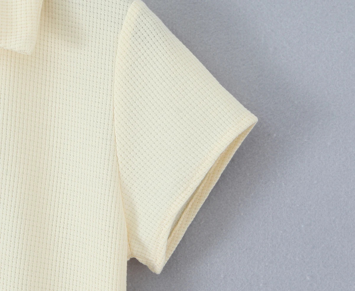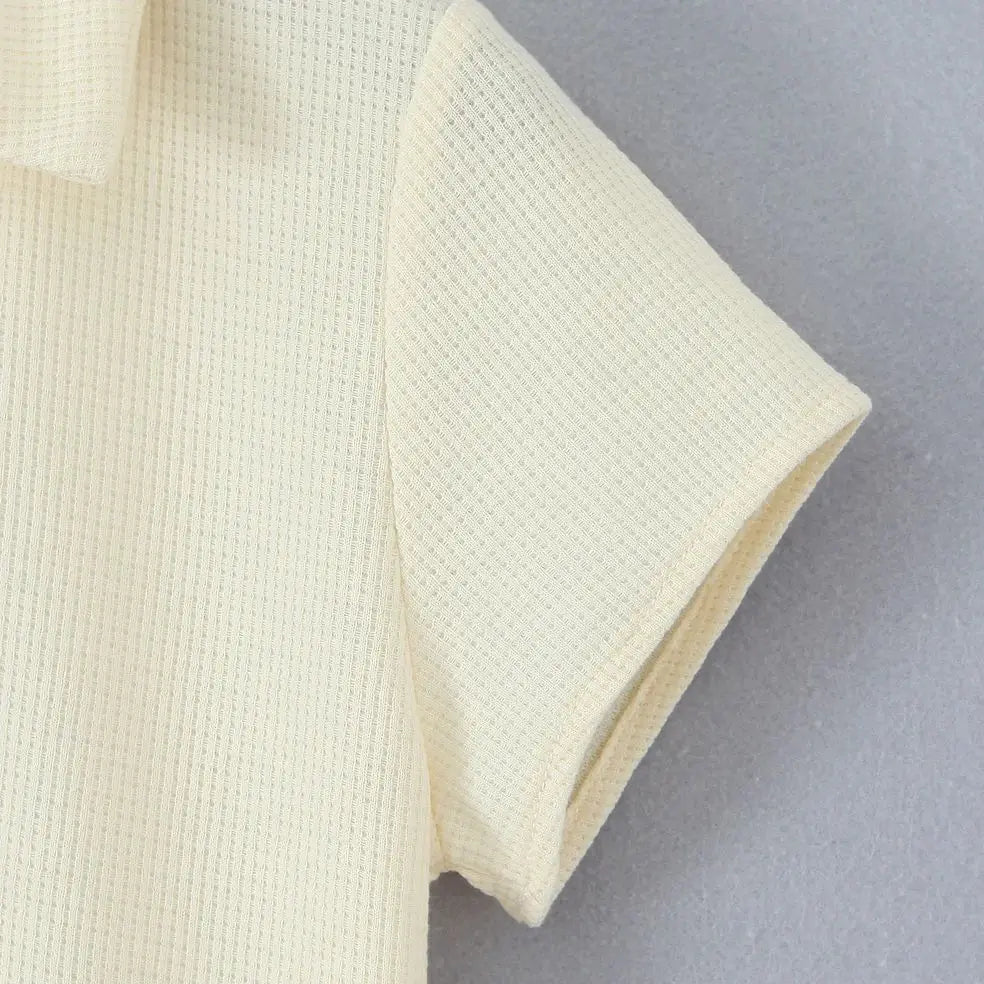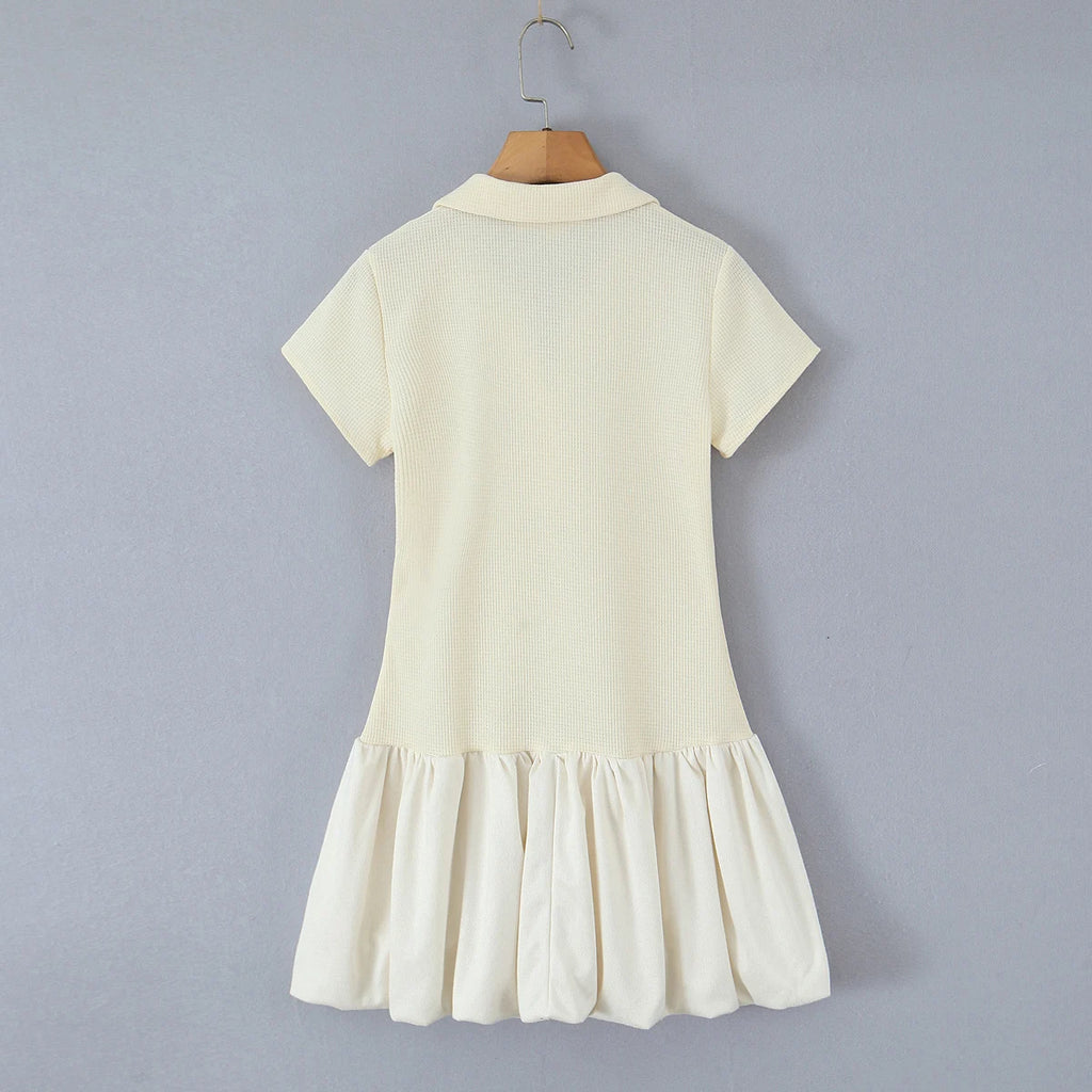Purpdrank CHIC Beige Polo Collar Bow Lapel V Waffle Knitted Short Sleeve Dress Women Slim Waist Spliced BUD Swing Short Dresses Robe