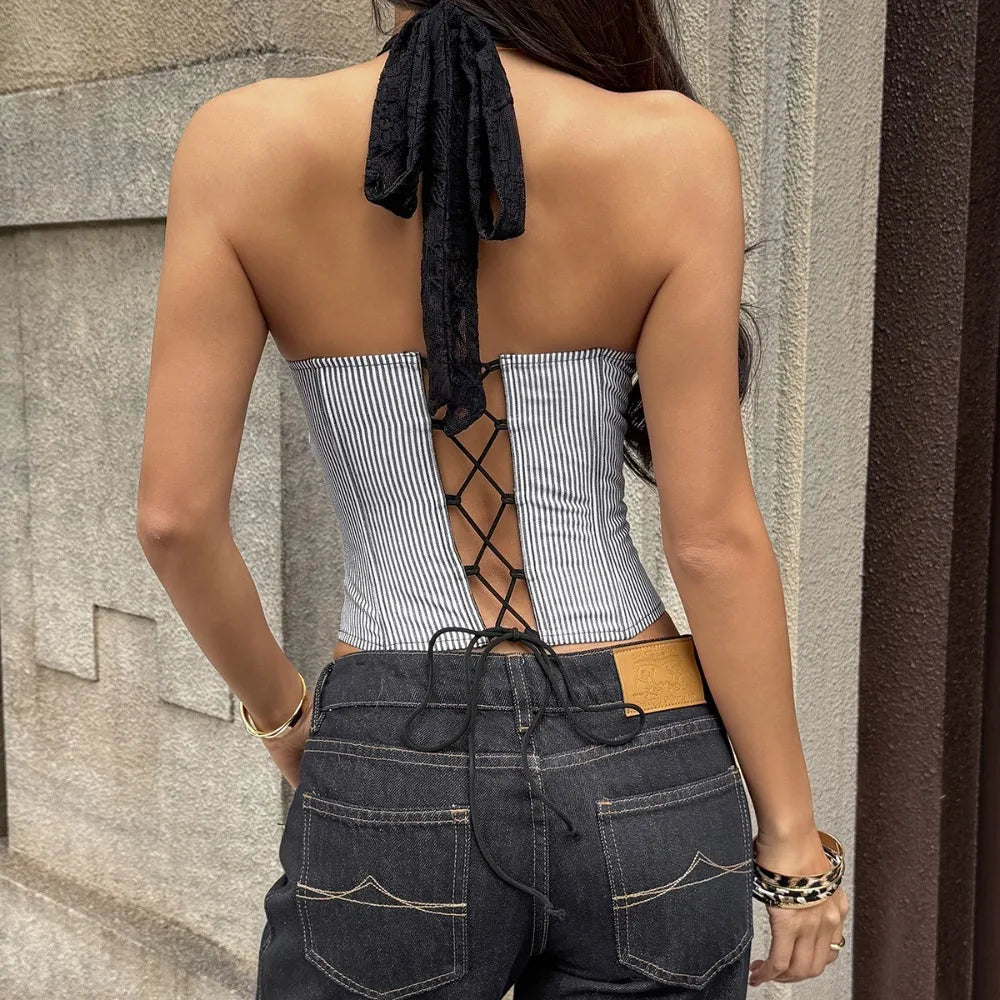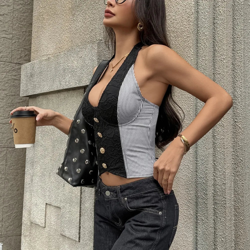 Purpdrank Chic Office Street Striped Lace Halter Top for Women Sexy Deep V Front Sleeveless Slim Irregular Hem Bodycon Crop Tank Top