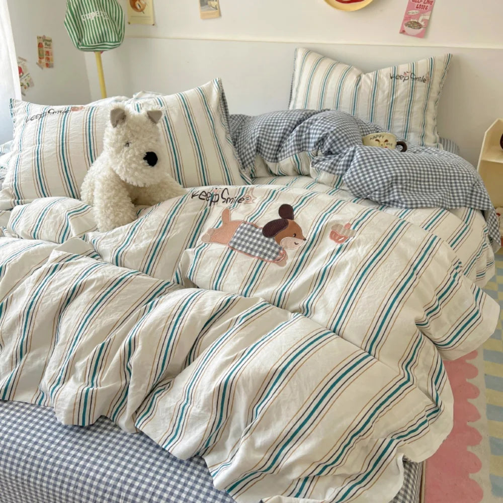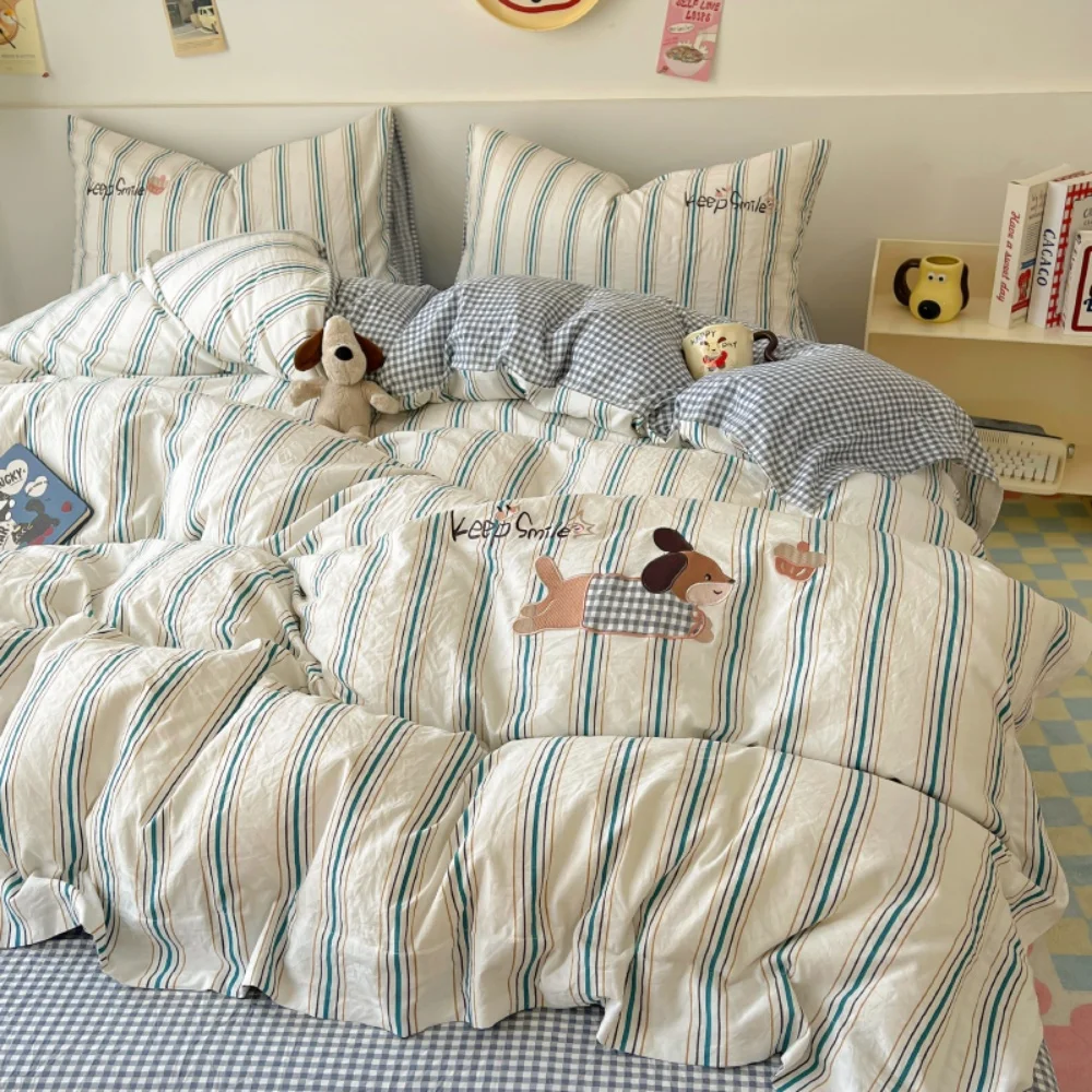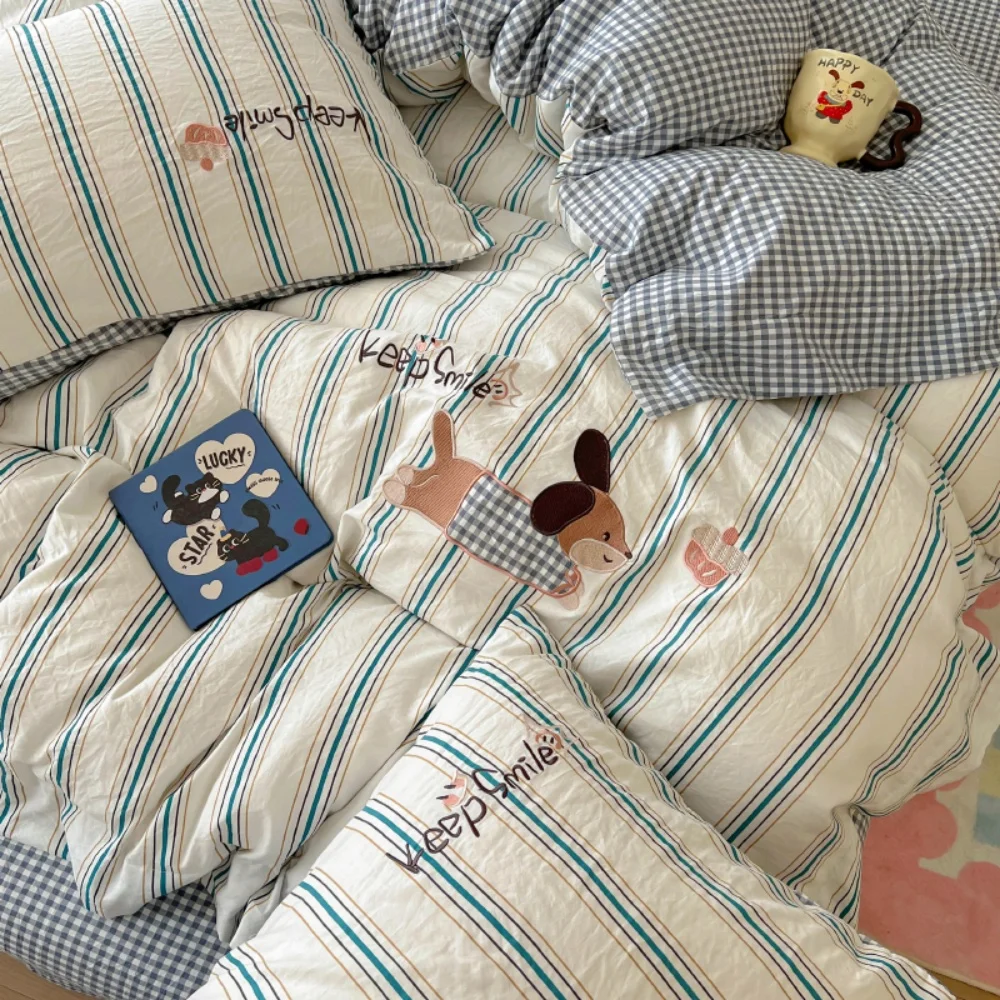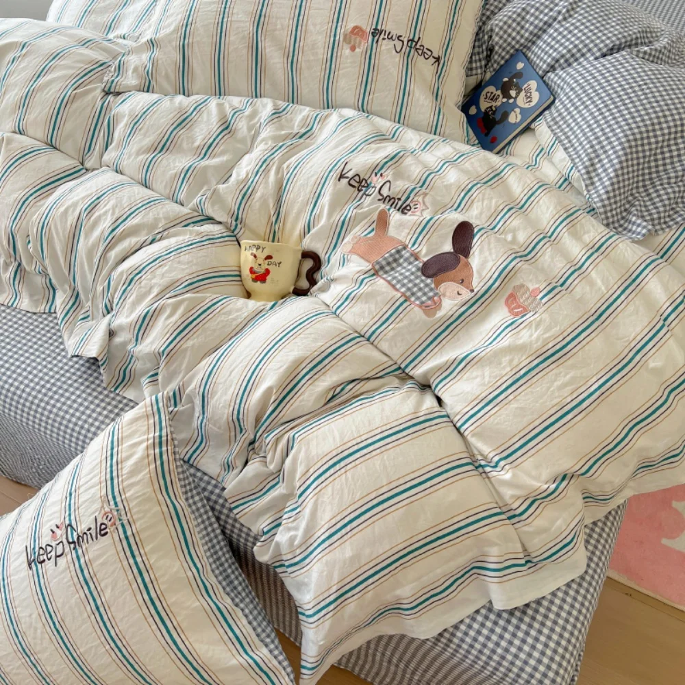 Purpdrank Cute Cartoon Embroidery Stripe Bedding Set Washed Cotton Soft Four Piece Sets Pillowcase Duvet Cover Set 200x230cm Home Textiles