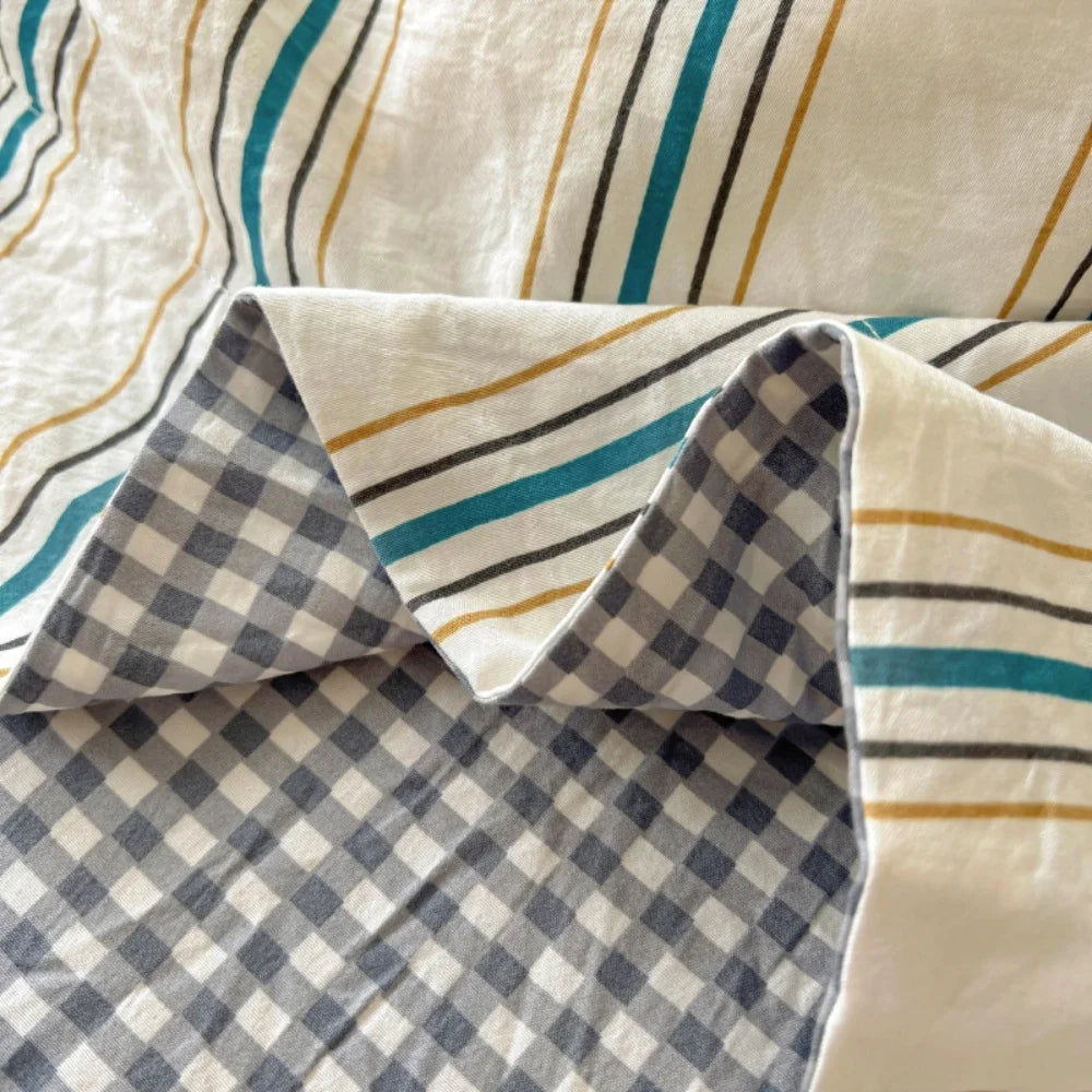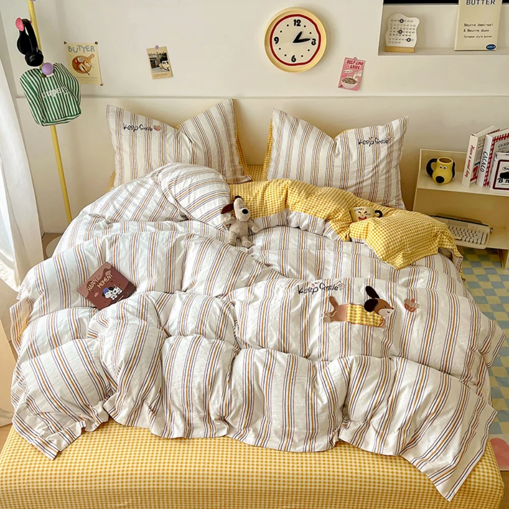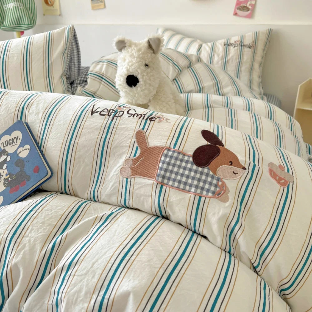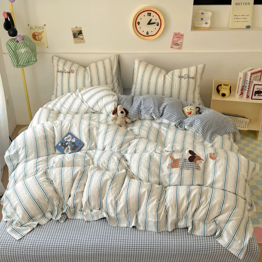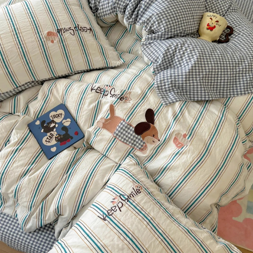Purpdrank Cute Cartoon Embroidery Stripe Bedding Set Washed Cotton Soft Four Piece Sets Pillowcase Duvet Cover Set 200x230cm Home Textiles