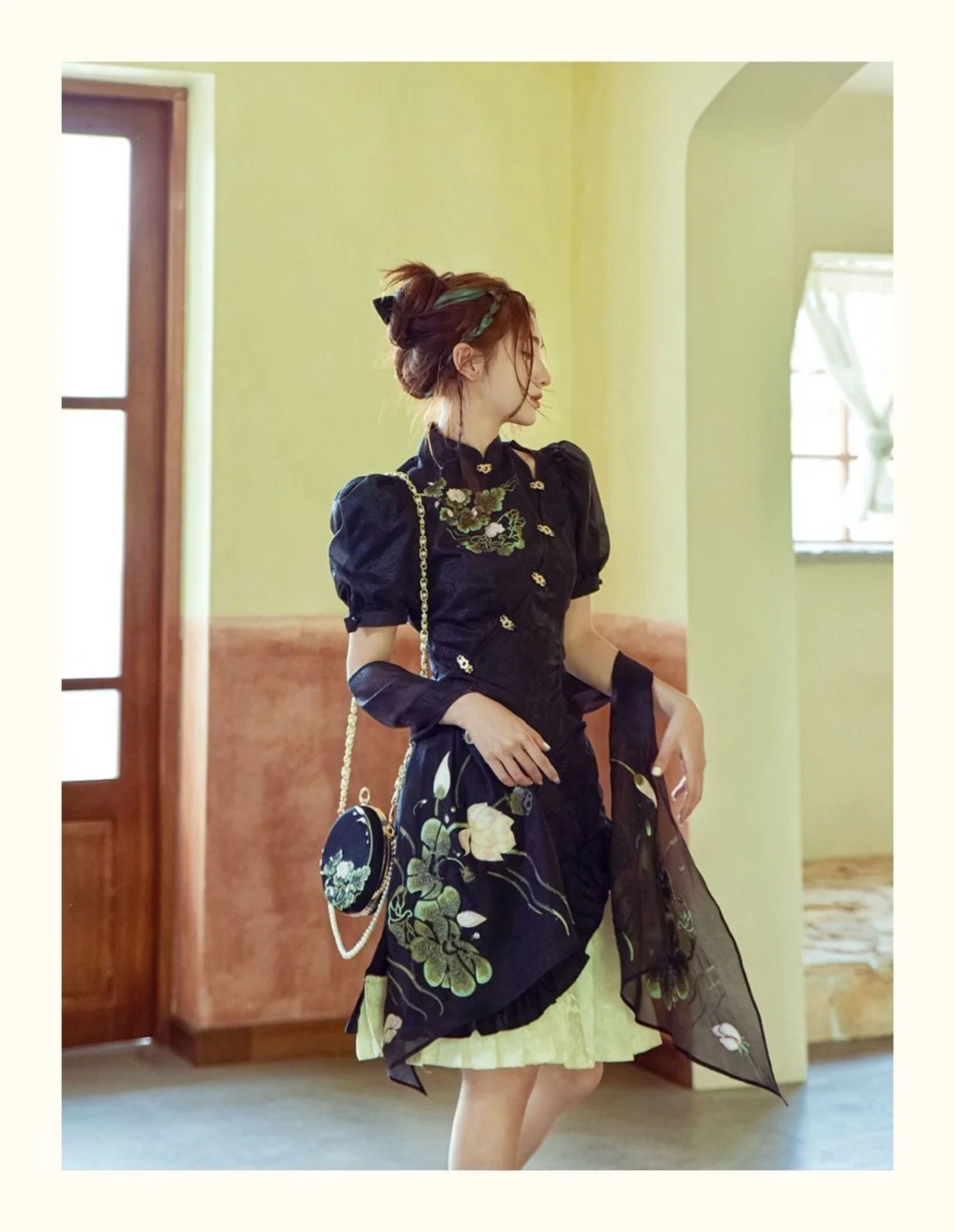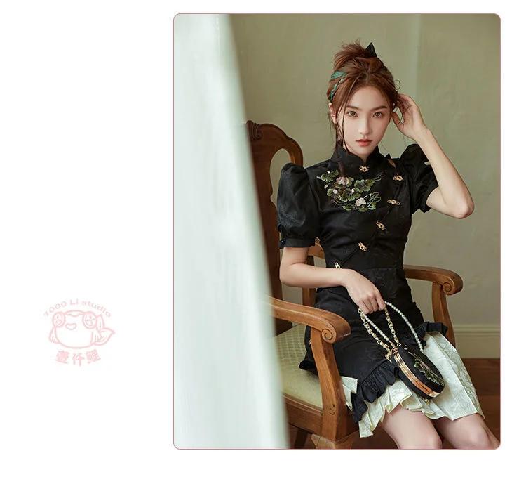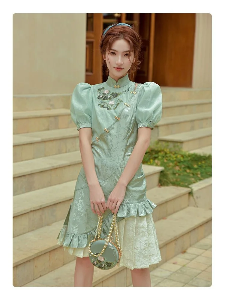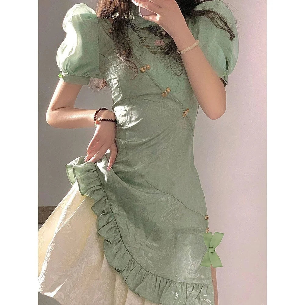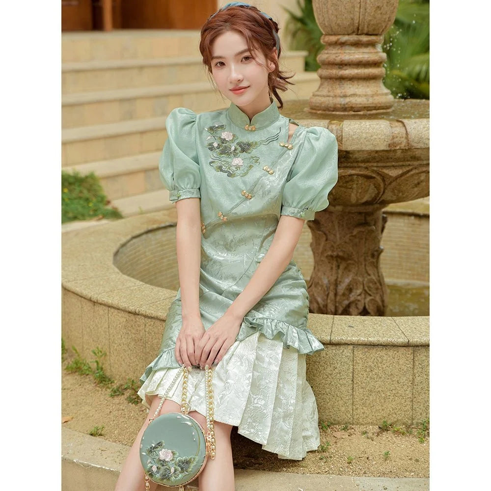 Purpdrank Double Layer Bubble Sleeved Improved Cheongsam New Modern Chinese Style Slim Dress Elegant Embroidery Traditional Qipao