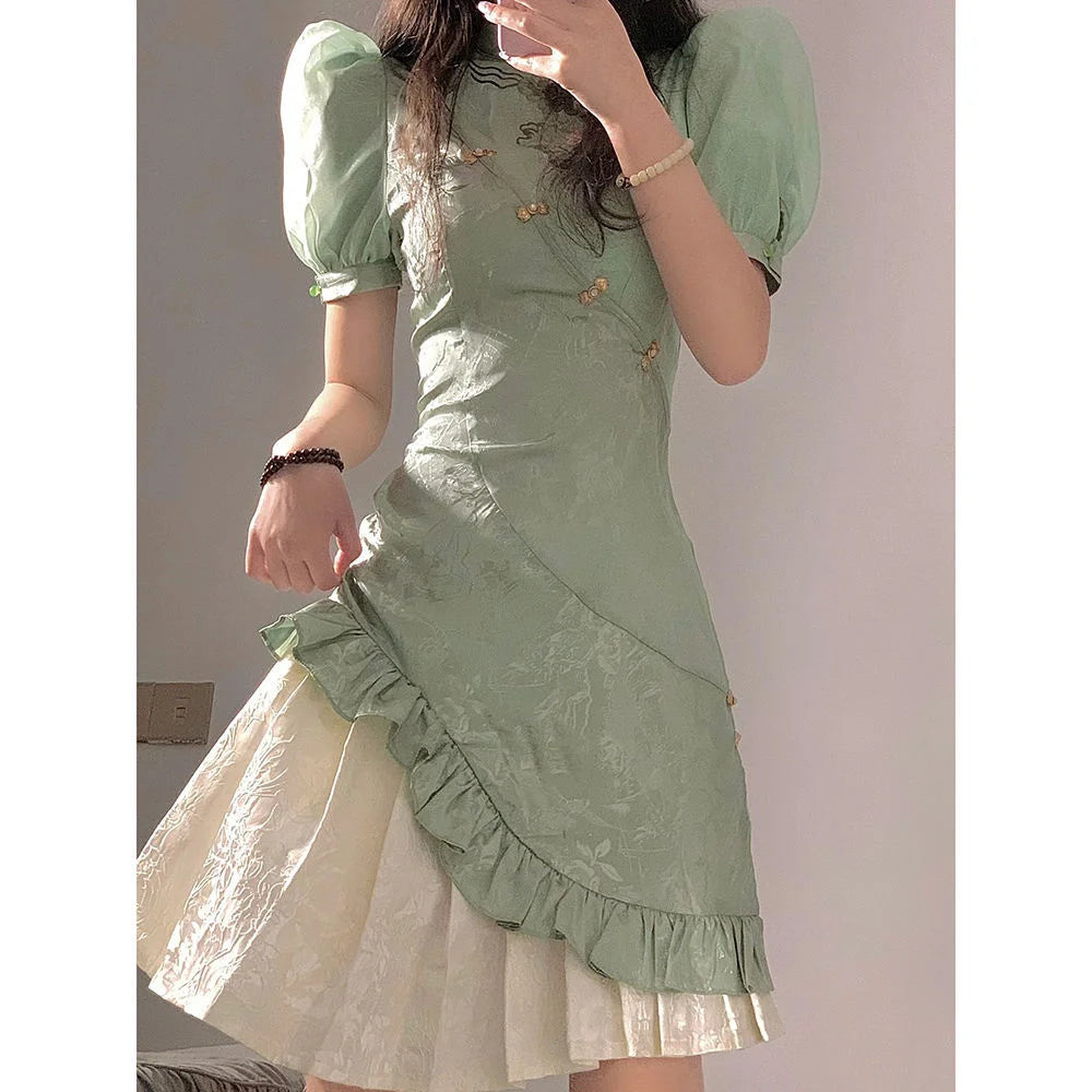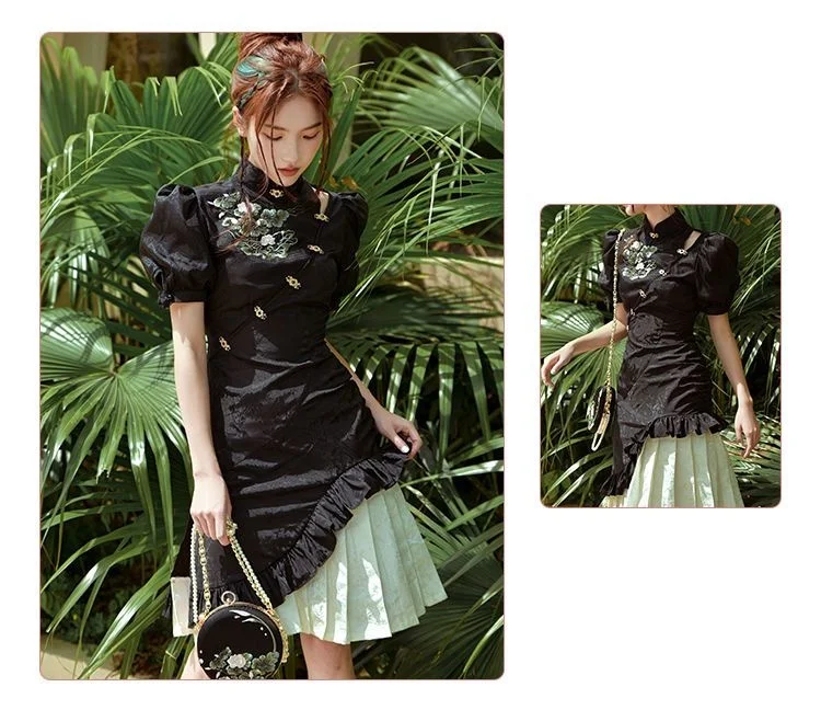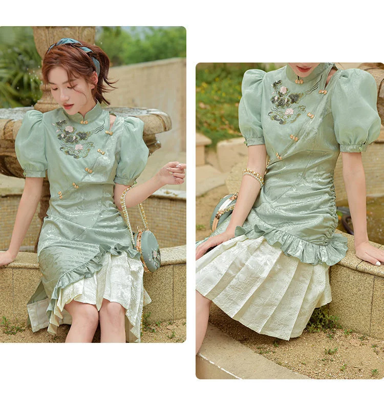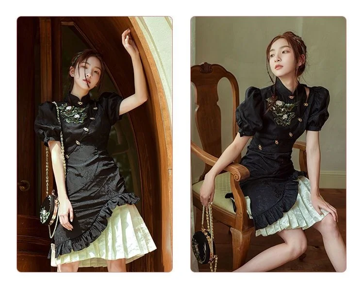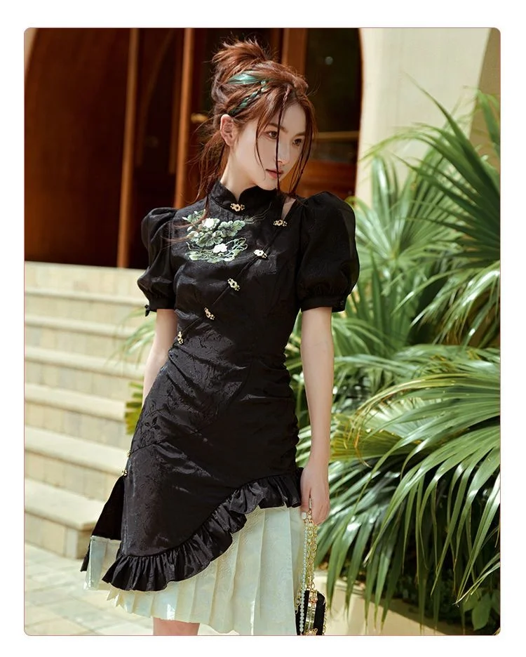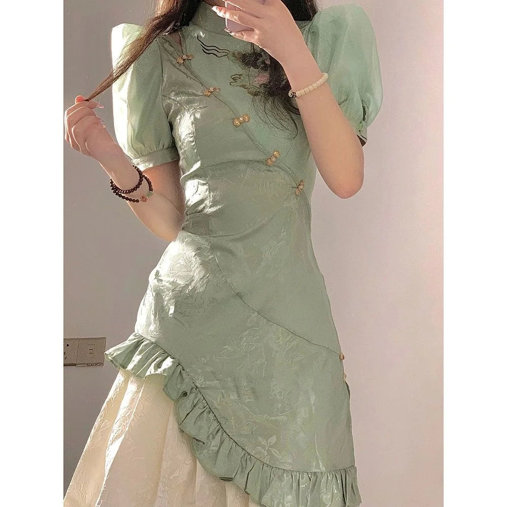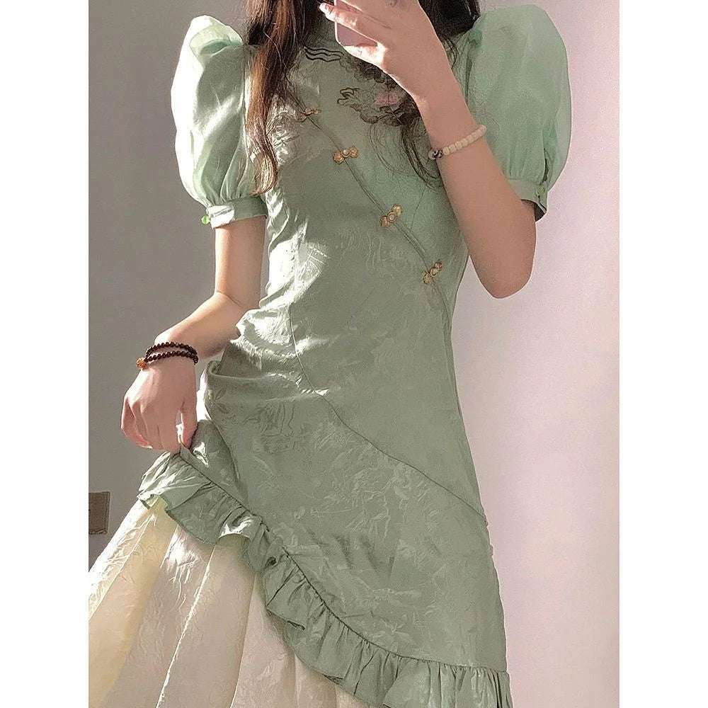 Purpdrank Double Layer Bubble Sleeved Improved Cheongsam New Modern Chinese Style Slim Dress Elegant Embroidery Traditional Qipao