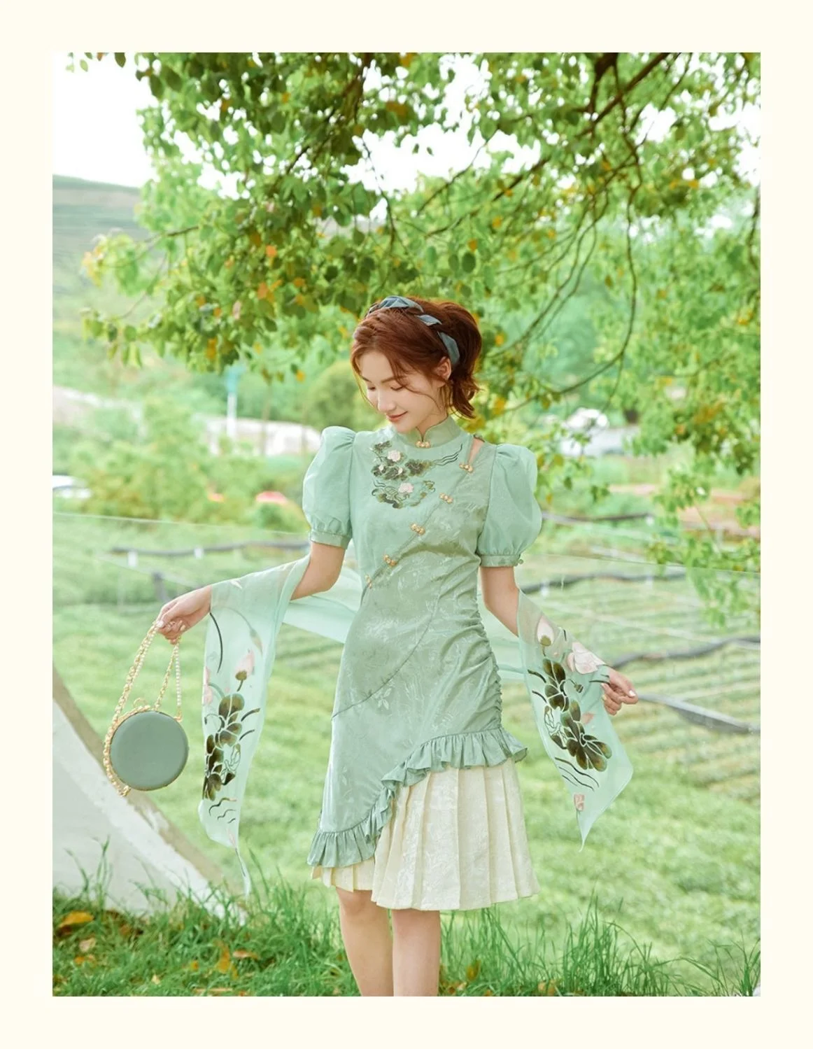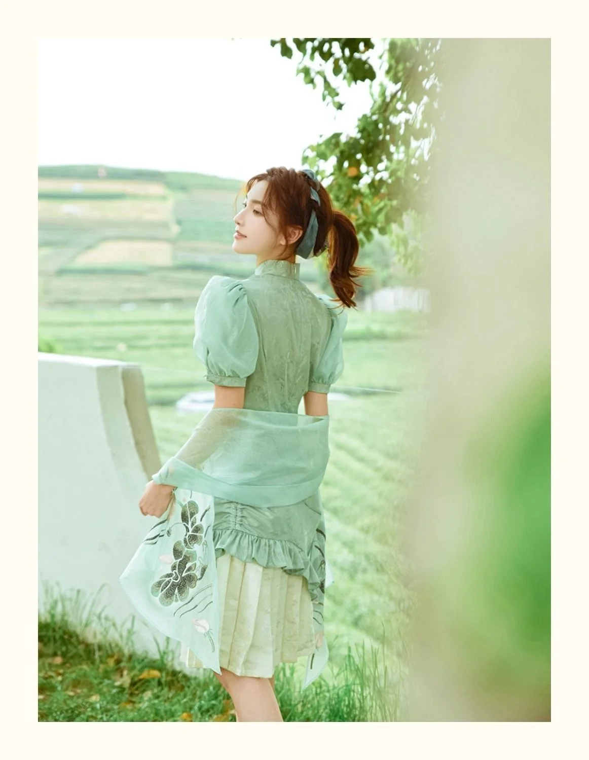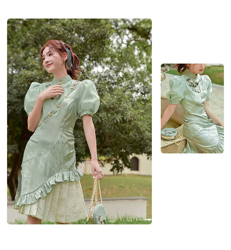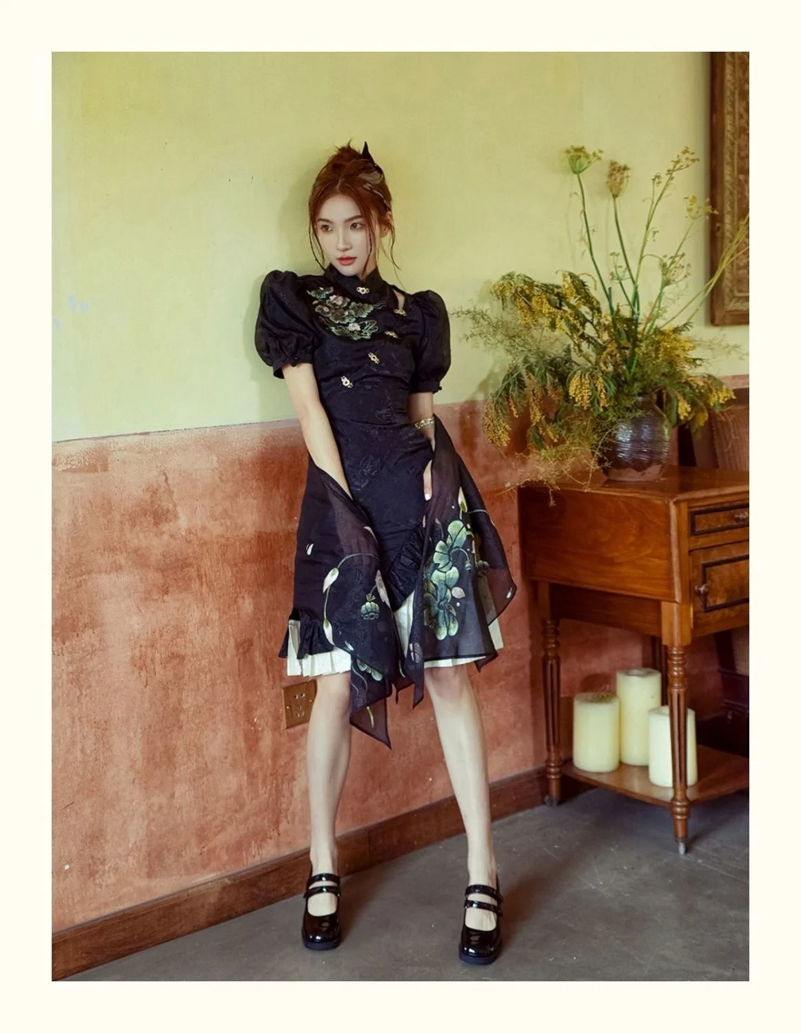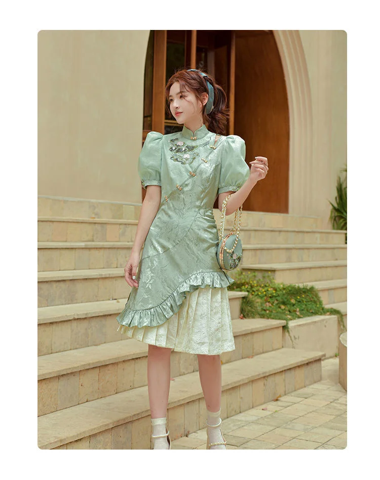 Purpdrank Double Layer Bubble Sleeved Improved Cheongsam New Modern Chinese Style Slim Dress Elegant Embroidery Traditional Qipao