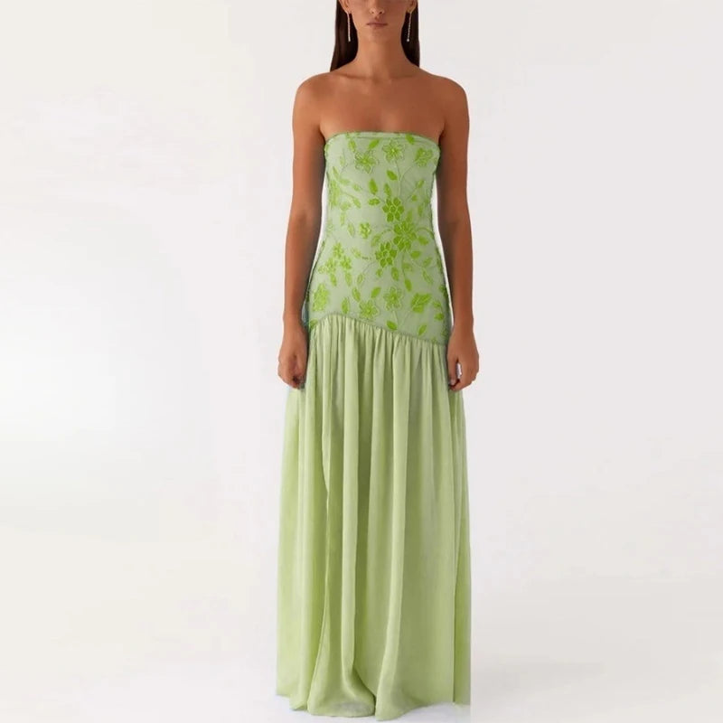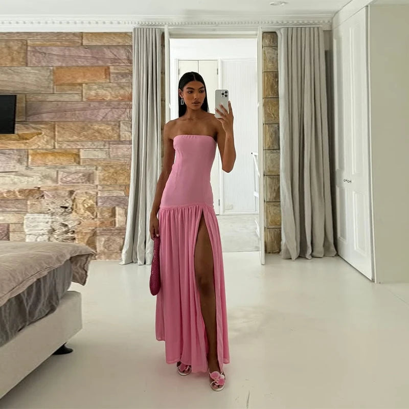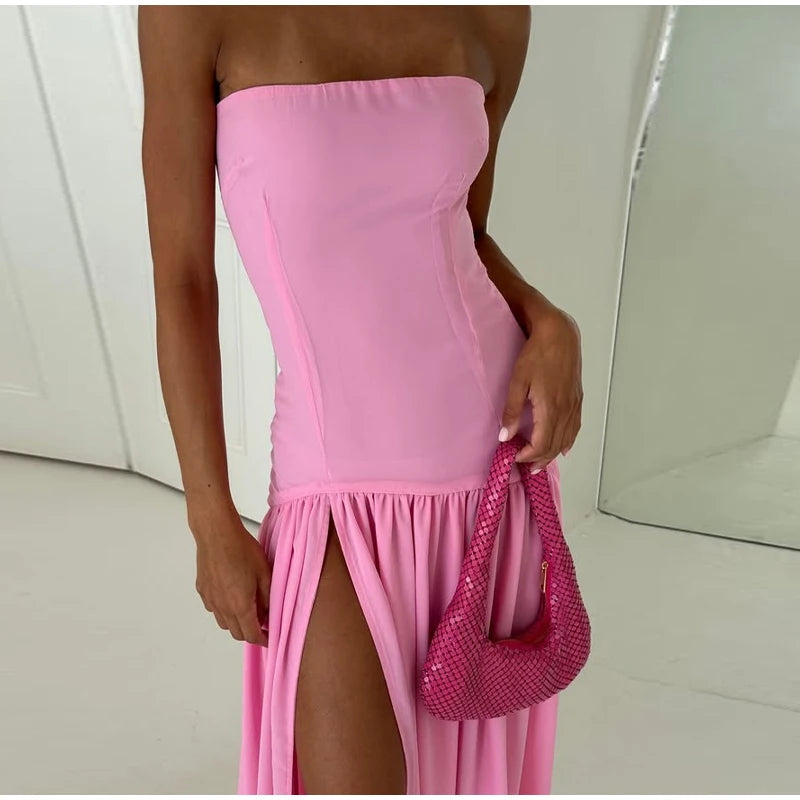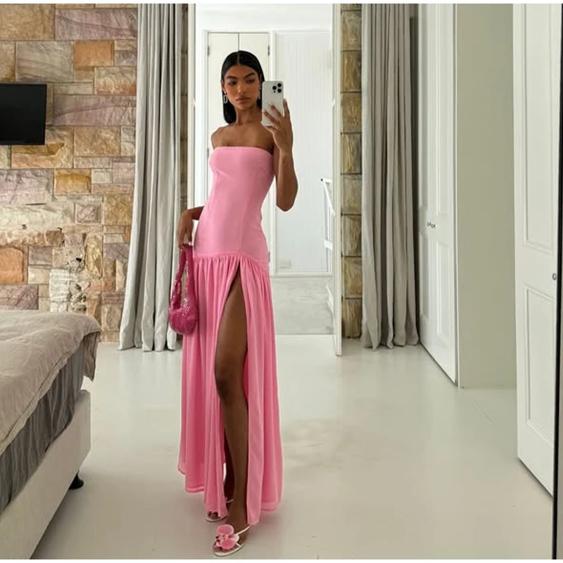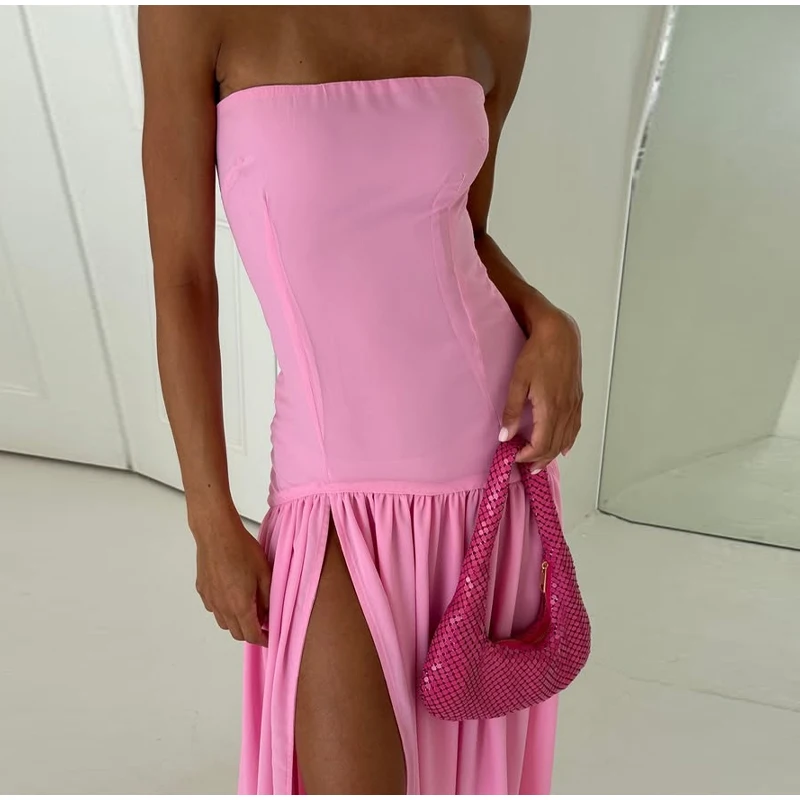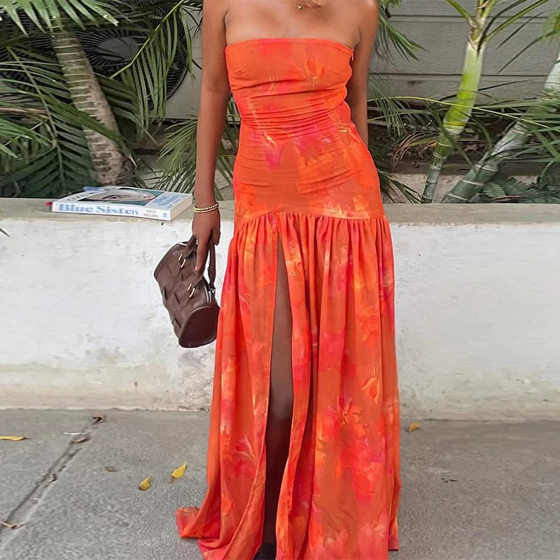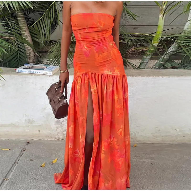 Purpdrank Elegant Strapless Print Long Dress Women Off Shoulder Sleeveless Split Vestidos Female 2025 Summer Fashion Chic A Line Robe