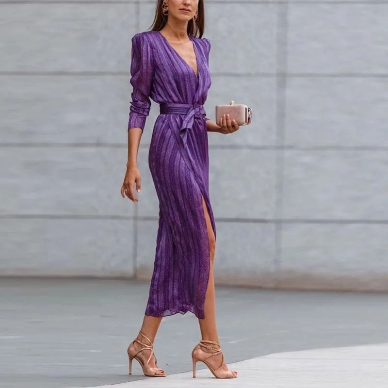 Purpdrank Elegant V Neck Lace-up Belted Party Dress Women Spring Striped Print Split Irregular Dress Autumn Long Sleeve Office Lady Dress