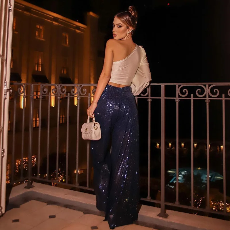 Purpdrank Elegant Women Sequins Loose Pants Sexy Chic High Waist Glitter Wide Leg Trousers Sparkle Outfits Streetwear Night Clubwear