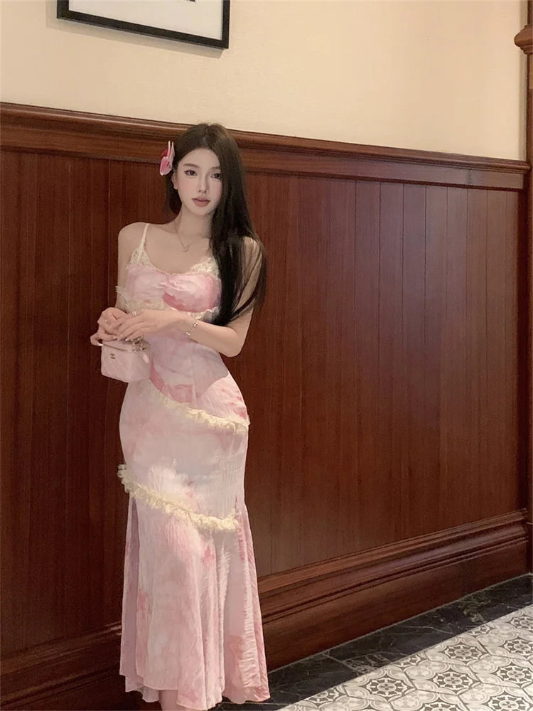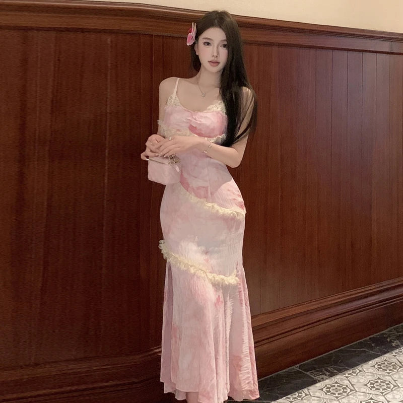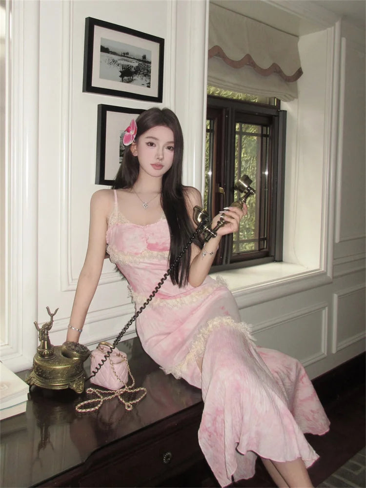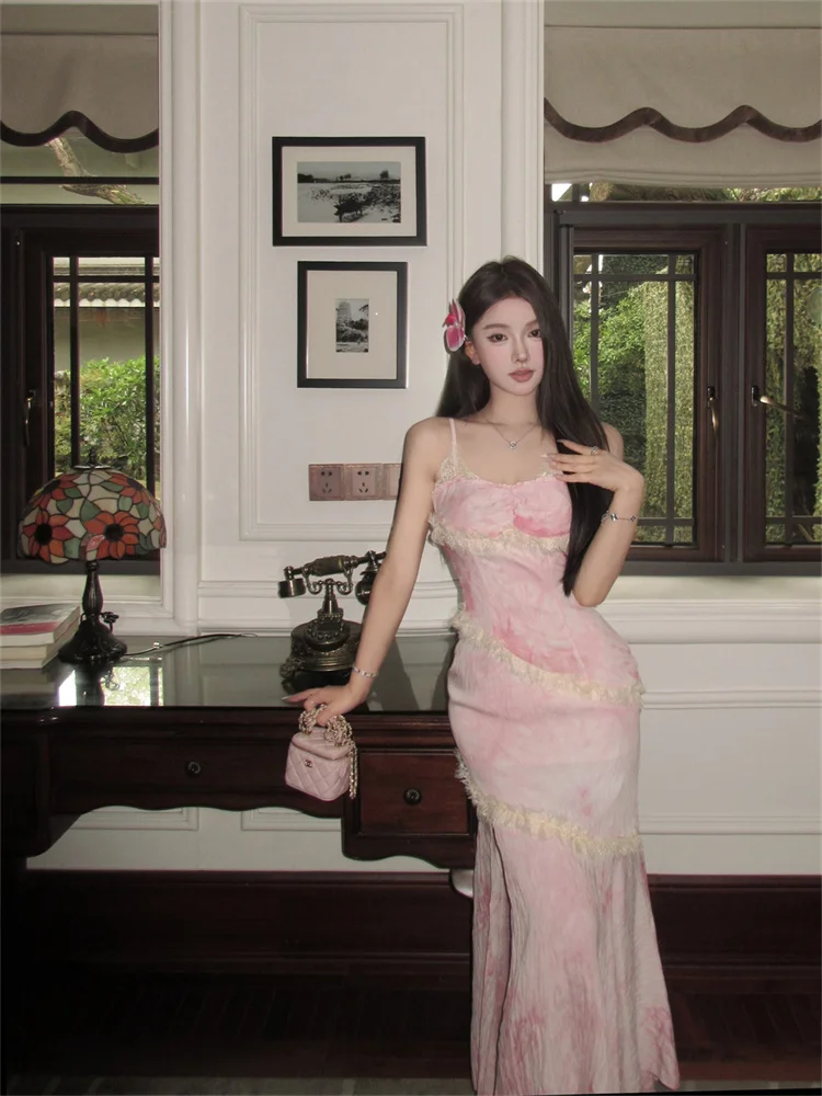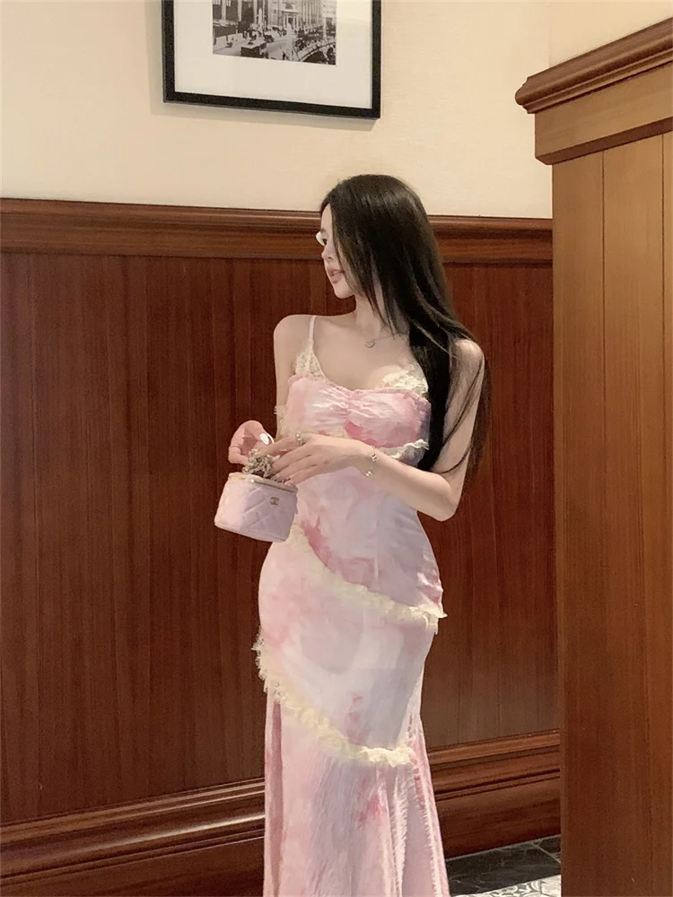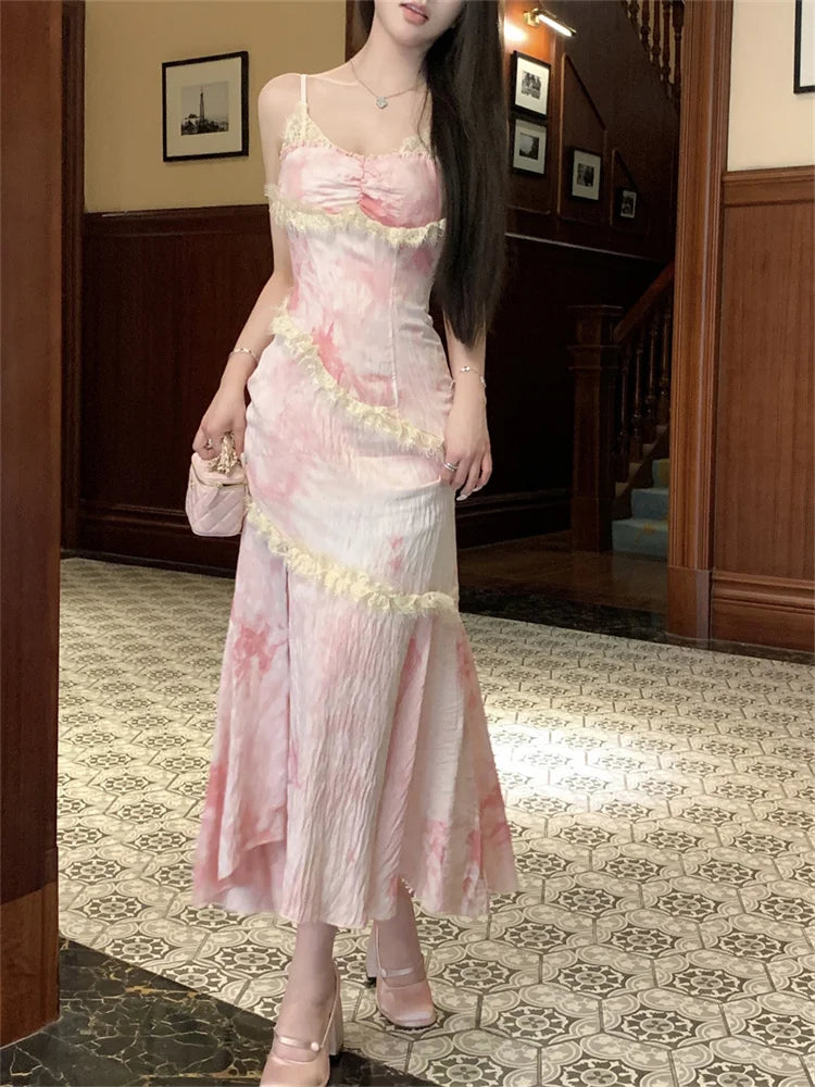 Purpdrank Fairy Summer Pink Dress Sexy Splicing Lace Flounced Sling Dress Fashion Irregular Mid Length Dresses Women Birthday Clothing