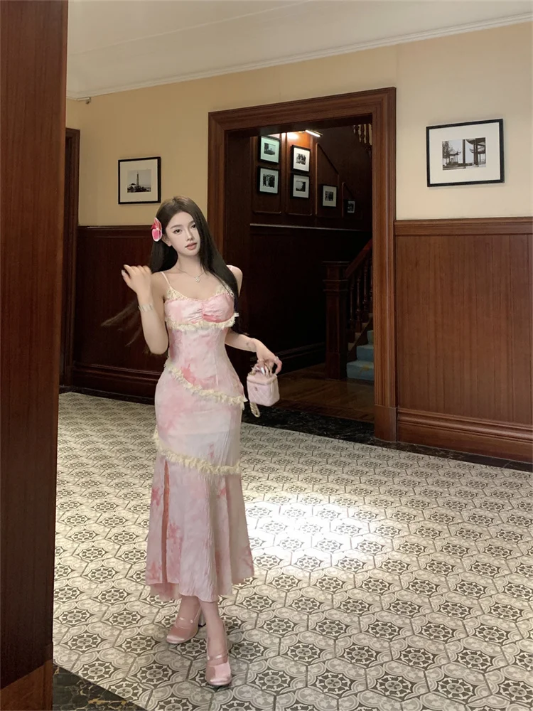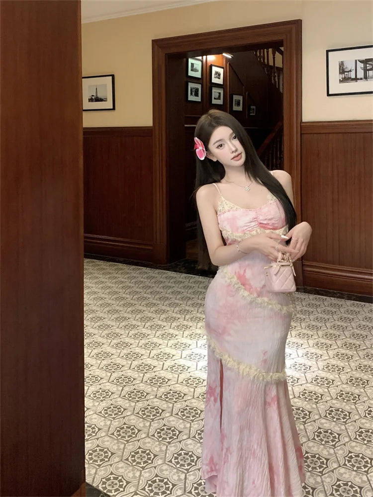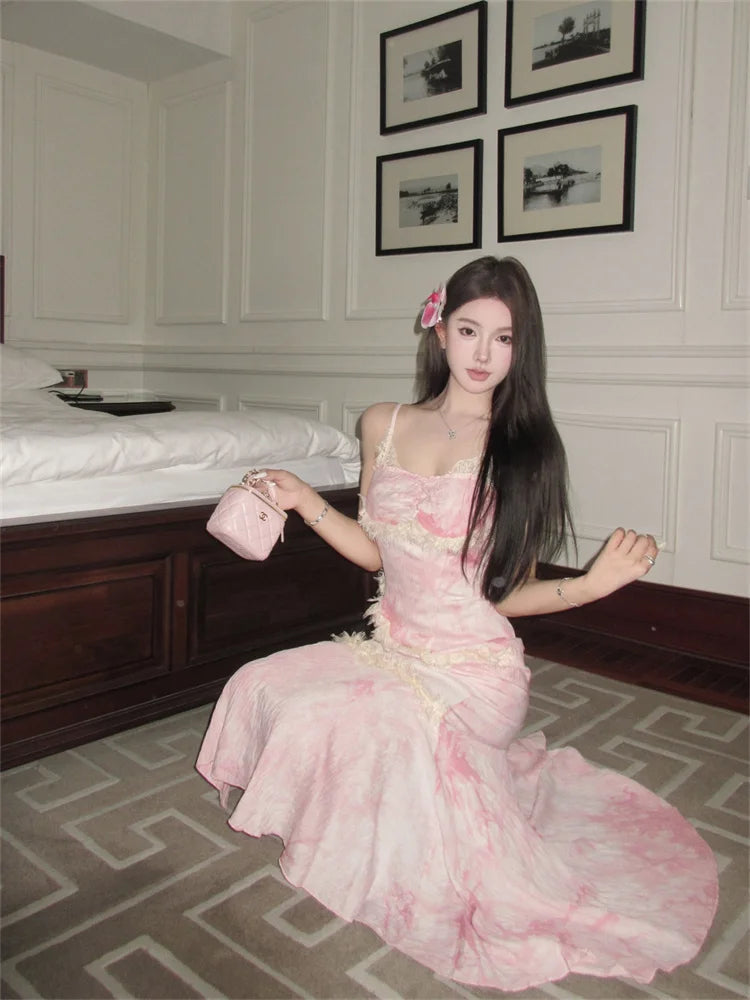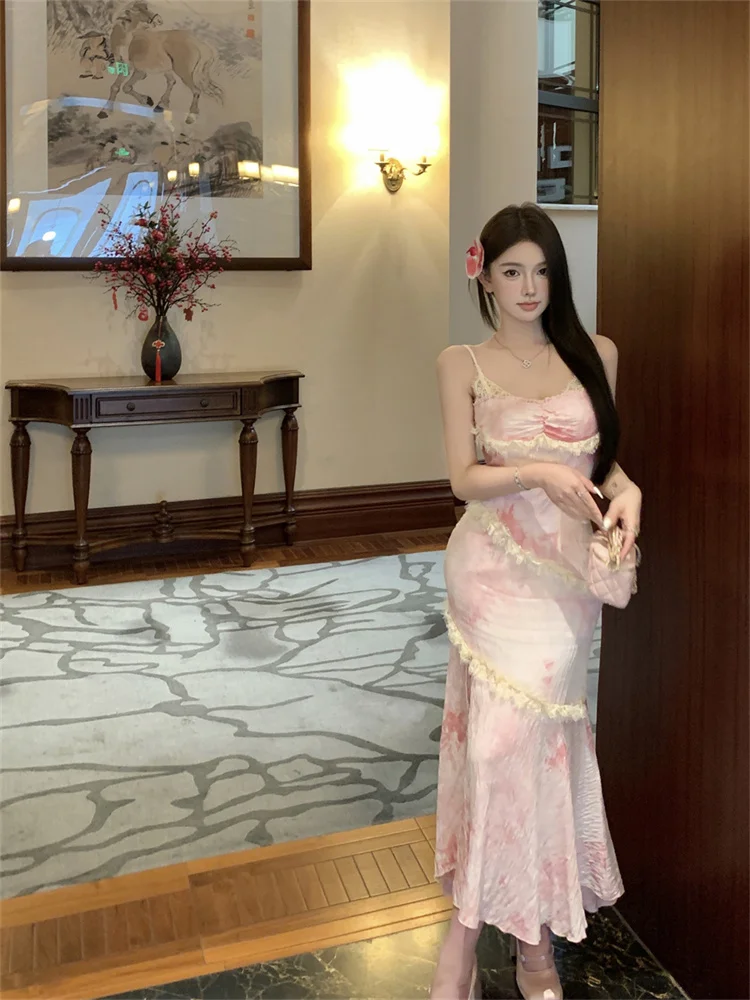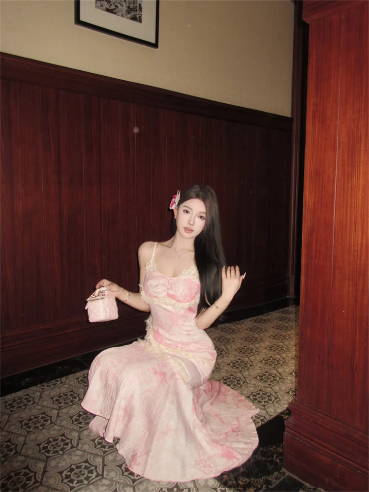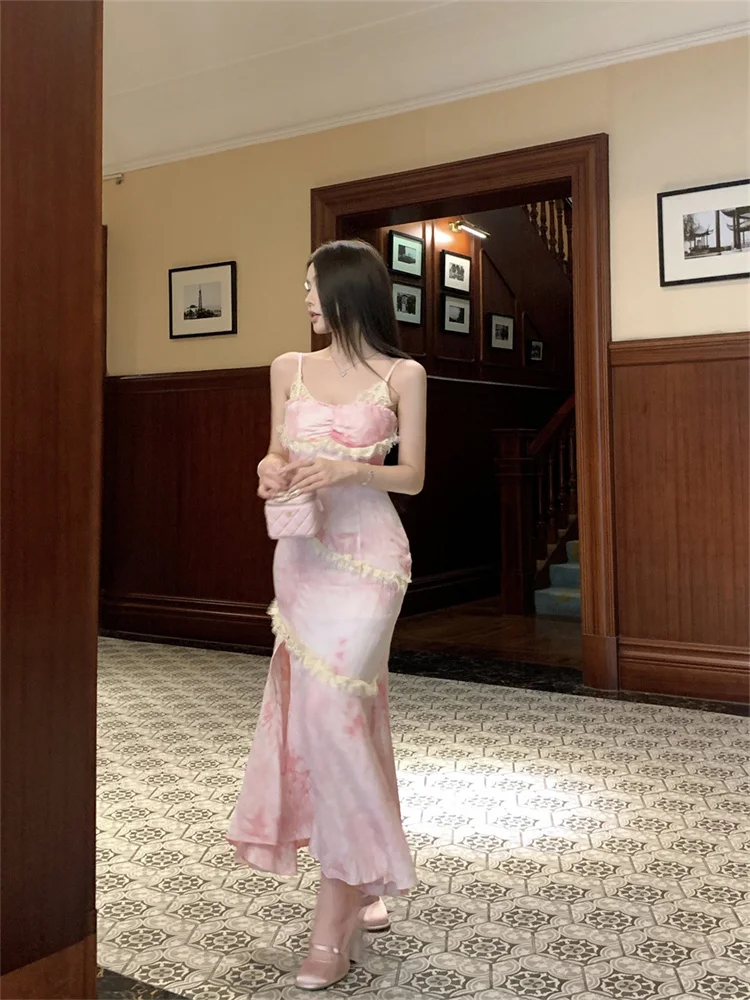 Purpdrank Fairy Summer Pink Dress Sexy Splicing Lace Flounced Sling Dress Fashion Irregular Mid Length Dresses Women Birthday Clothing