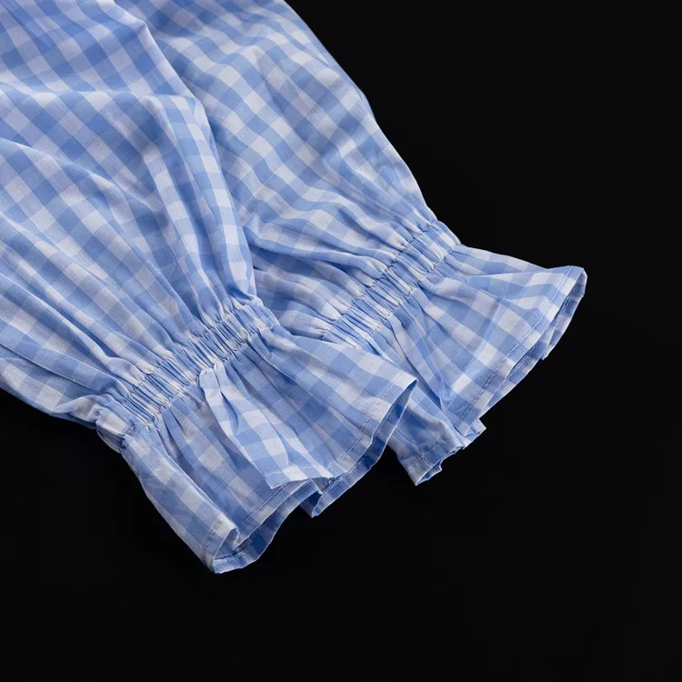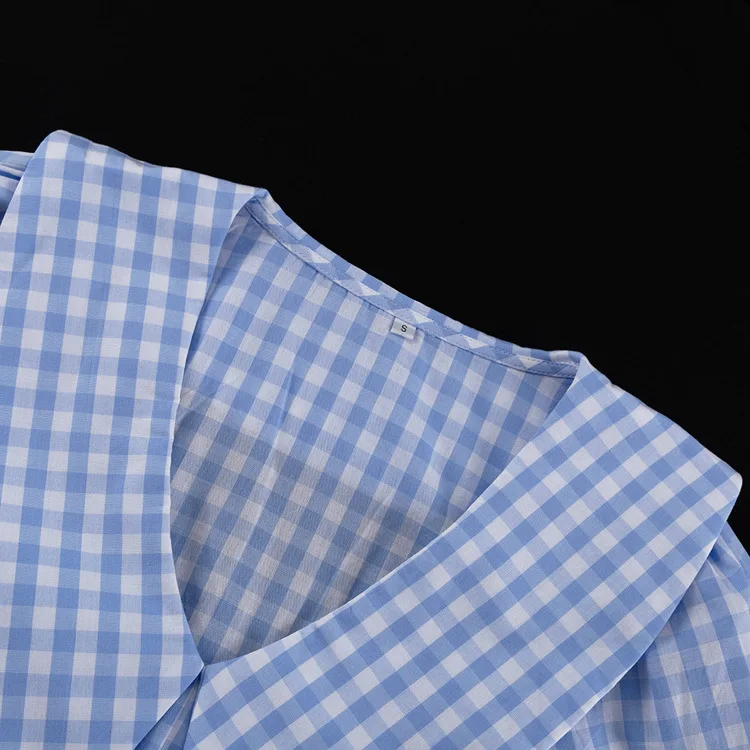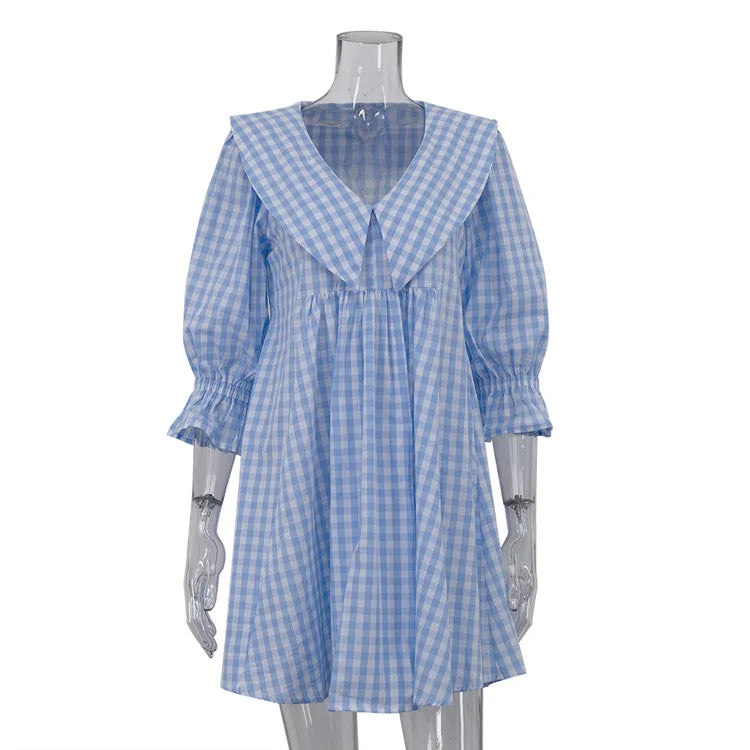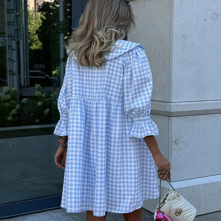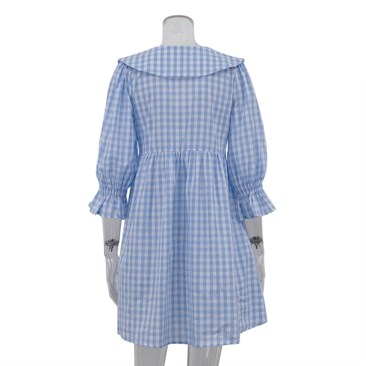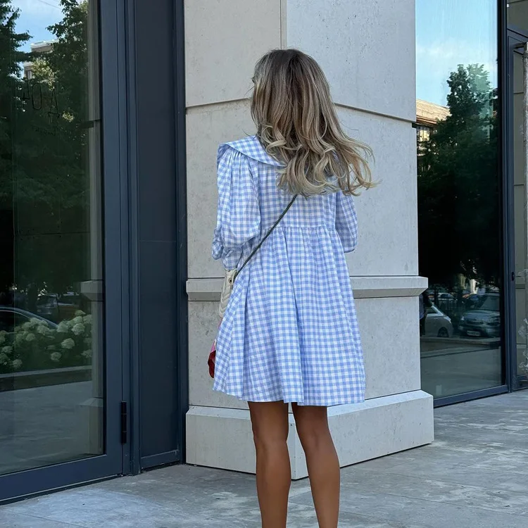 Purpdrank Fashion Cotton Blue Plaid Dress Casual Lapel Long Sleeve Mini Dresses Elegant Holiday Boho Dress Women Vestidos
