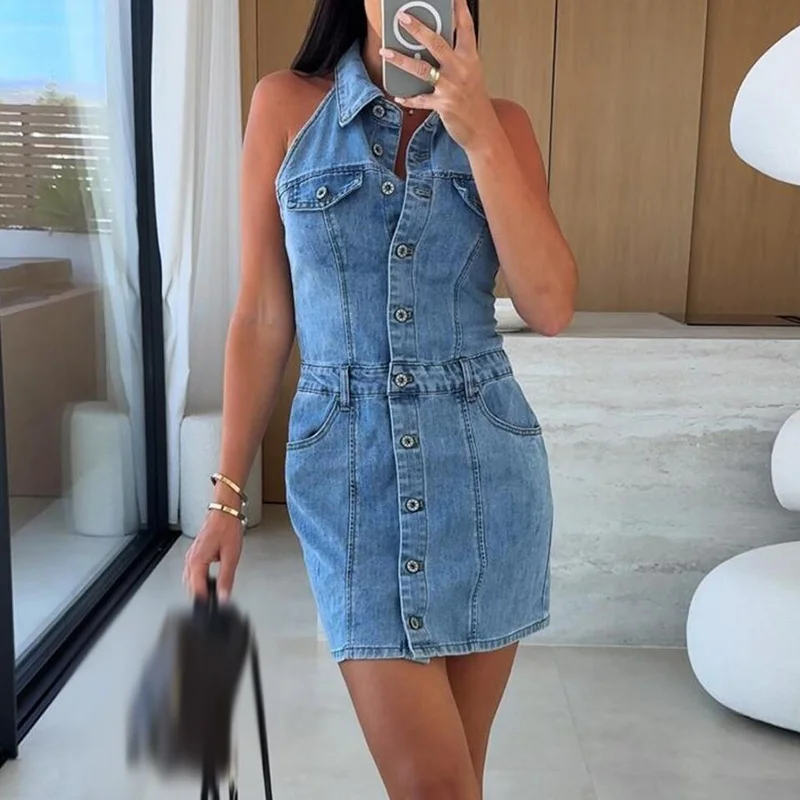 Purpdrank Fashion Lapel Sleeveless Denim Dress Women Elegant Single Breasted Slim Mini Dress Casual Pocket High Waist Solid Party Dresses
