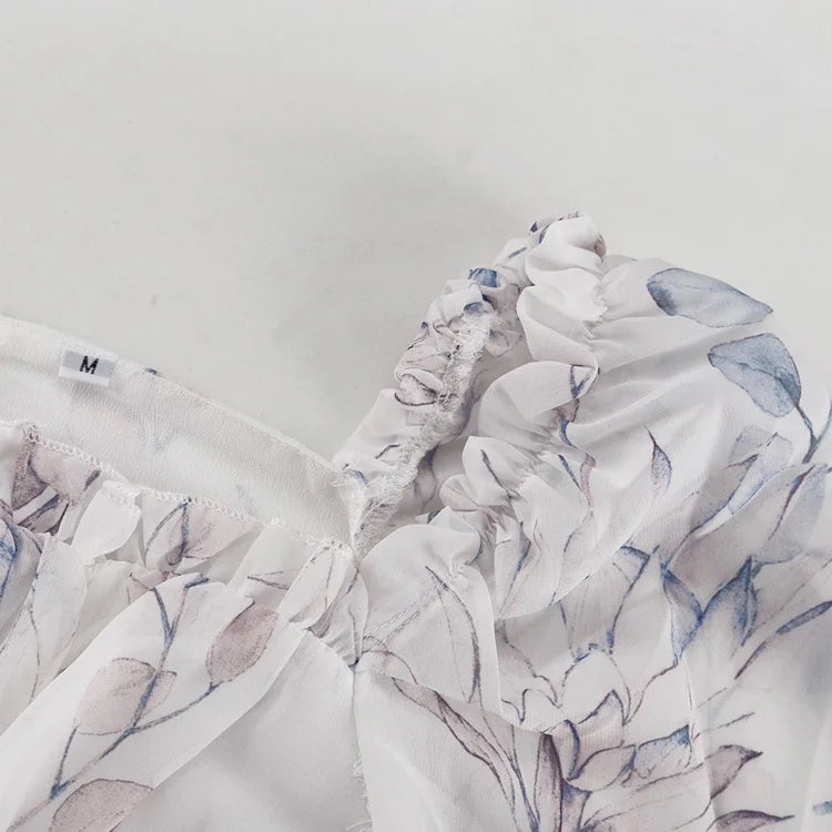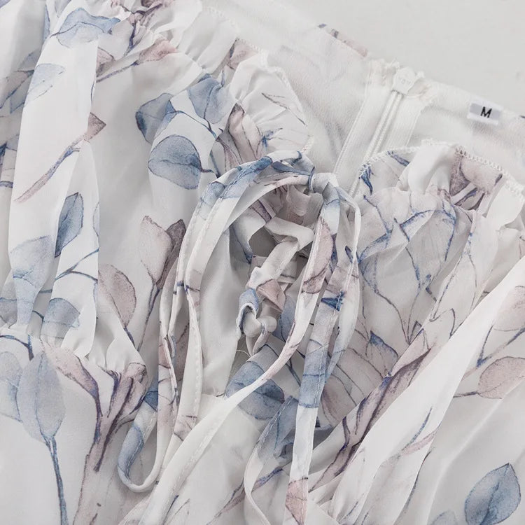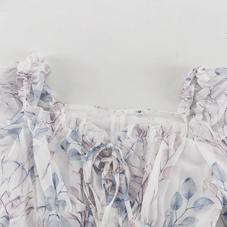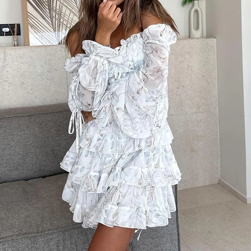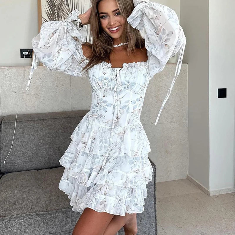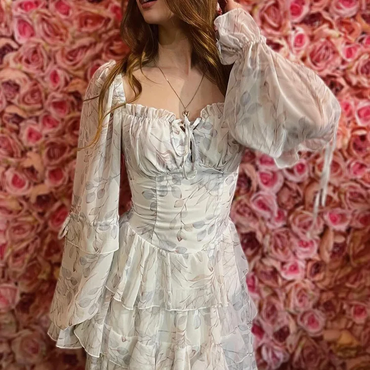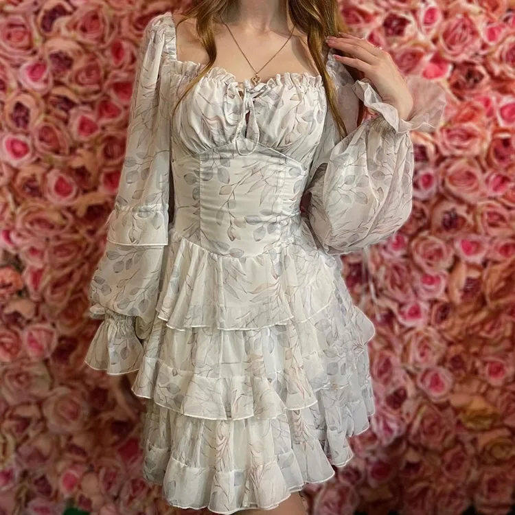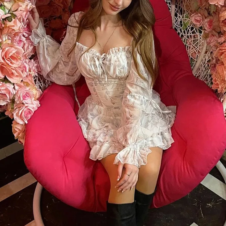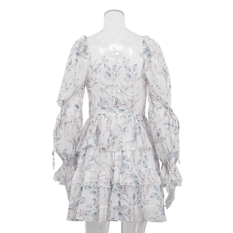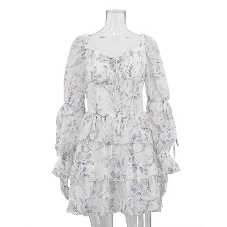 Purpdrank Fashion Printing Lace Up Tierred Dresses Spring Women Square Collar Long Sleeved Short Dress Autumn High Waist Slim Mini Dress