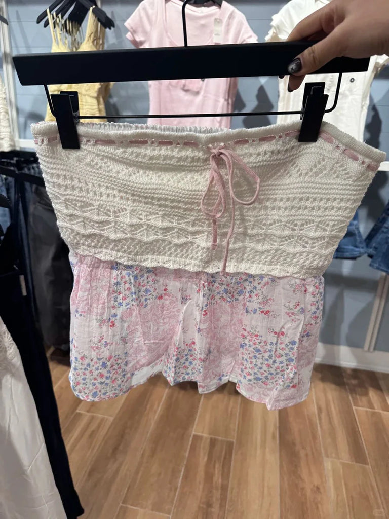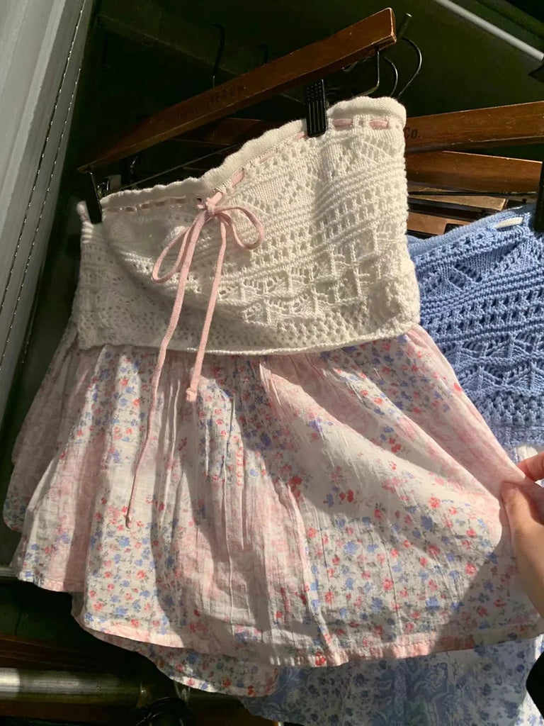 Purpdrank Floral Crochet Patchwork Tank Tops Women Summer Lace-up Bow Sleeveless Slim Tube Top Preppy Style Sweet Cropped Camisole New