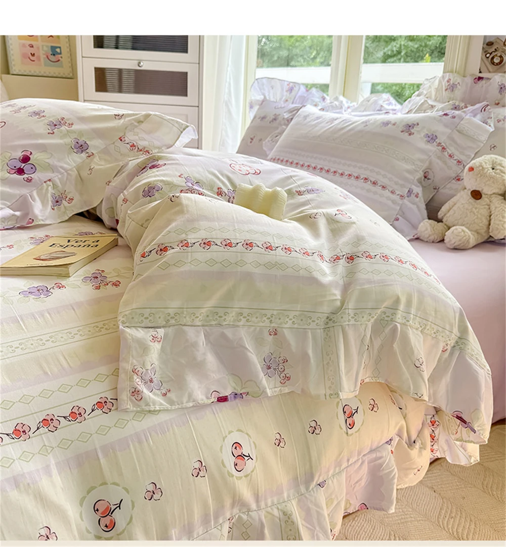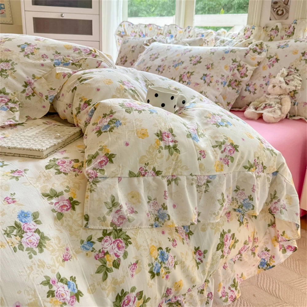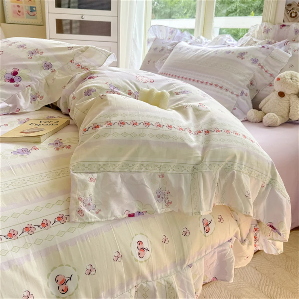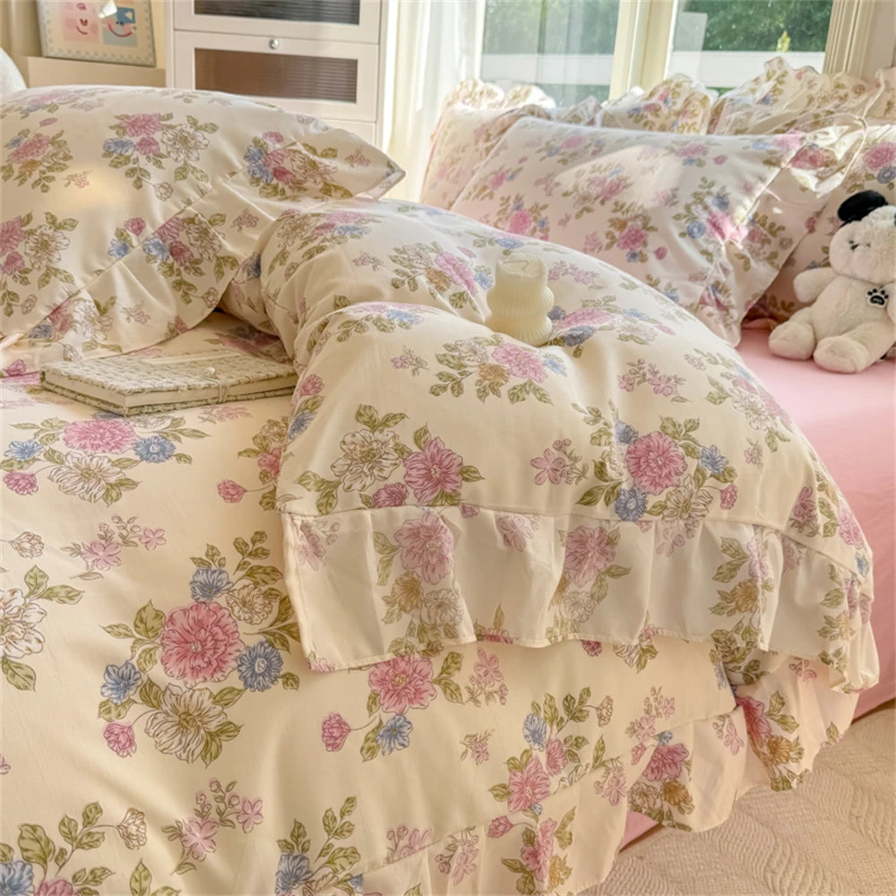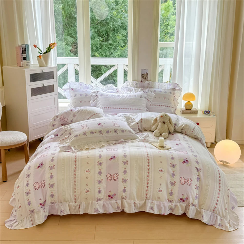 Purpdrank Flower Skin-friendly Washed Cotton Bedding Set Duvet Cover Set Korean Lace Ruffles Quilt Cover Soft Cover Bed Linen Pillowcases