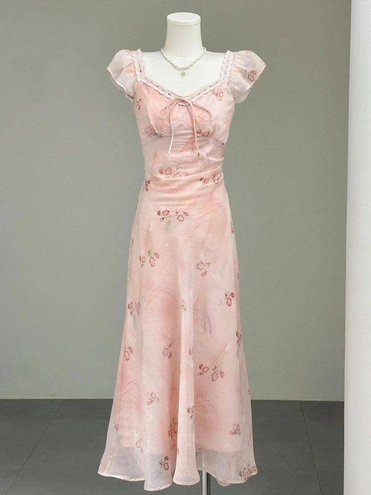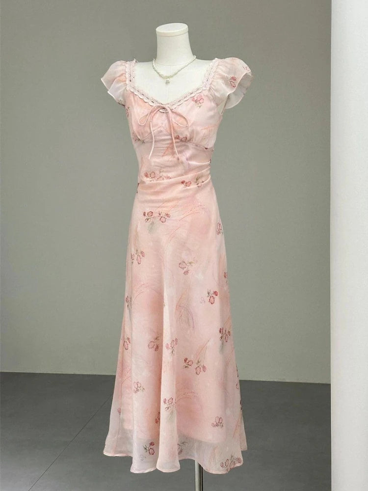 Purpdrank French Holiday Style Sweet Summer Dresses Women New Fashion Floral Pink Chic Long Dress Female Elegant Korean Popular Clothes