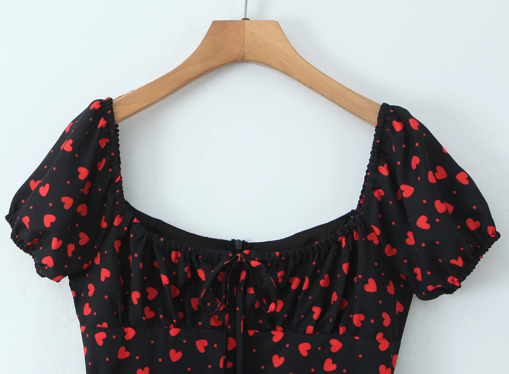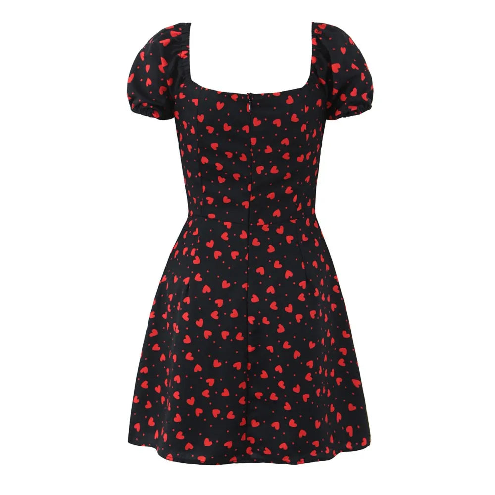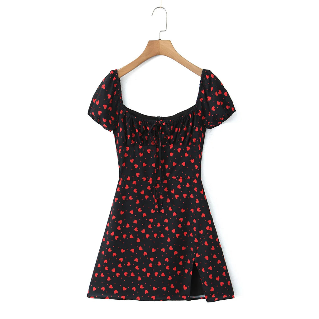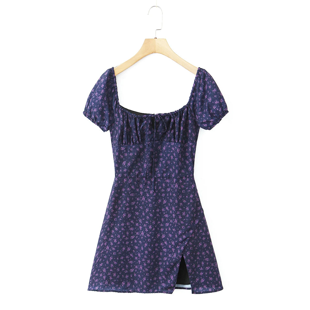 Purpdrank French Retro Black Print Bow Square Collar Short Elastic Puff Dress Women Zipper Back Slim Waist Slit Hem Mini Dresses Robe Blue