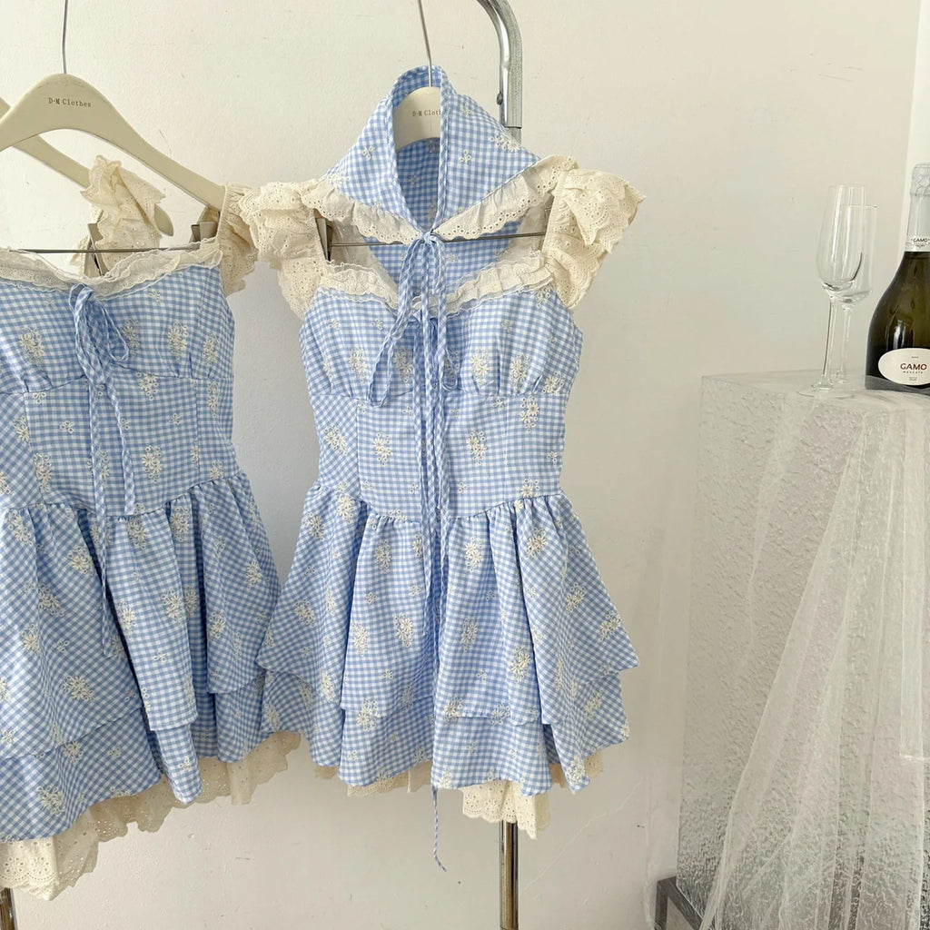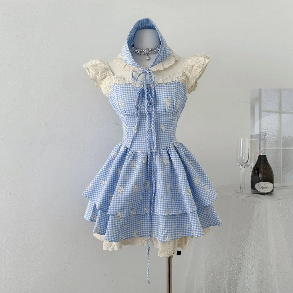 Purpdrank French Sweet Vintage Women Dress Lolita Kawaii Lace Flying Sleeve Slim Mini Dress Fairy Elegant Harajuku Y2k Chic Outfits Summer