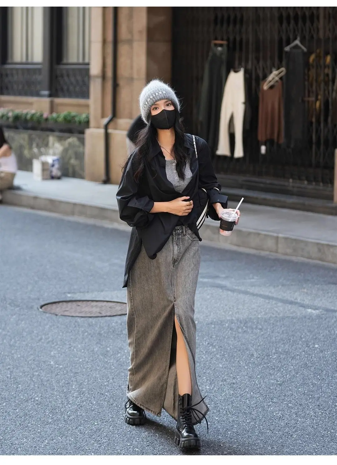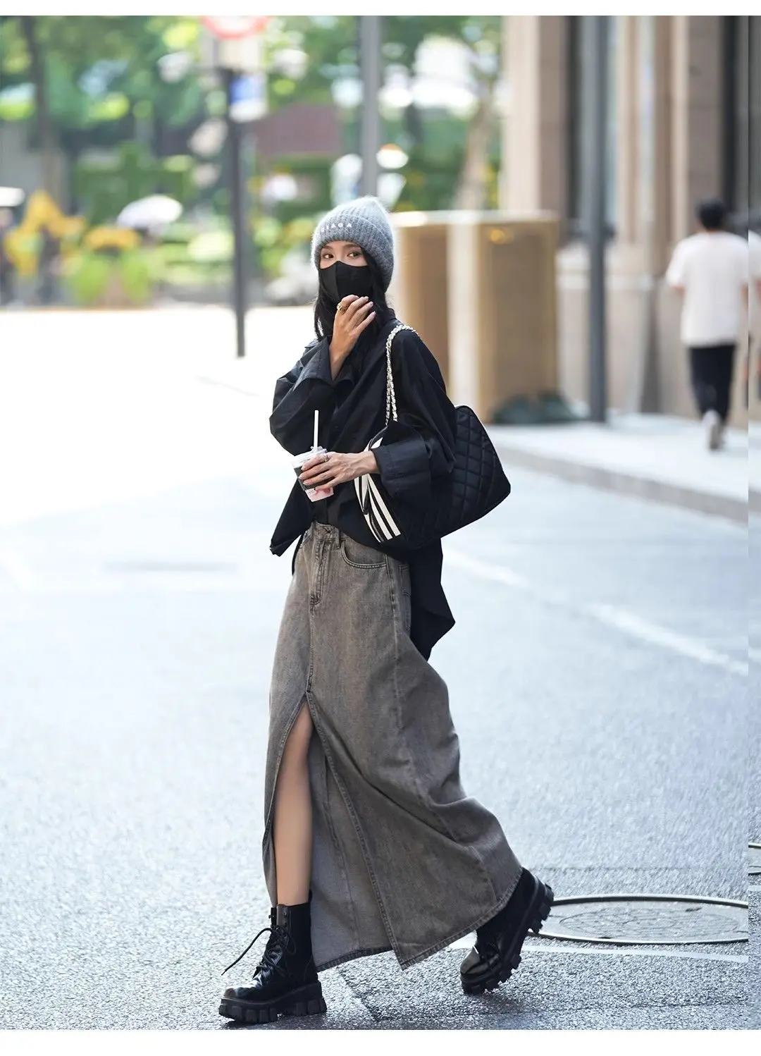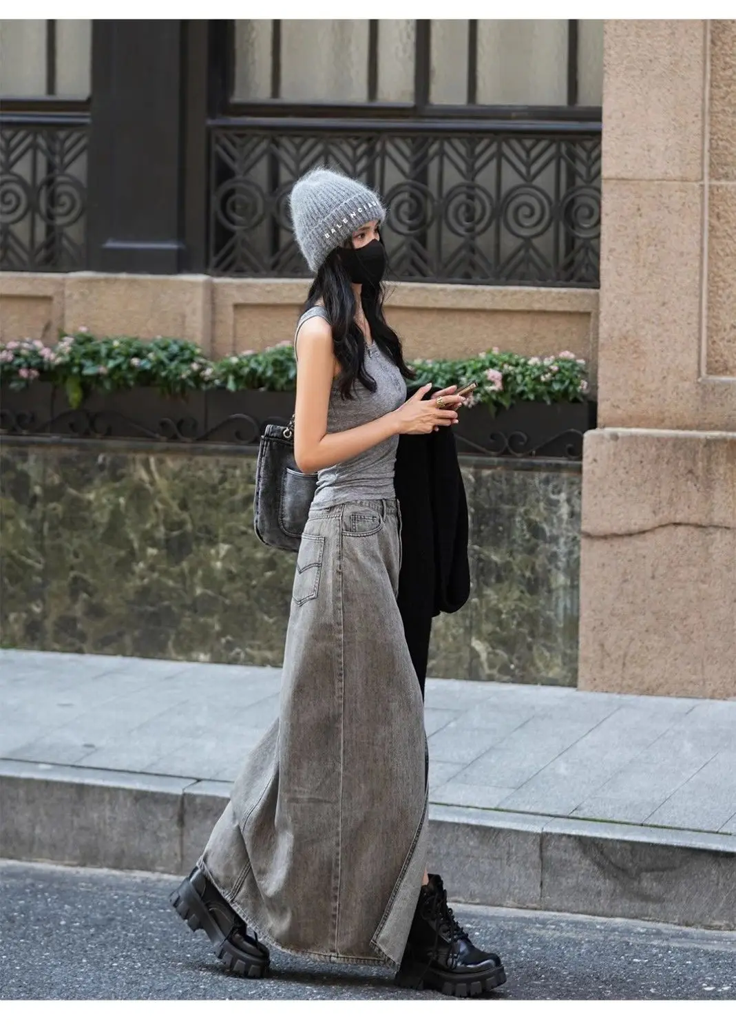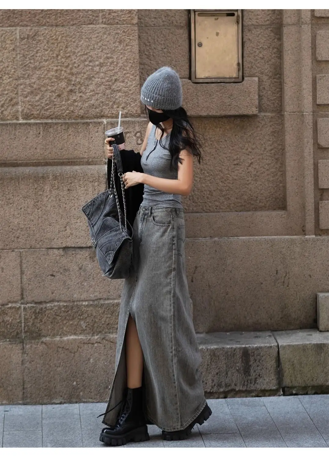 Purpdrank Grey Split Denim Skirt Female 2025 Spring High Waist Slim Casual Fashion Women's Long Skirt