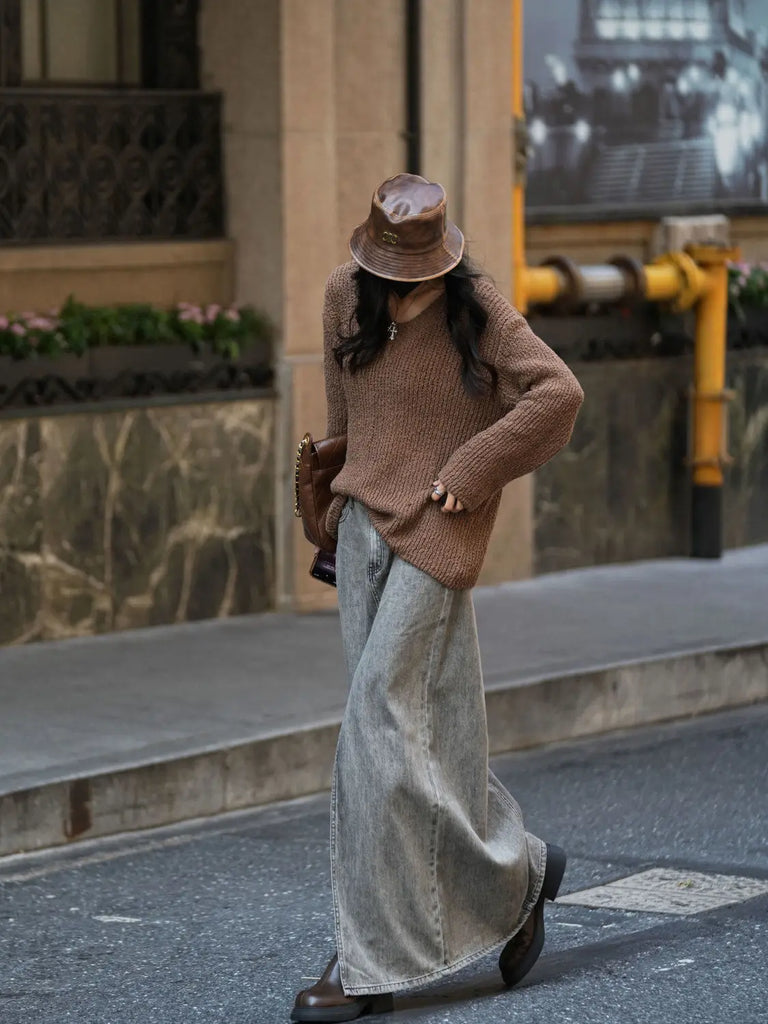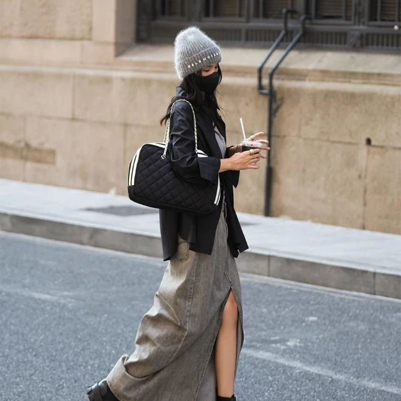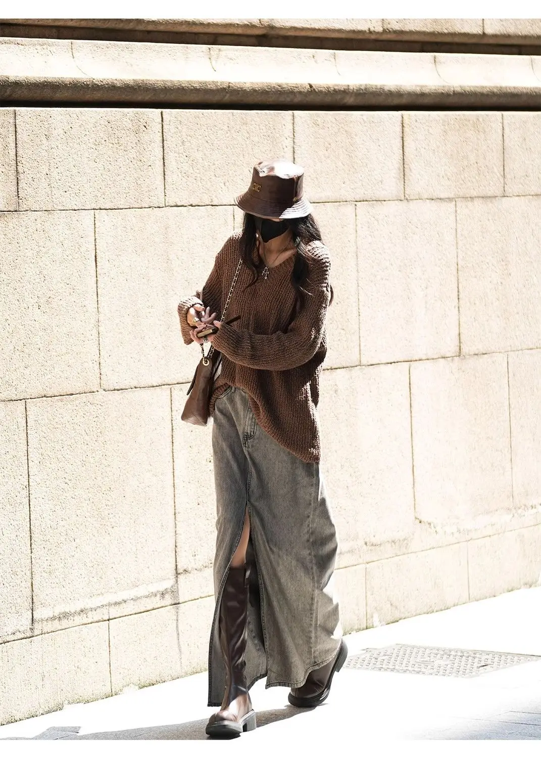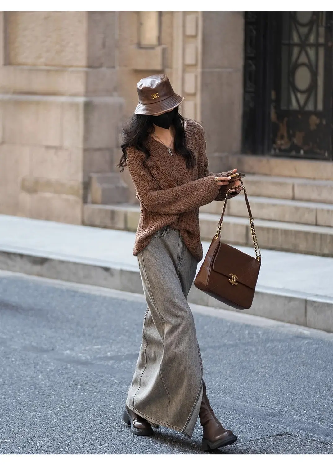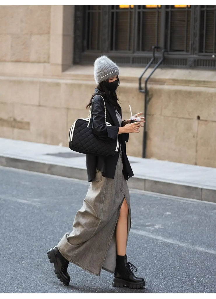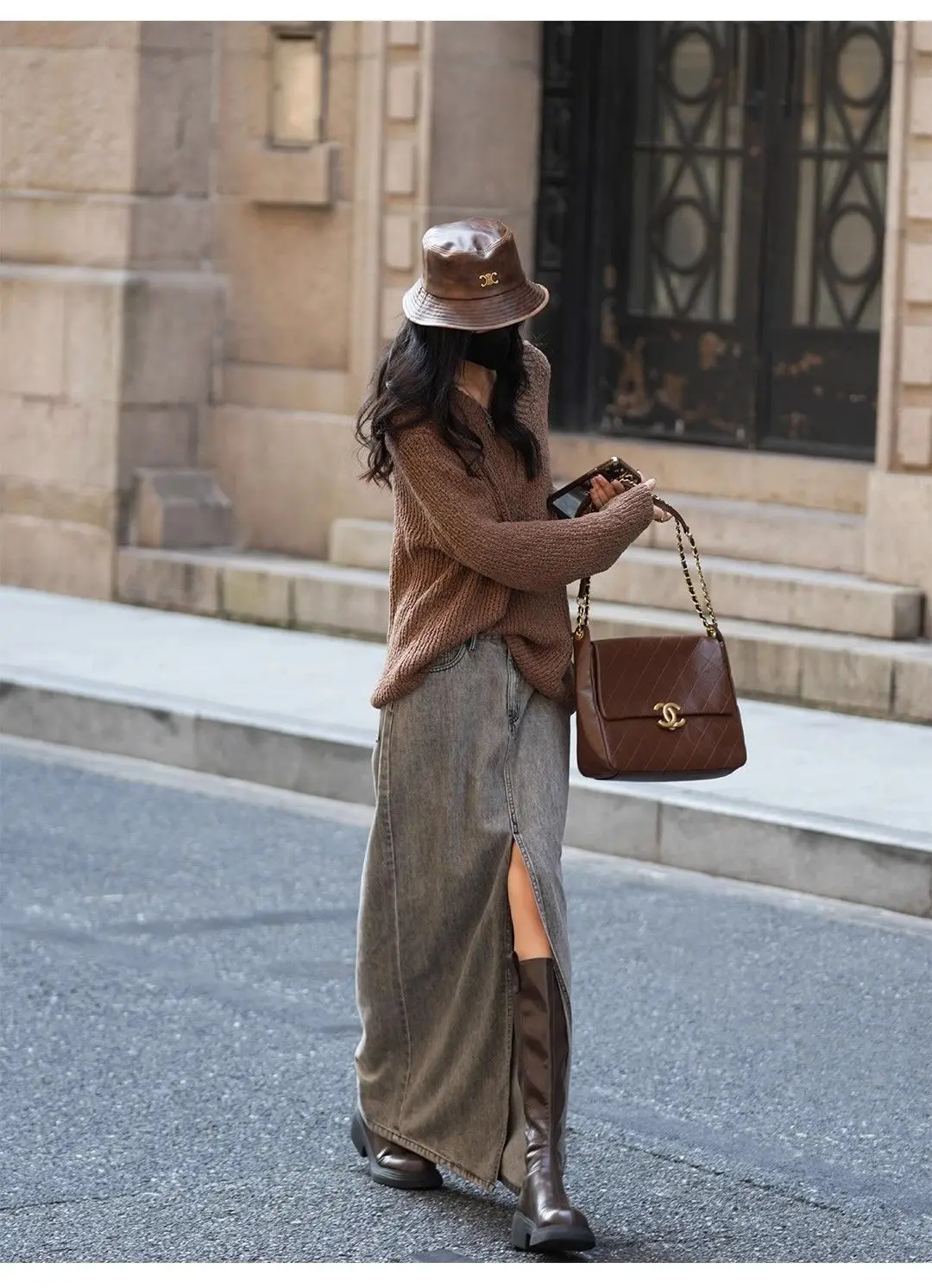 Purpdrank Grey Split Denim Skirt Female 2025 Spring High Waist Slim Casual Fashion Women's Long Skirt