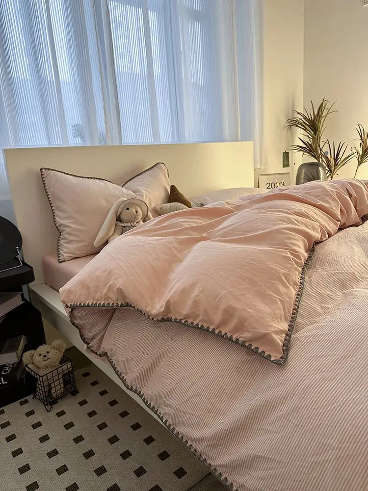 Purpdrank Ins Style Solid Color Stripes Mix and Princess Style Quilt Cover Four-piece Bedding Set Washed Cotton Shell Edge Duvet Cover Set