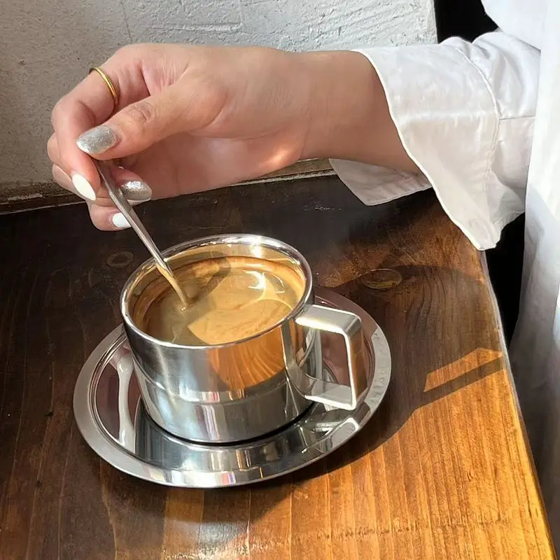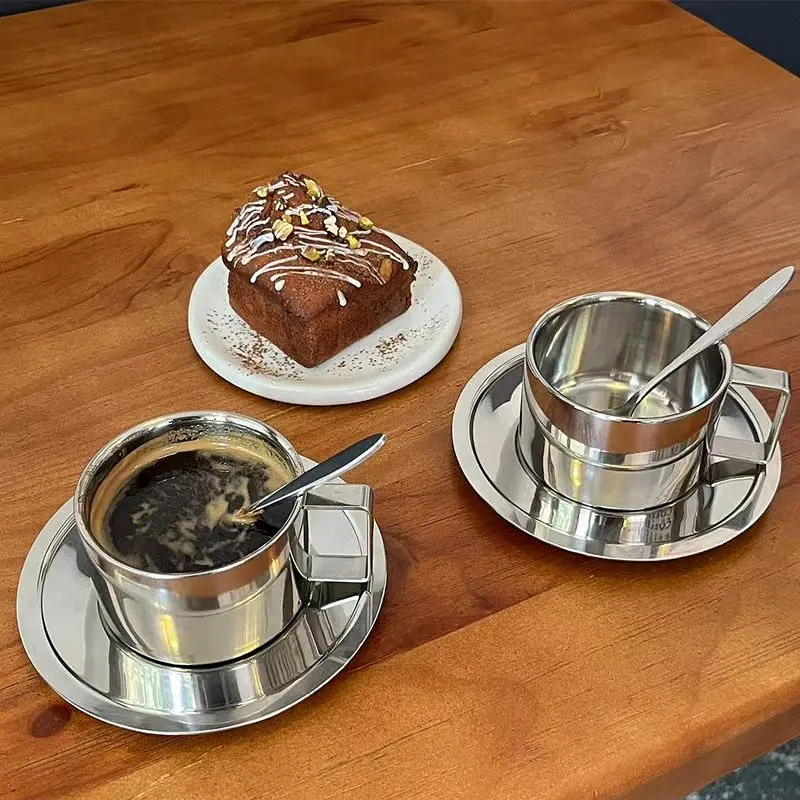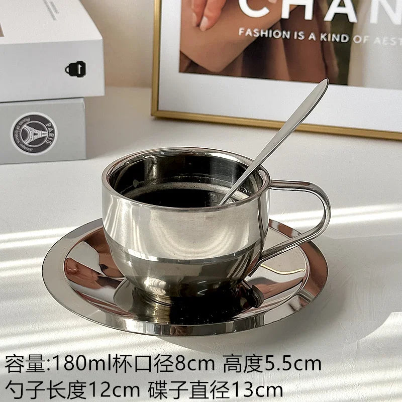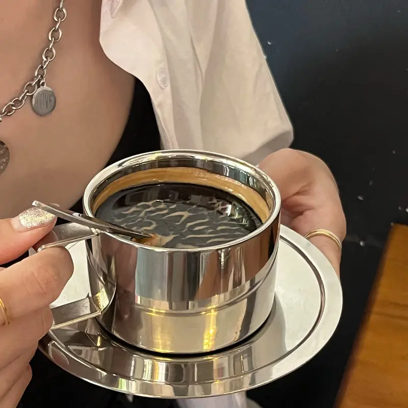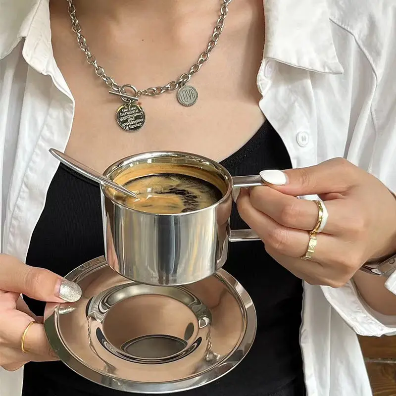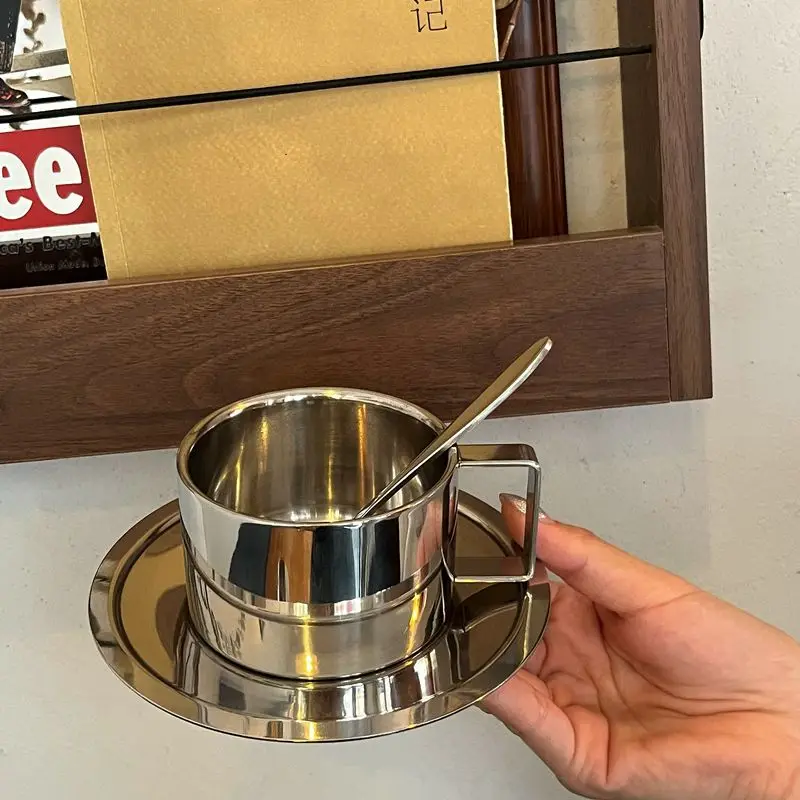Purpdrank Korean Ins Coffee Cup Set 304 Stainless Steel Insulated Coffee Cup Afternoon Tea Mug Dish Spoon Household Retro Tableware Set