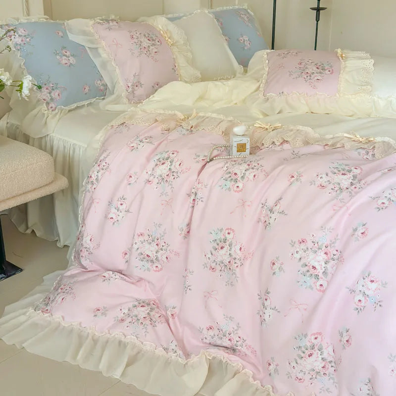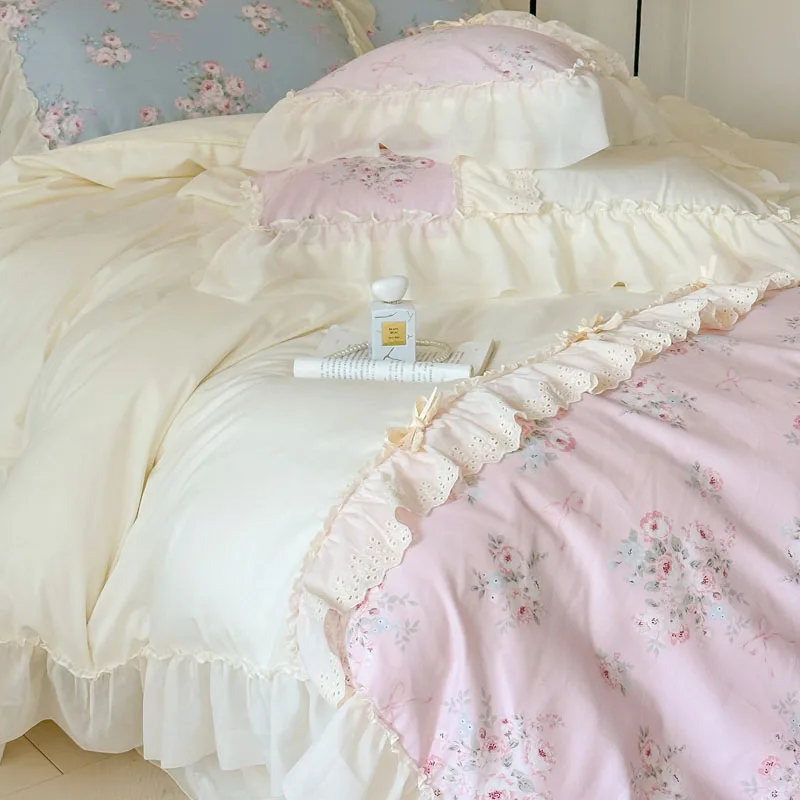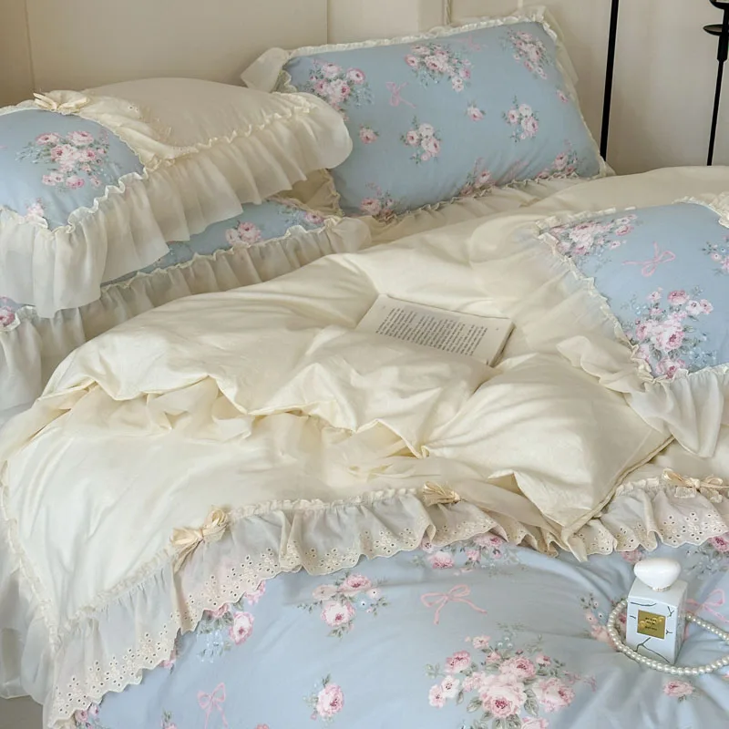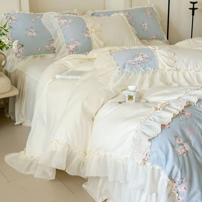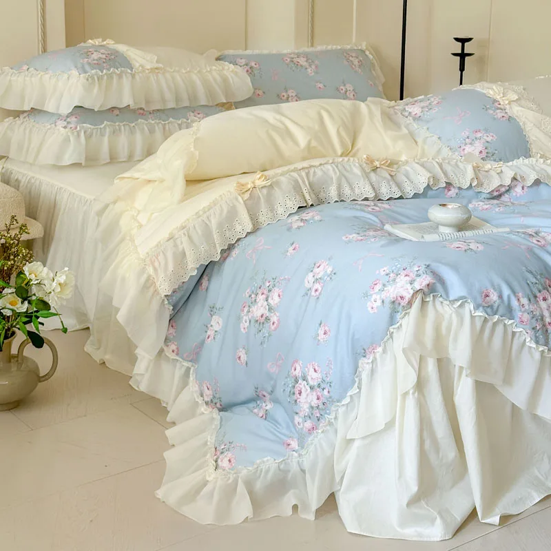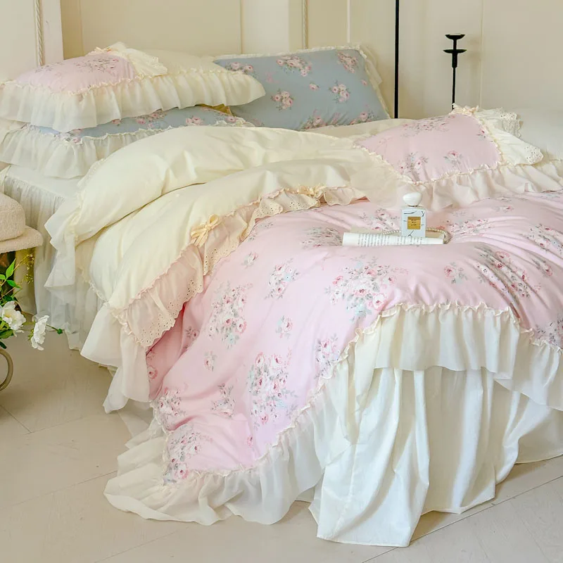 Purpdrank Korean Princess Style Flowers Lace Ruffles 100% Cotton Bedding Set Duvet Cover Bed Sheet/Fitted Sheet/Bed Skirt Pillowcases 4Pcs