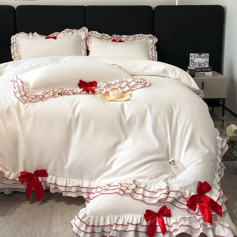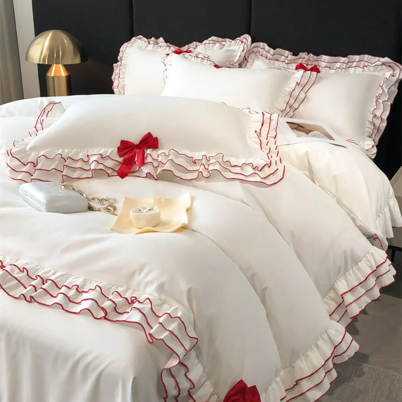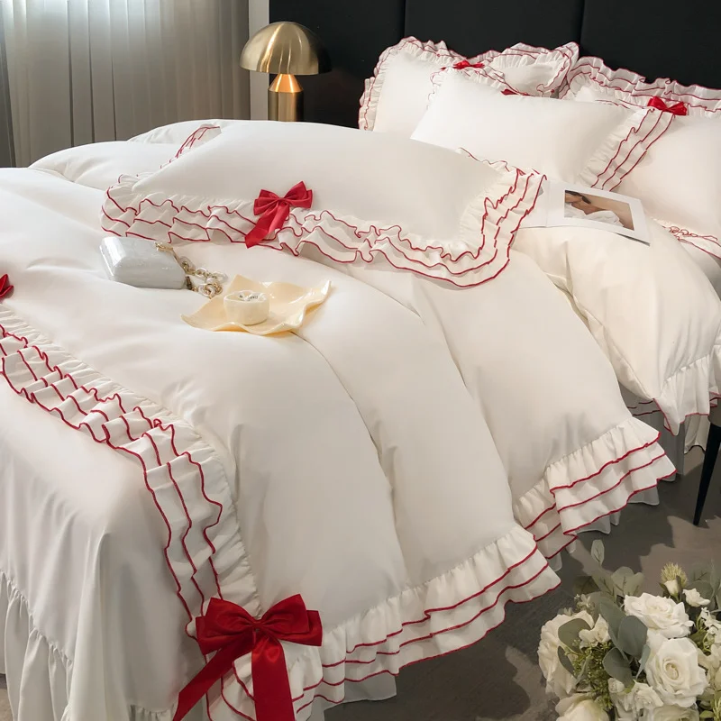 Purpdrank Korean Style Lace Ruffles Princess Bedding Set, Duvet Cover, Bed Skirt, Fitted Sheet, Flat Sheet, Pillowcases, Black Bow, White
