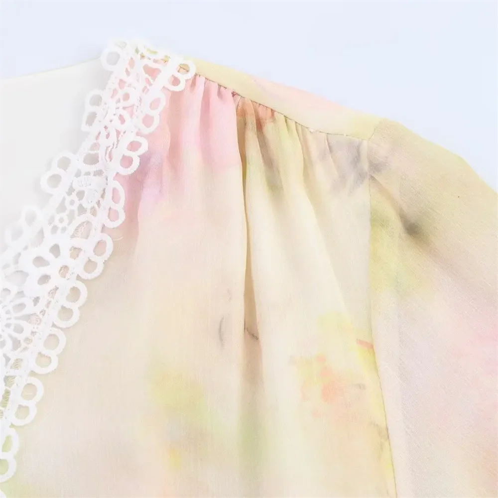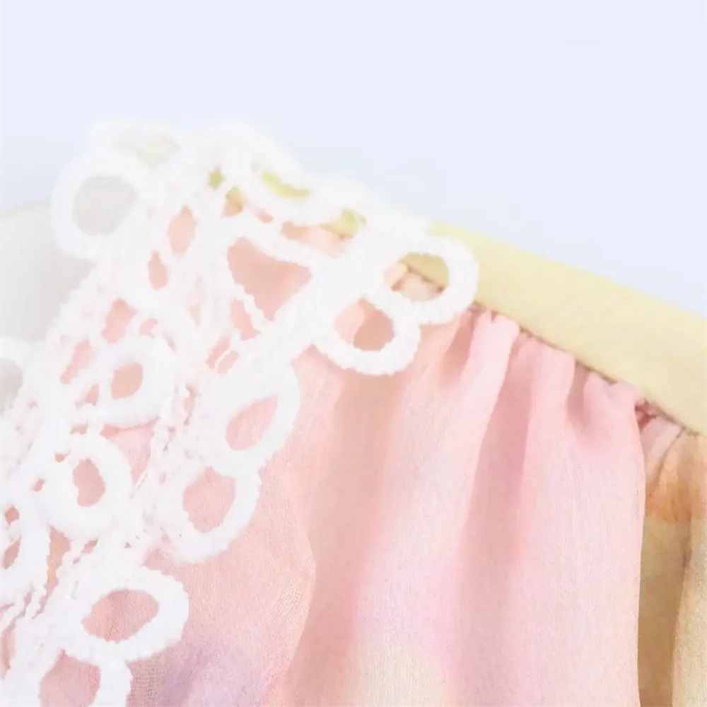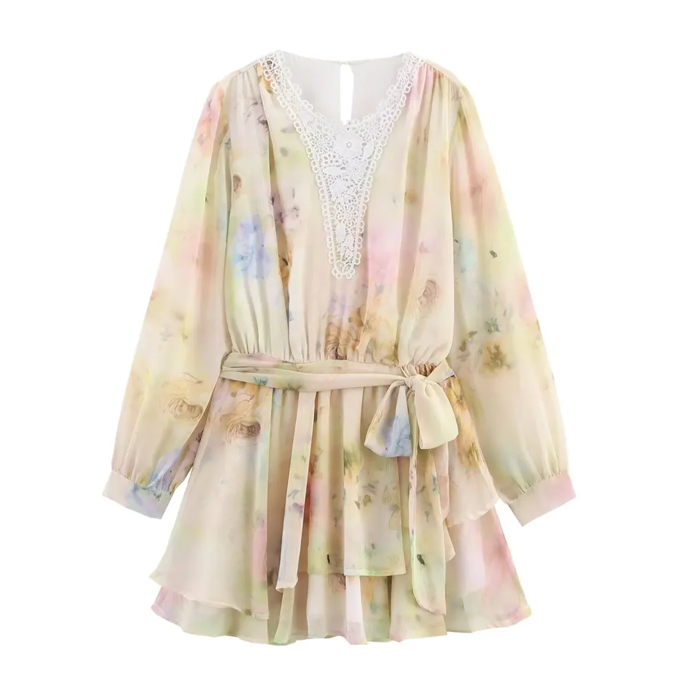 Purpdrank Lace stitching round neck long sleeve loose sweet style A-line dress short skirt summer new women's clothing