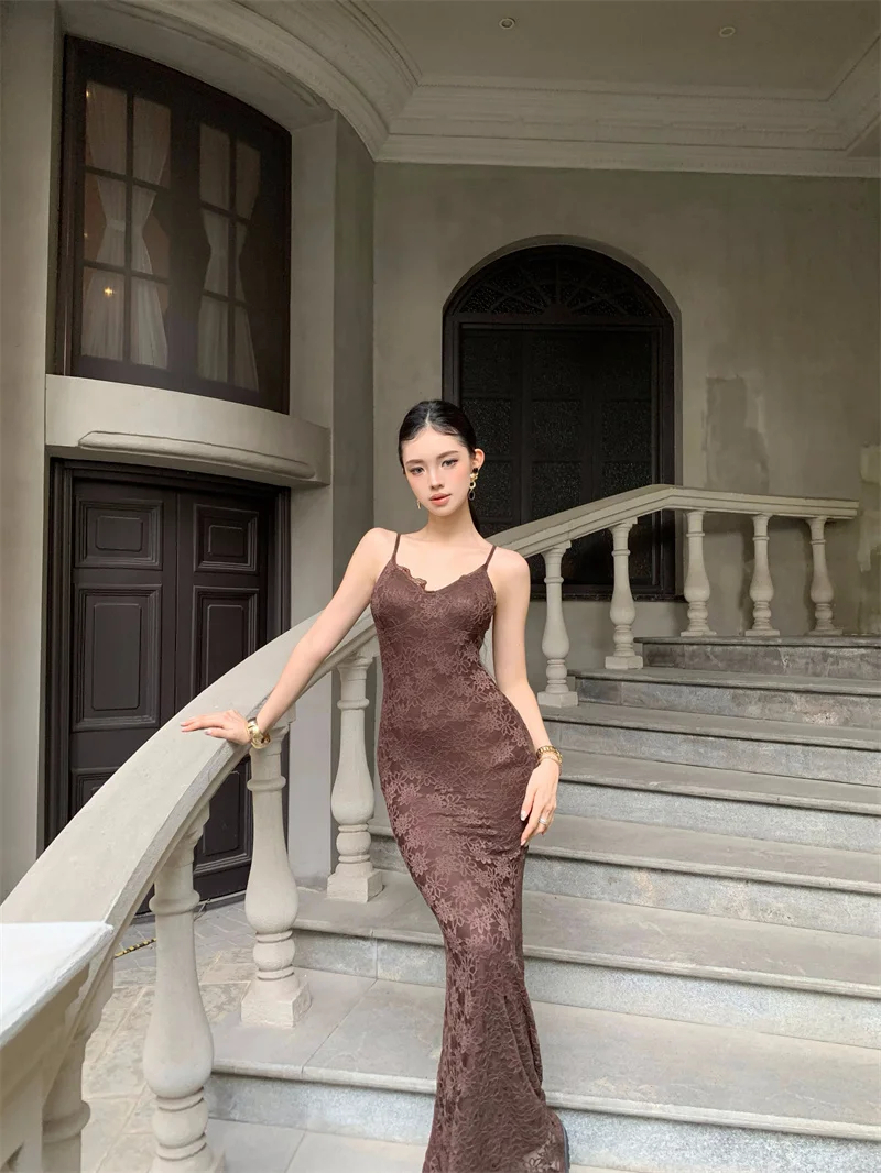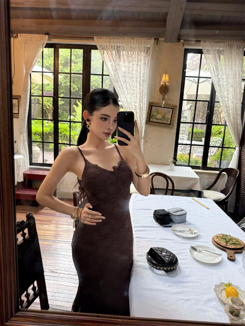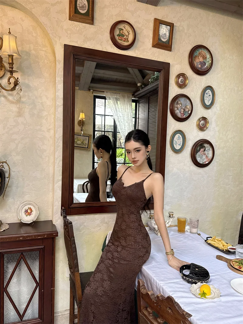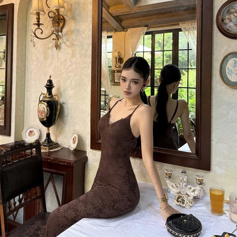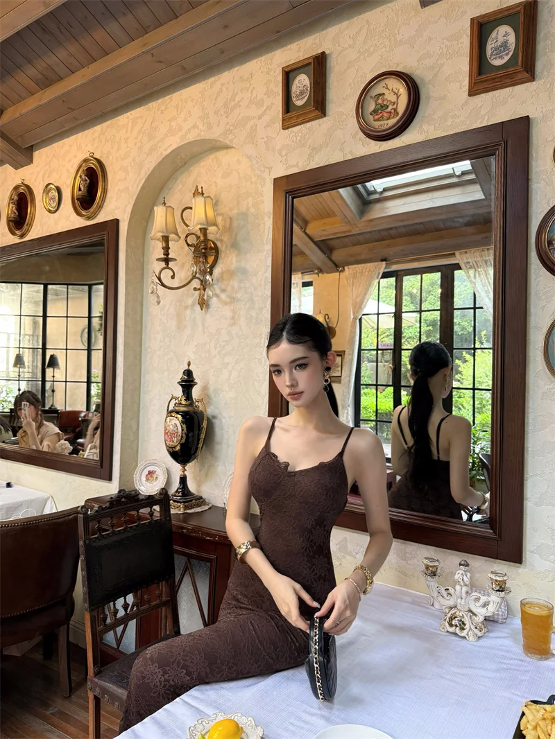 Purpdrank Midnight Roman Spaghetti Strap Dress for Women, Summer Elegant Three-Dimensional Floral Lace Waist-Slimming Long Dress