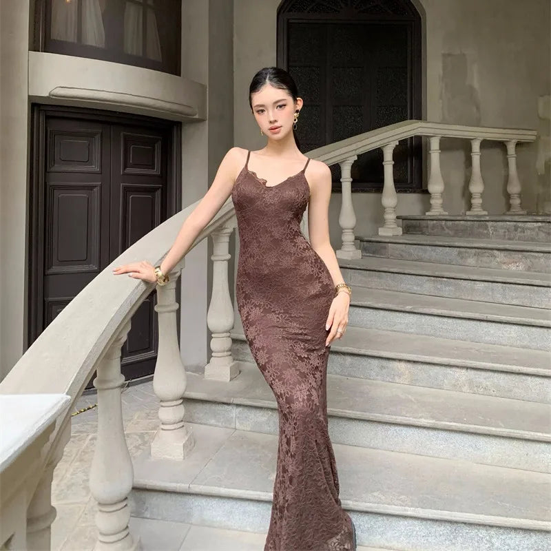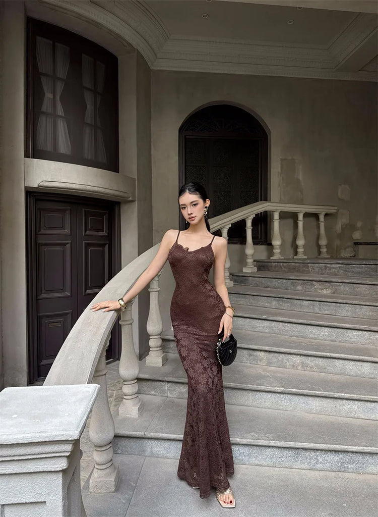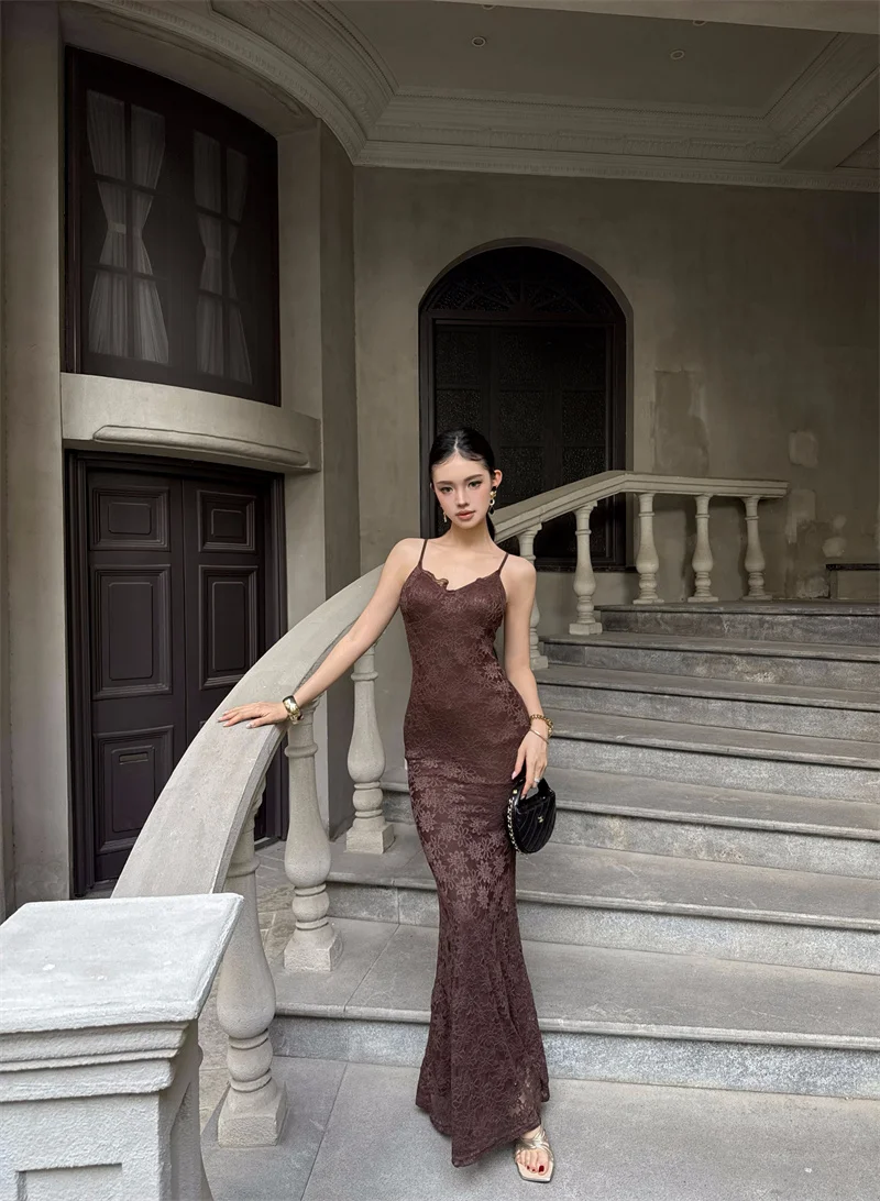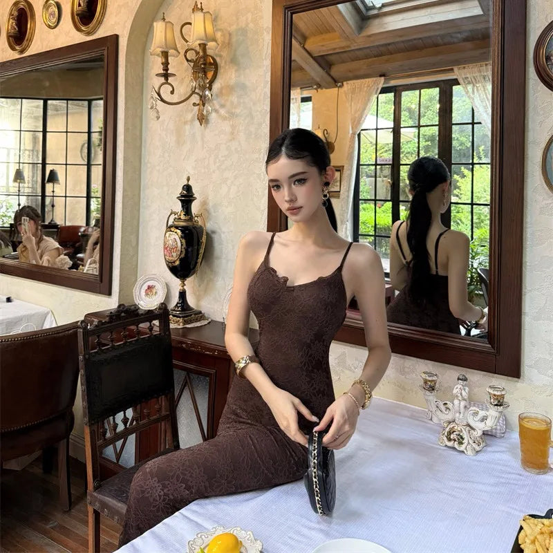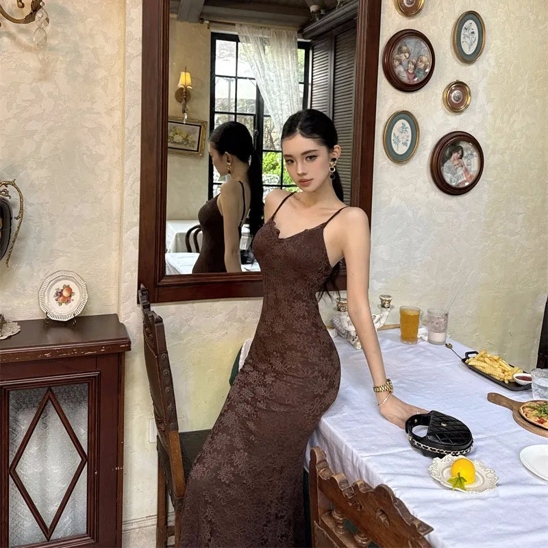 Purpdrank Midnight Roman Spaghetti Strap Dress for Women, Summer Elegant Three-Dimensional Floral Lace Waist-Slimming Long Dress