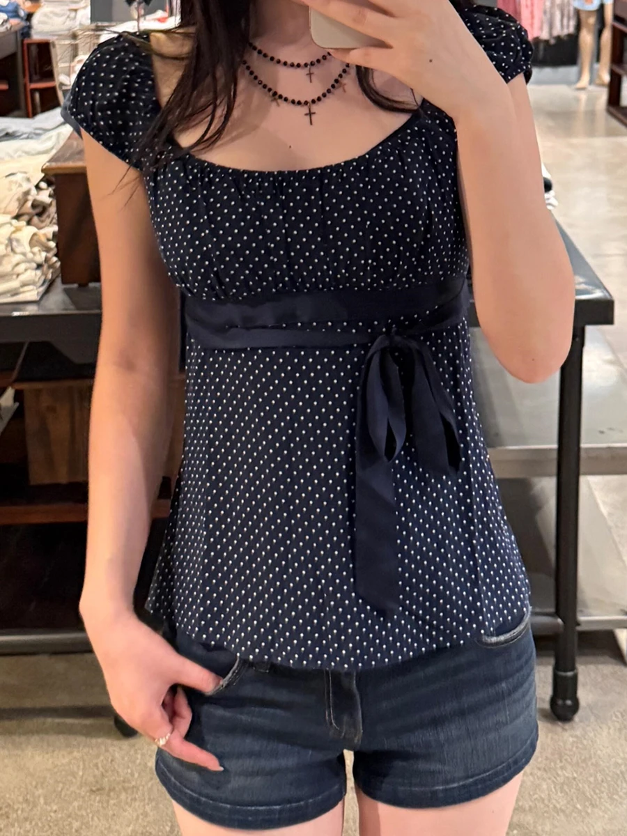 Purpdrank Polka Dot Pink Lace-up T-shirt Blouse Women Summer Folds Square Collar Slim Puff Sleeve Shirts Sweet Vintage Backless Tees New