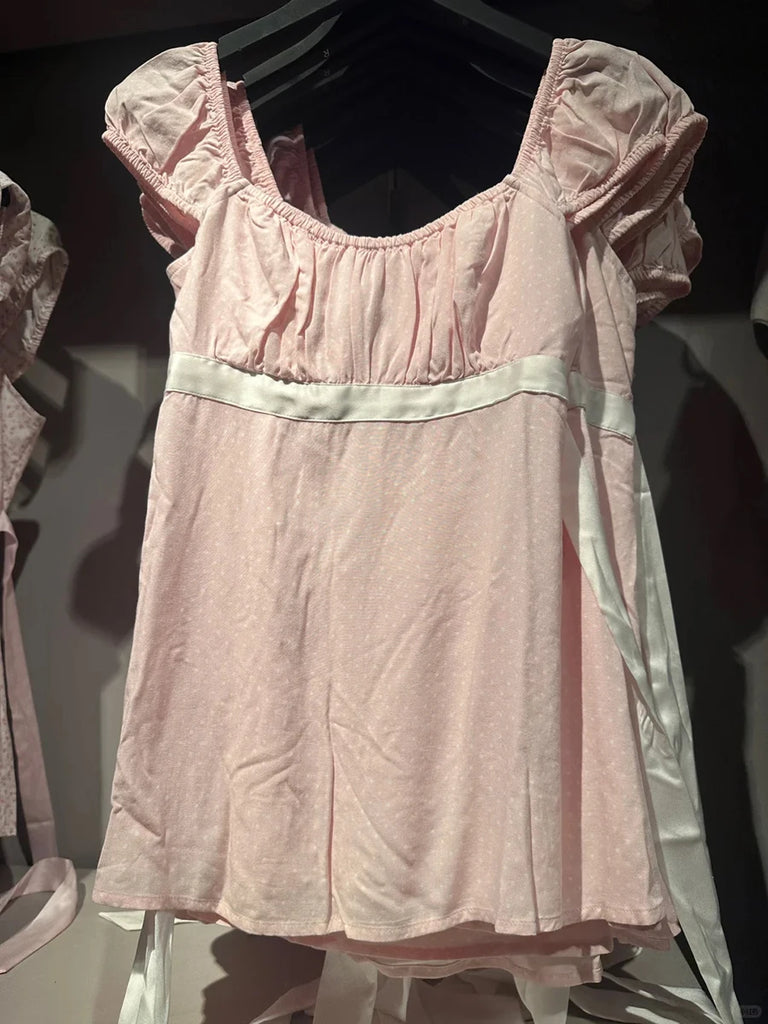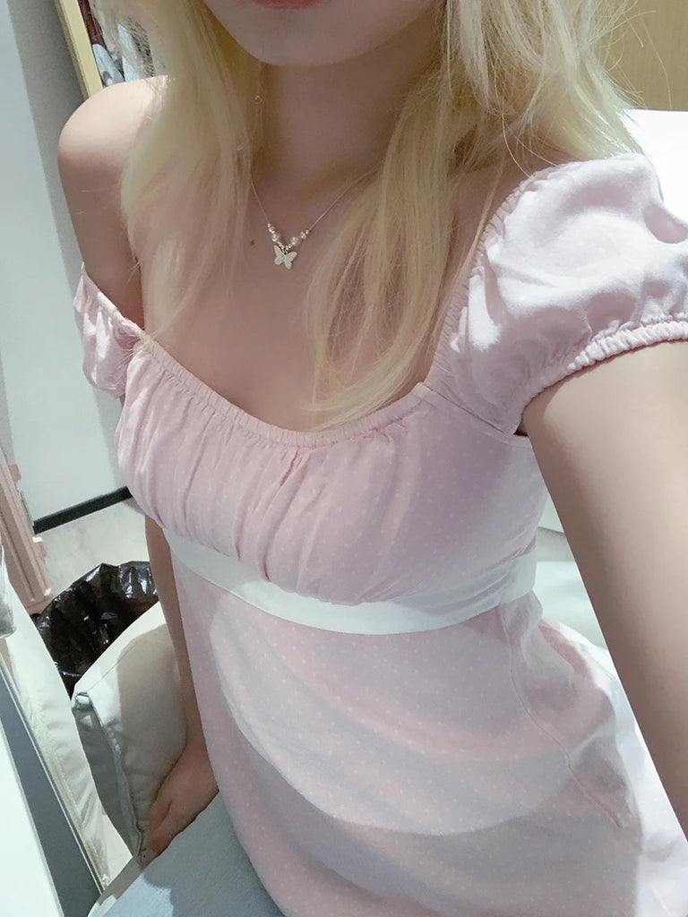 Purpdrank  Polka Dot Pink Lace-up T-shirt Blouse Women Summer Folds Square Collar Slim Puff Sleeve Shirts Sweet Vintage Backless Tees New