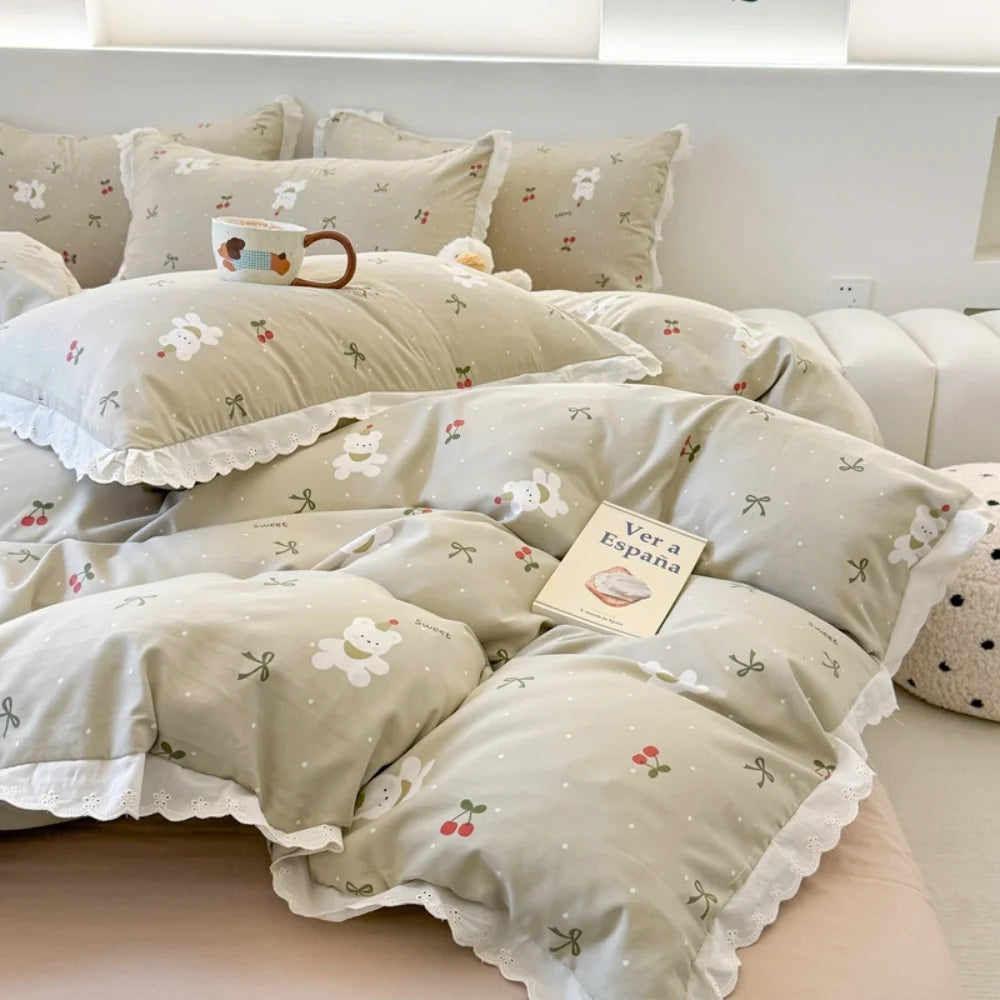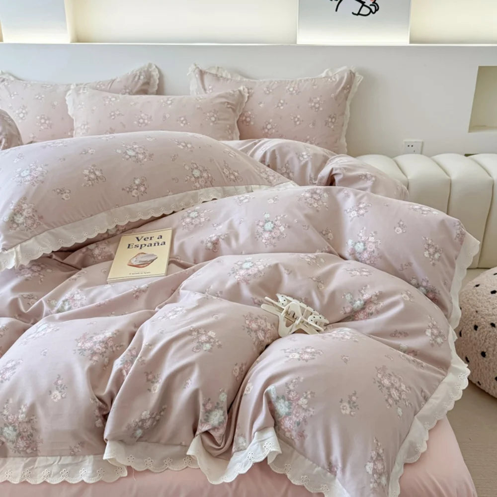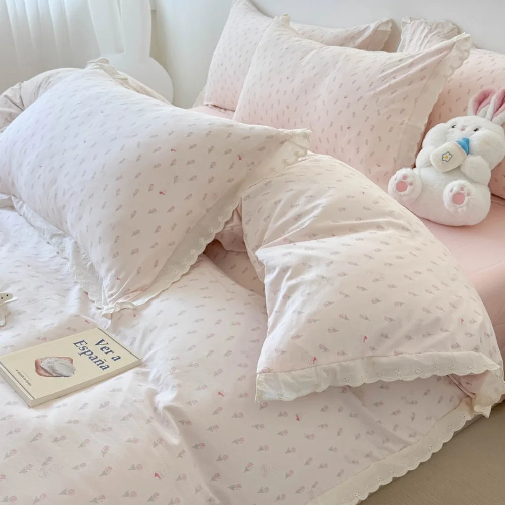Purpdrank Princess Style Bedding Sets Ruffle Lace Bow Quilt Cover Romantic Print Bedclothes Home Bedroom Decor Woman Girl Duvet Cover 4pcs