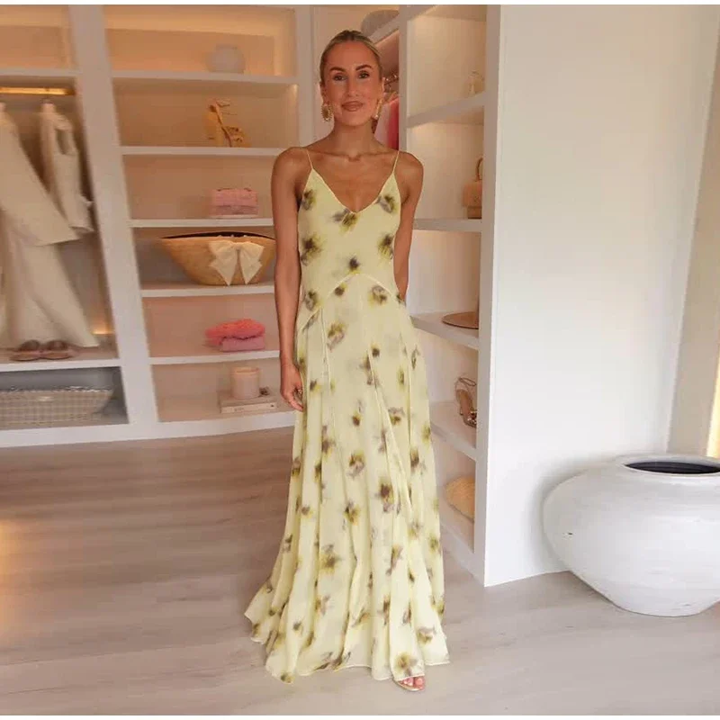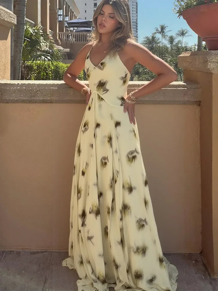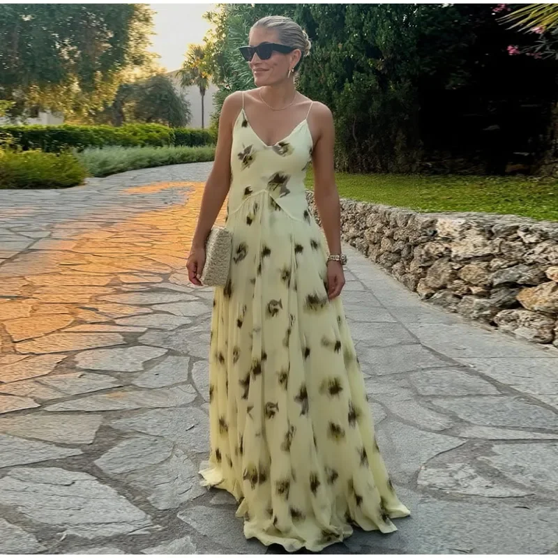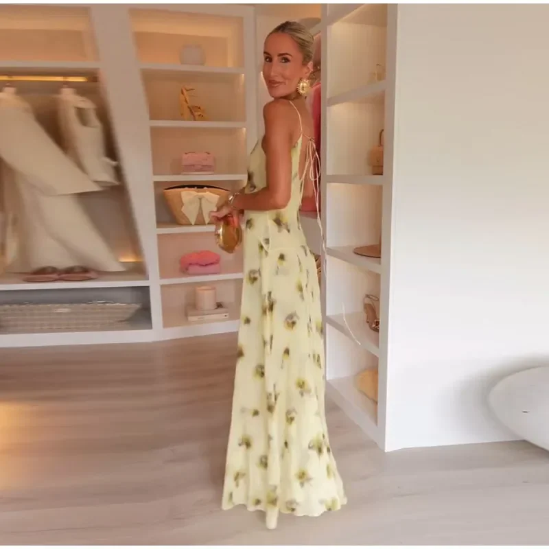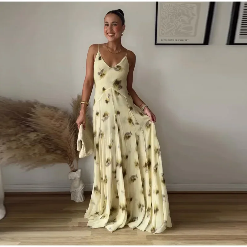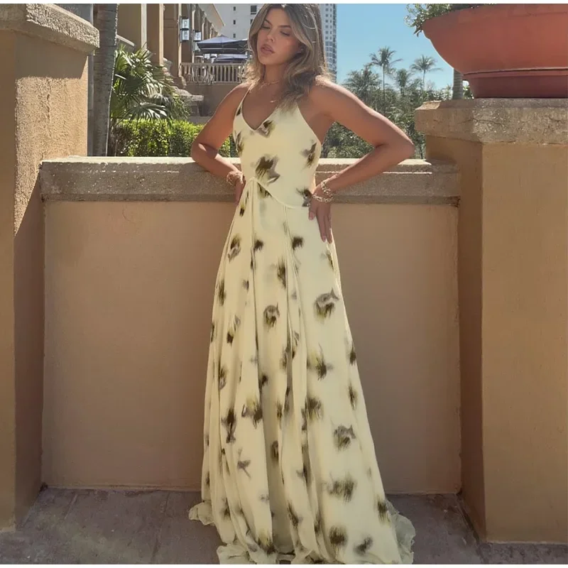 Purpdrank Printed Sling Long Dresses Women V-neck Sleeveless Backless Lace Up A-line Dress 2025 Summer Lady Holiday Sexy Pleated Robes