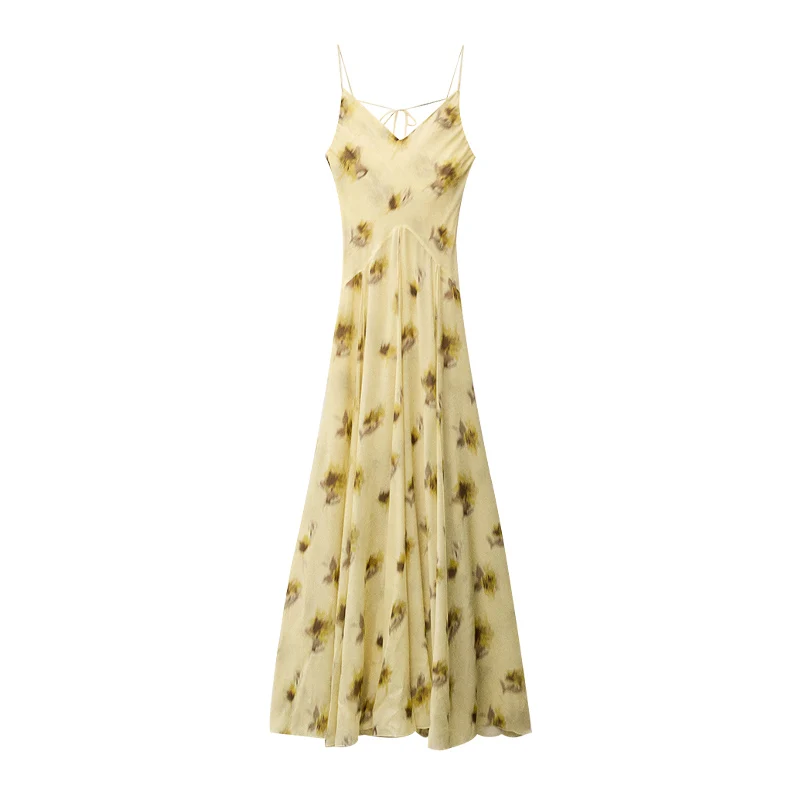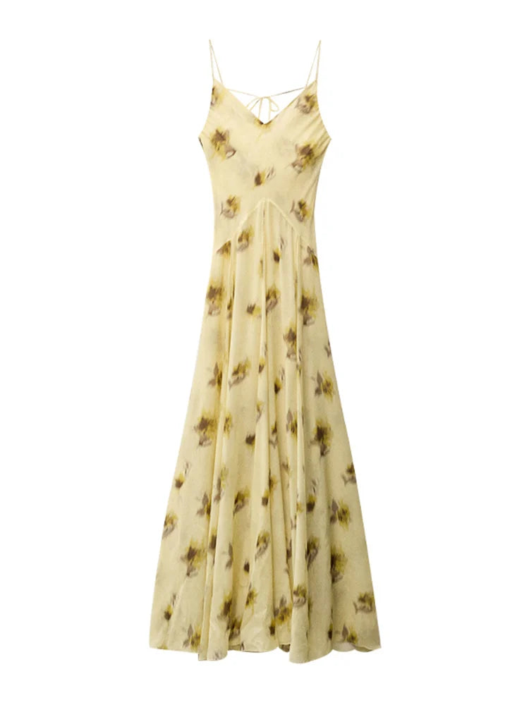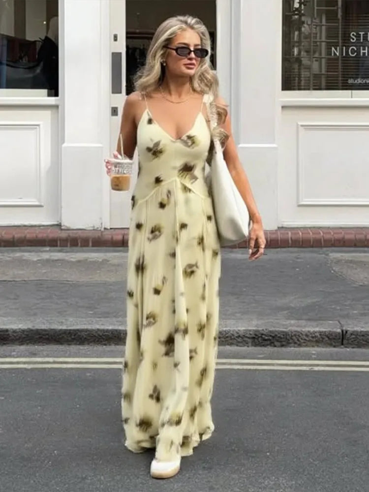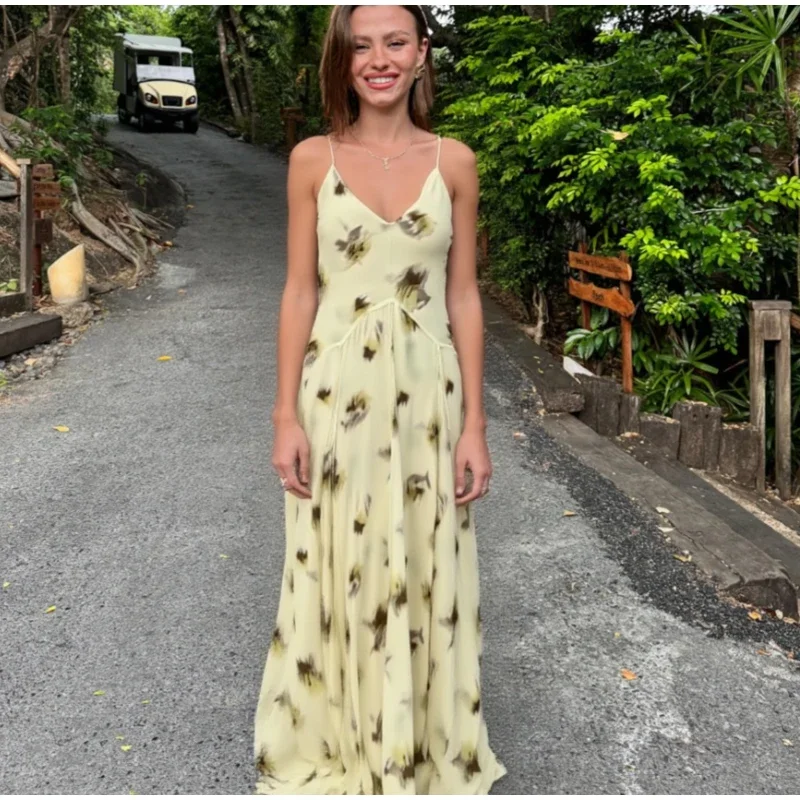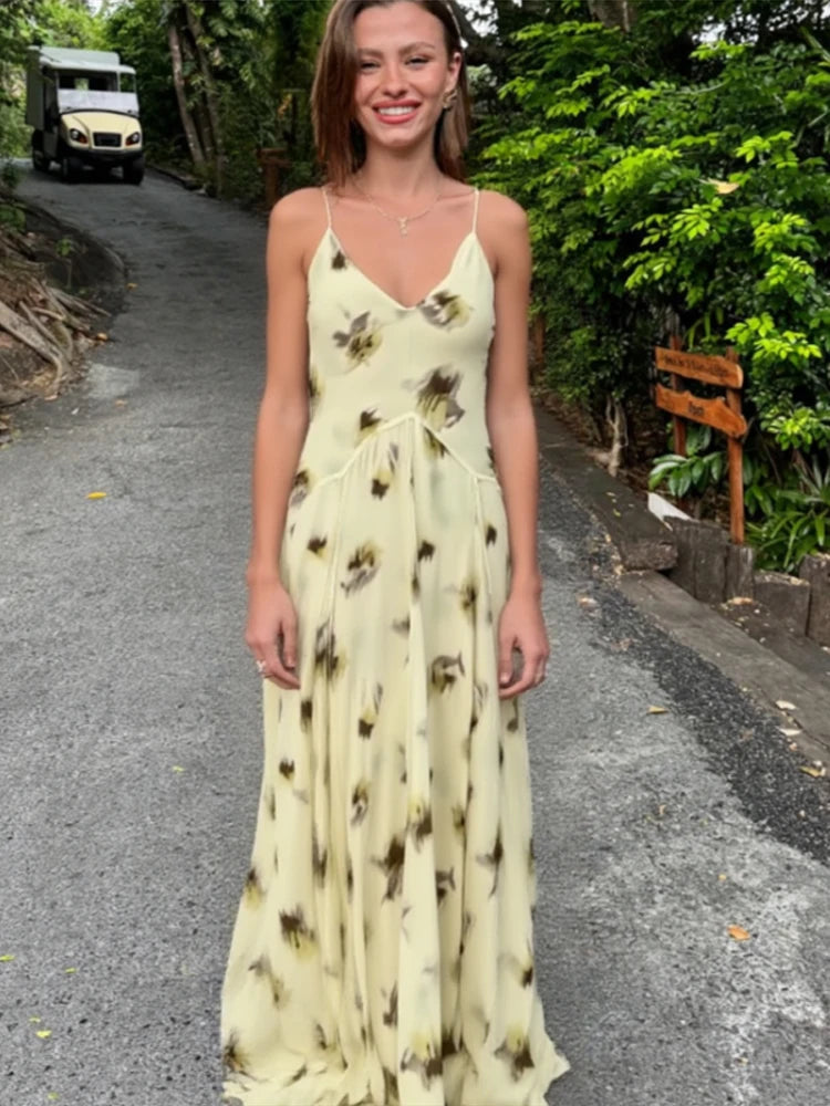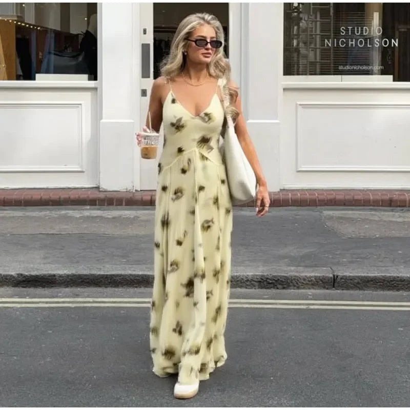 Purpdrank Printed Sling Long Dresses Women V-neck Sleeveless Backless Lace Up A-line Dress 2025 Summer Lady Holiday Sexy Pleated Robes