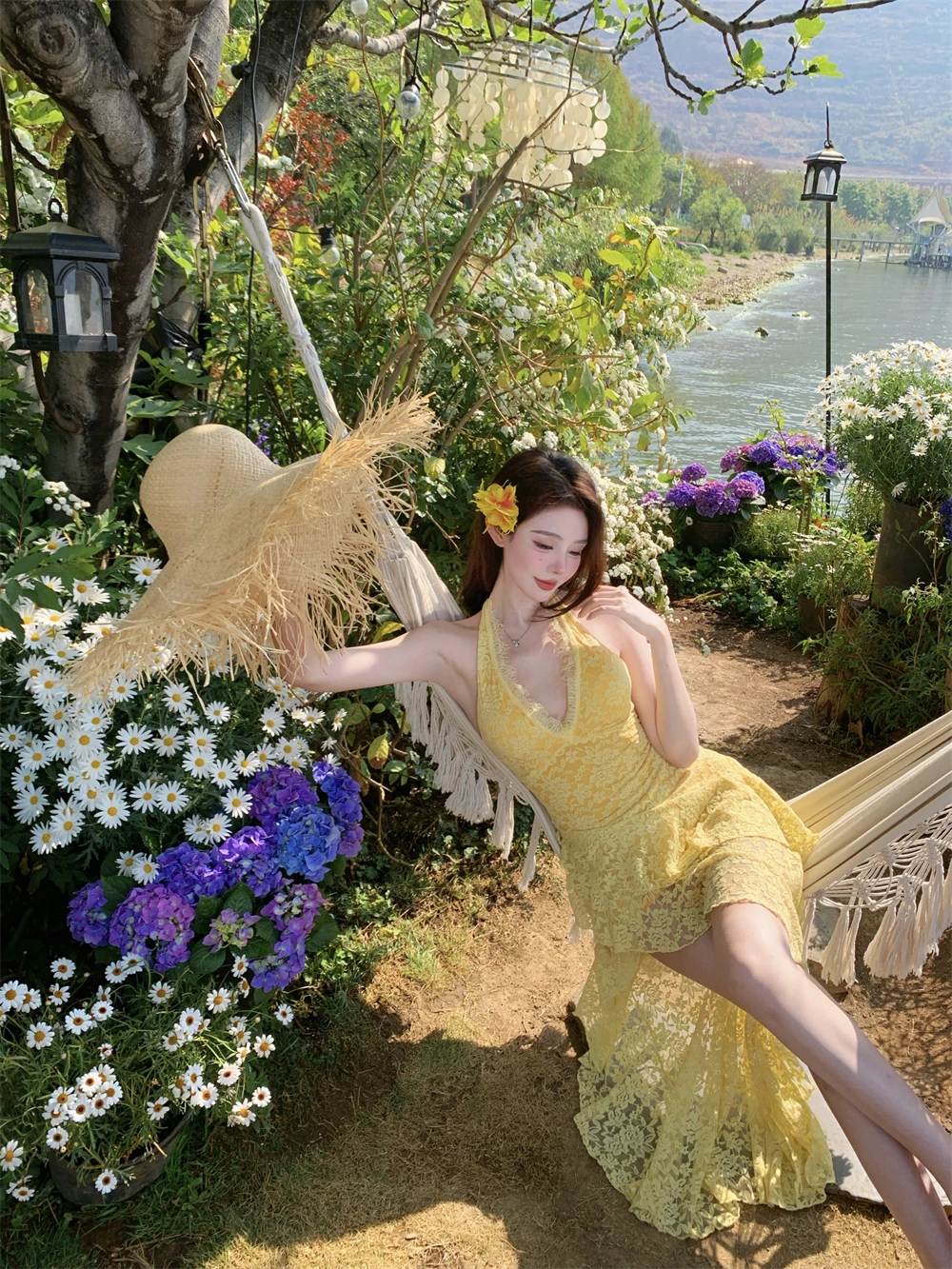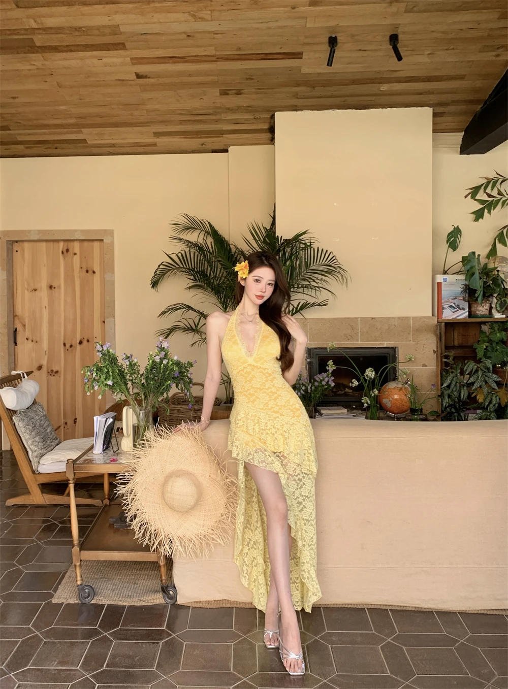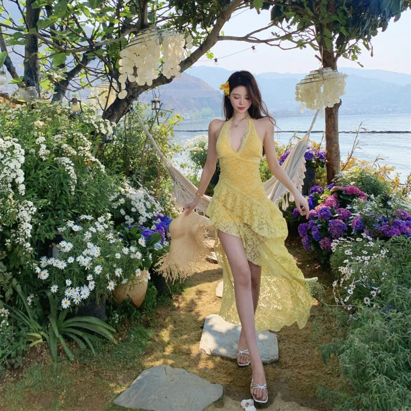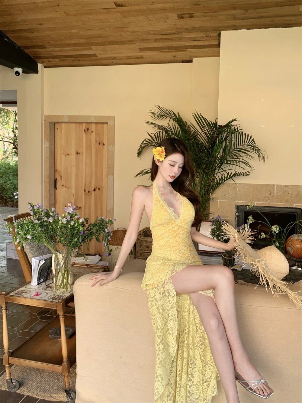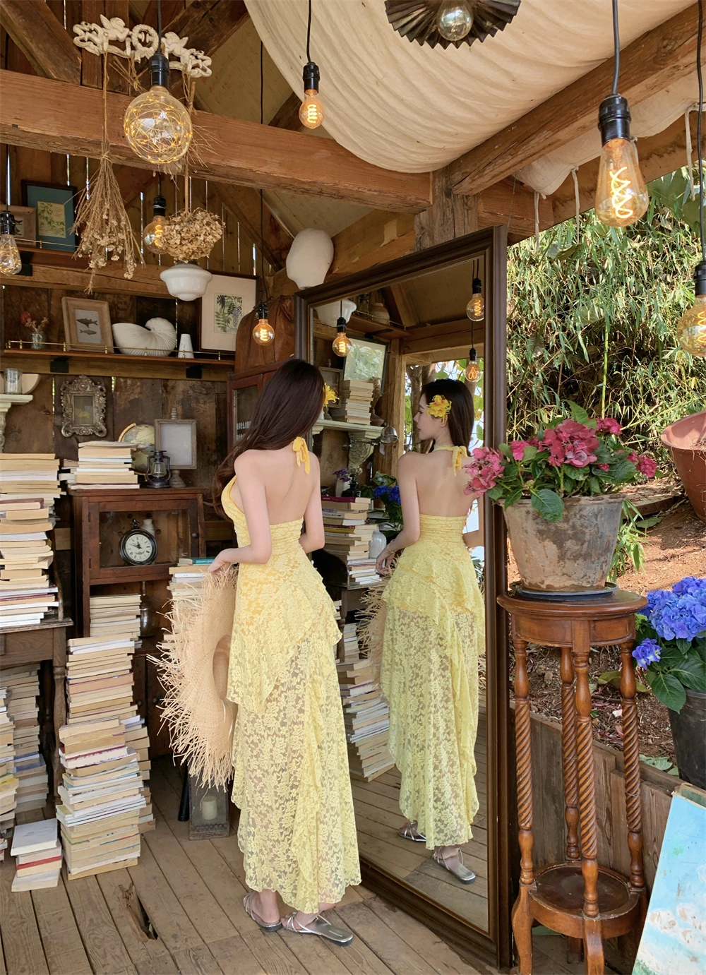 Purpdrank Pure Desire Girl Lace Halter Dress Women's Summer New Sexy Waist-Cinching Long Dress