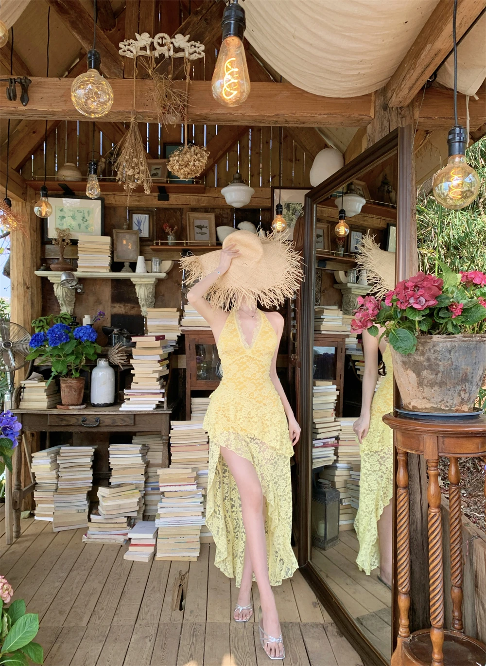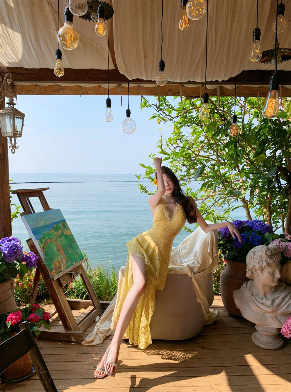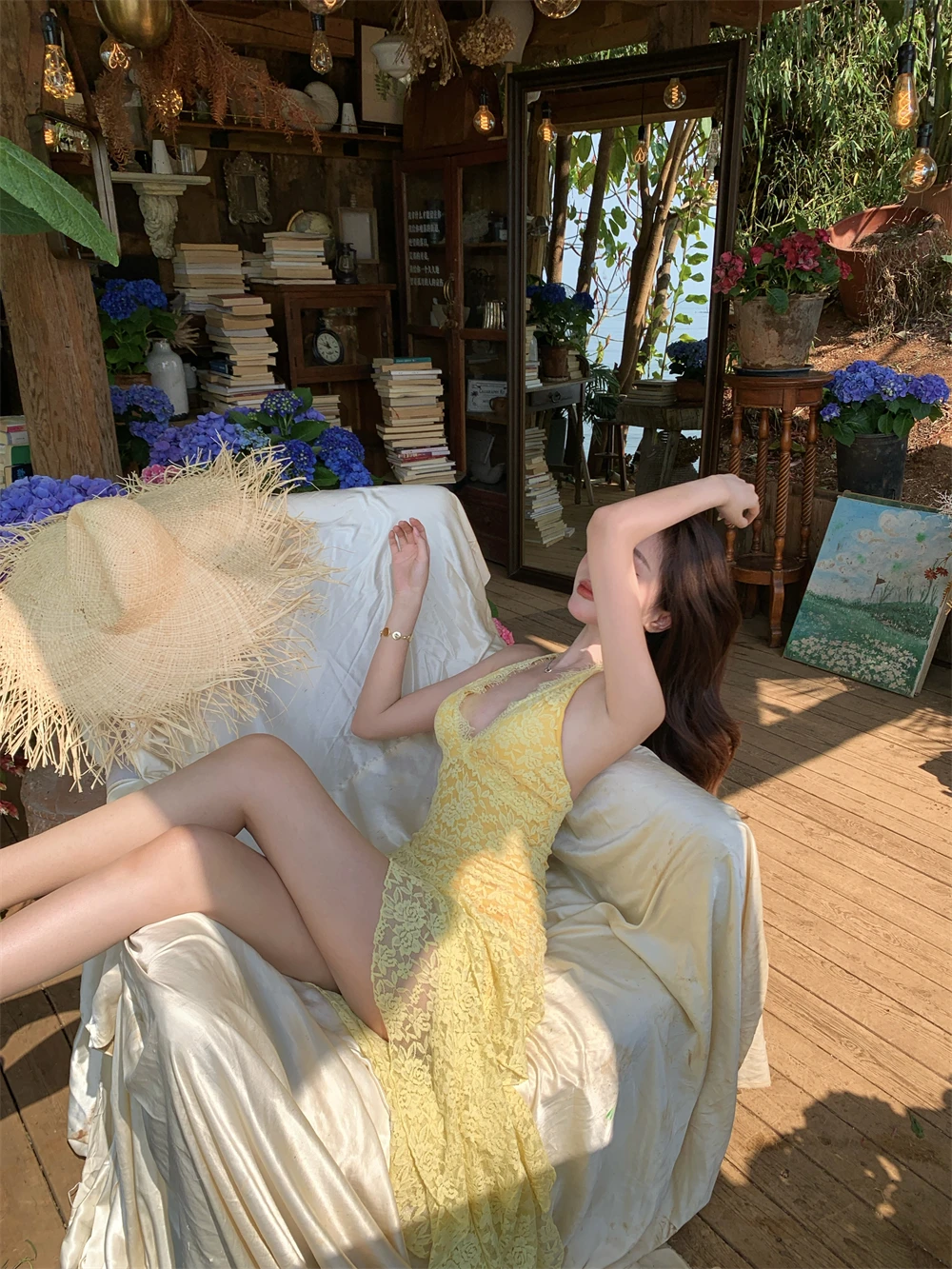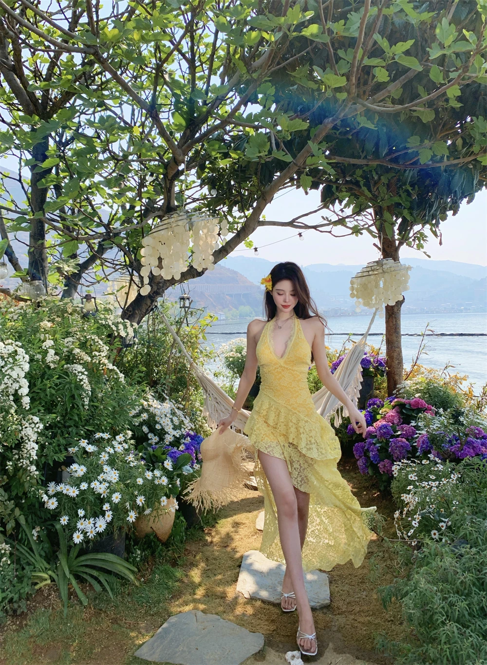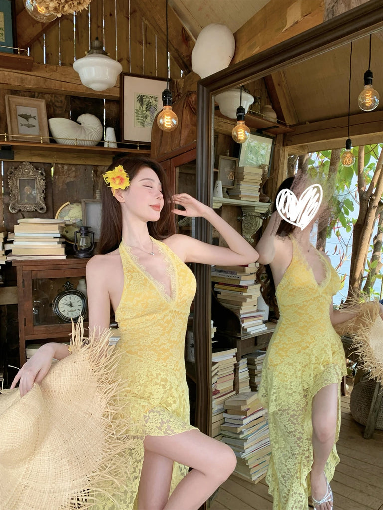 Purpdrank Pure Desire Girl Lace Halter Dress Women's Summer New Sexy Waist-Cinching Long Dress