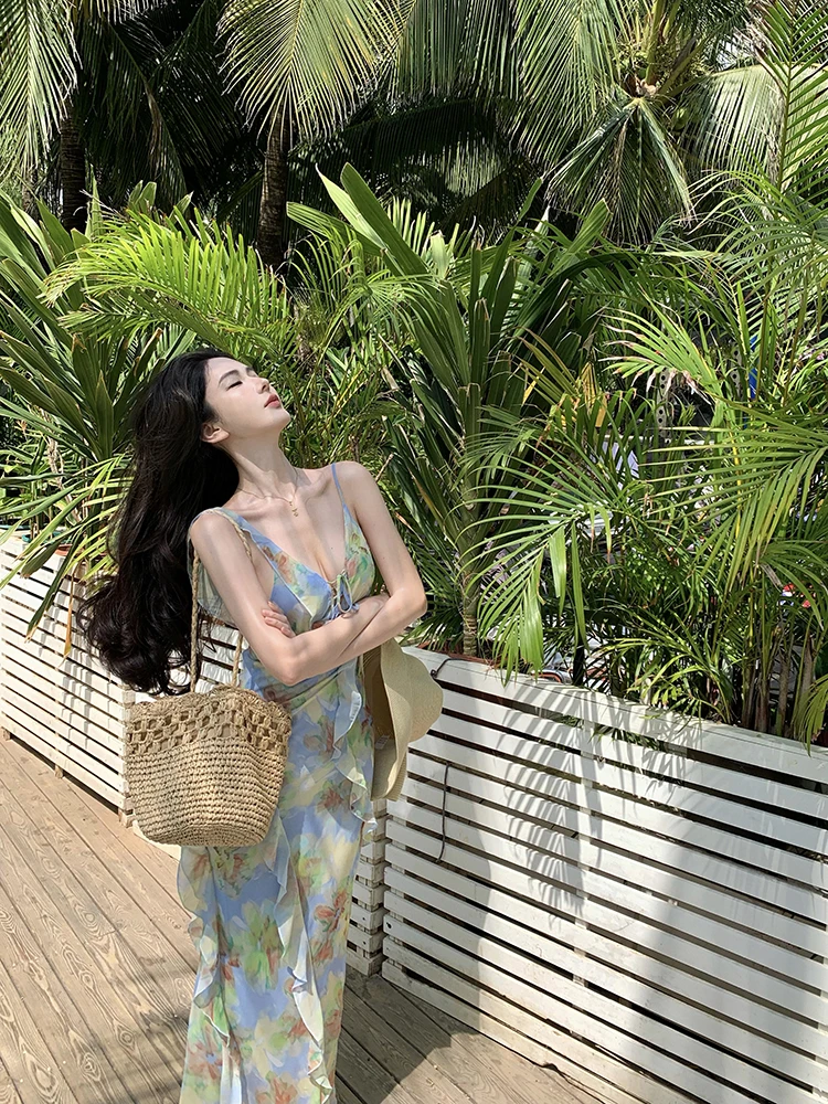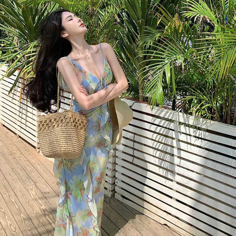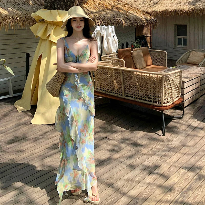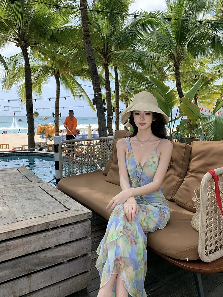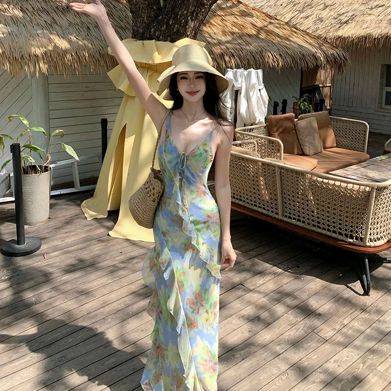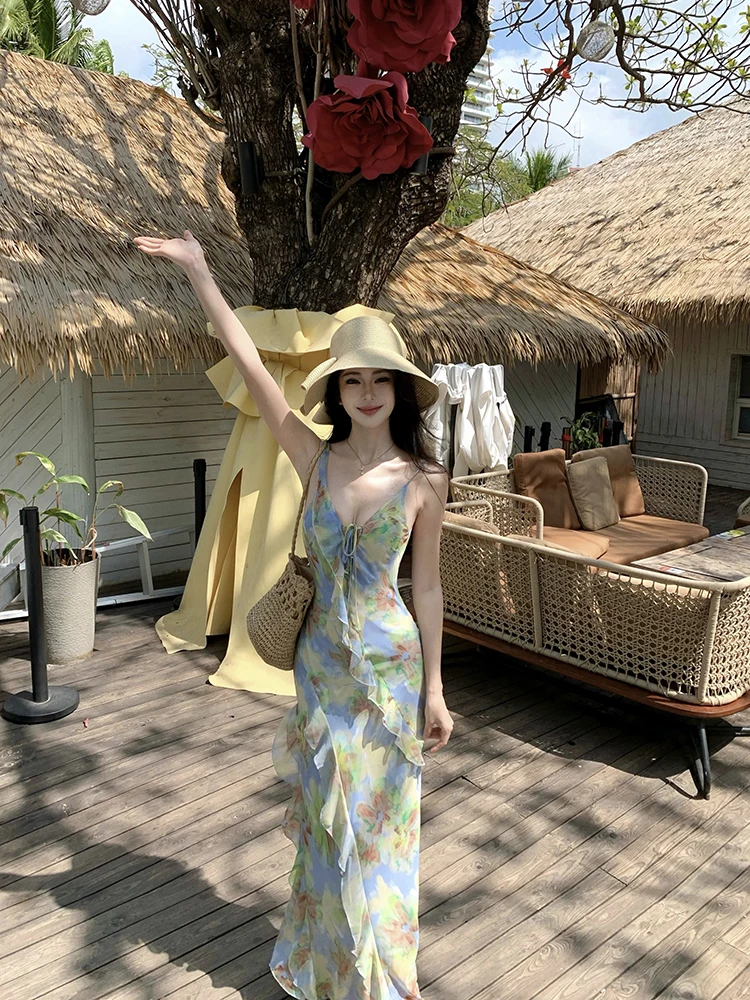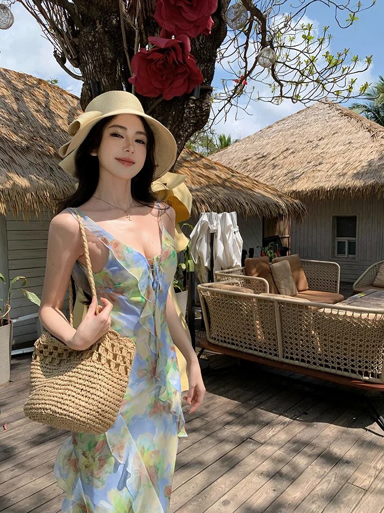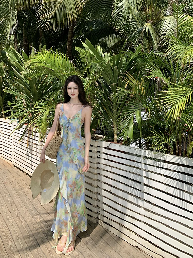 Purpdrank Real Shot Tea Break French Style Floral Strap Dress Summer New V-neck Backless Waist-cinching Long Dress