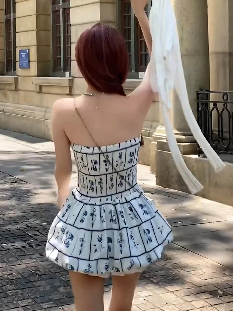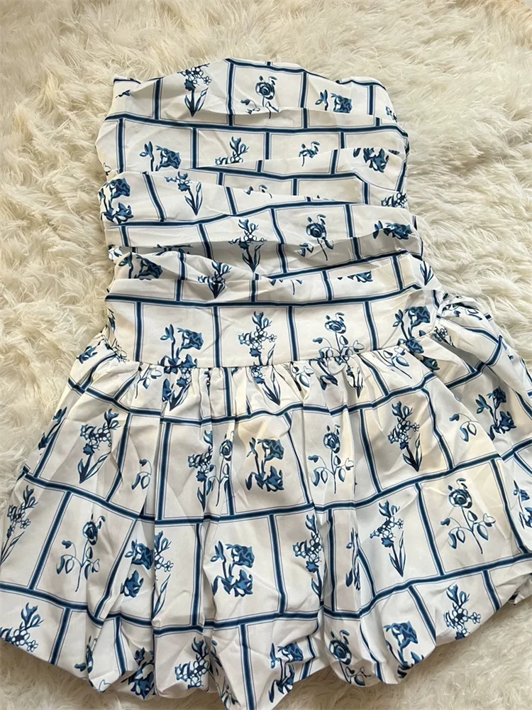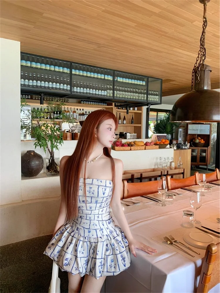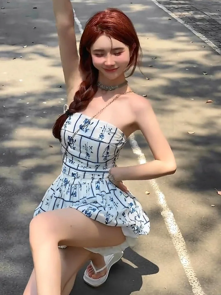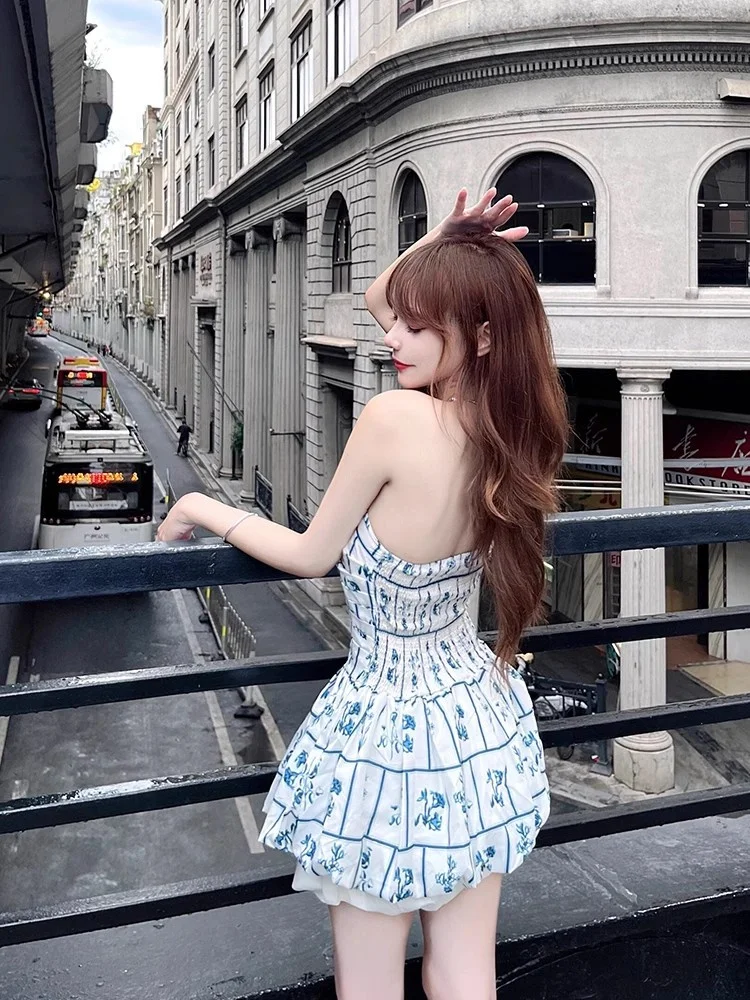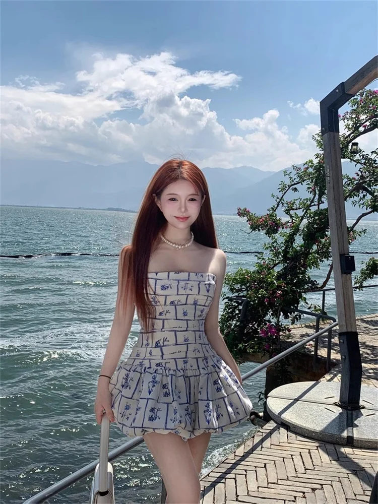 Purpdrank Retro Blue Printed Summer Dress Women Trendy New Sweet Spicy Girls Short Dress Holiday Style Elastic Back Strapless Dresses