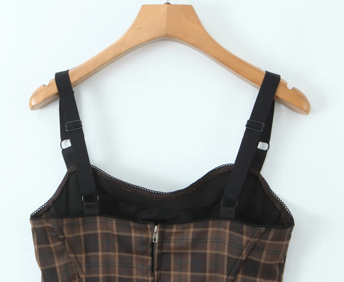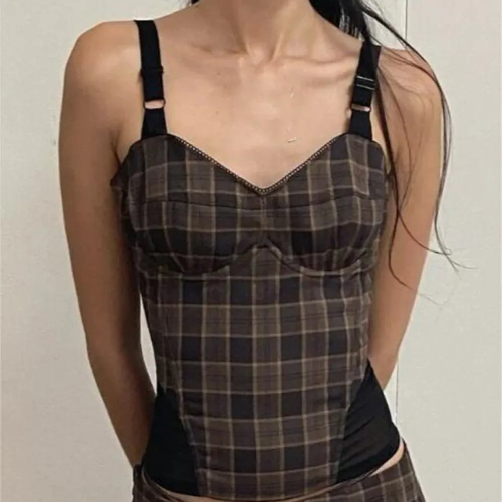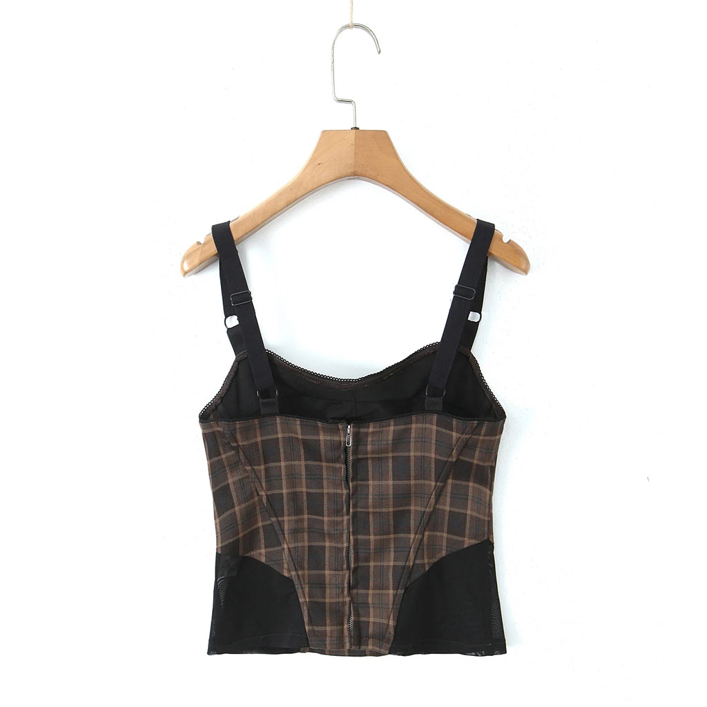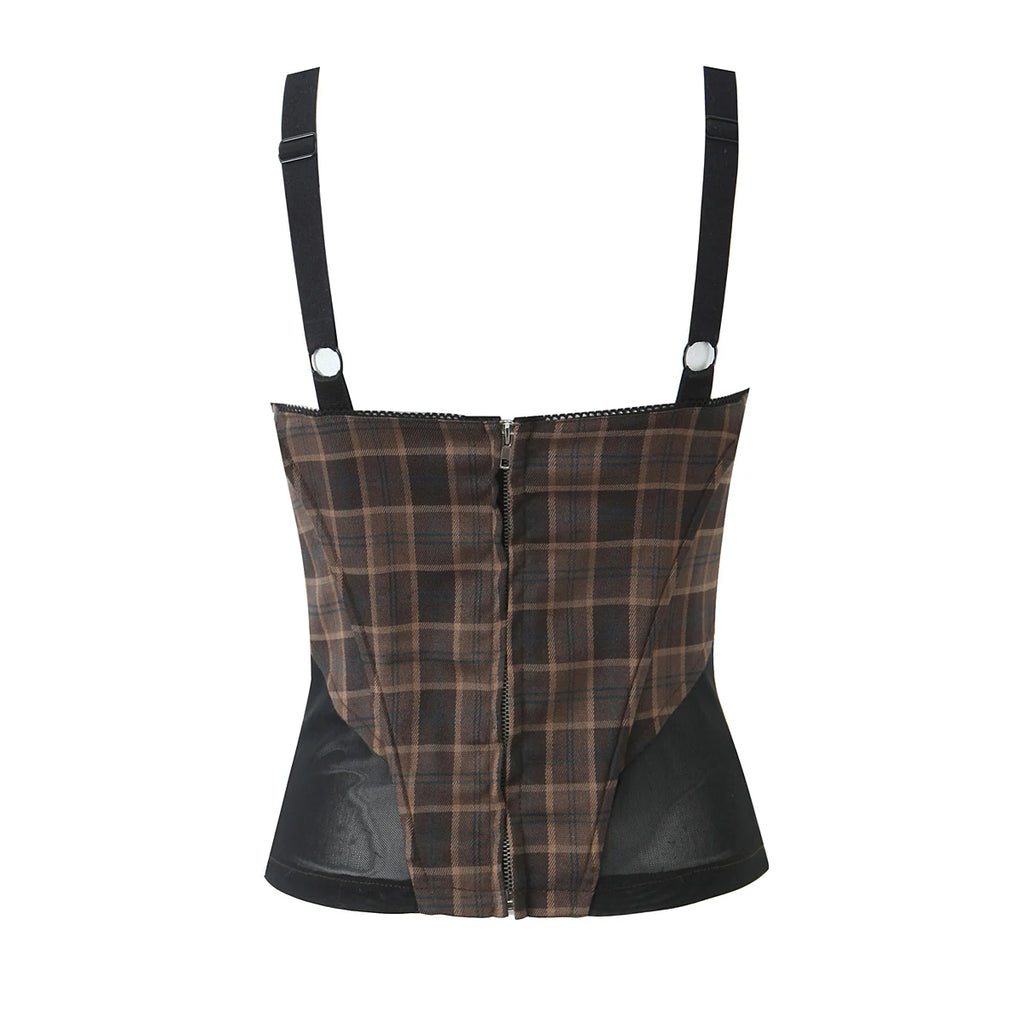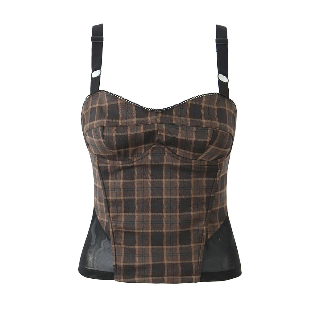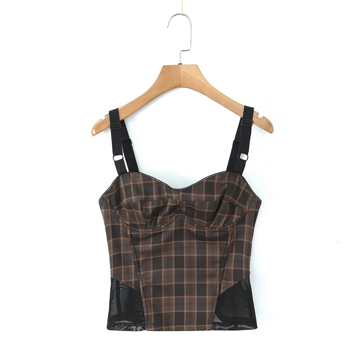 Purpdrank Sexy Ruched Wire Bra Coffee Plaid Camis Women Spliced Black Mesh Waist Back Zipper Crop Top Camisoles Bra Tank Vest
