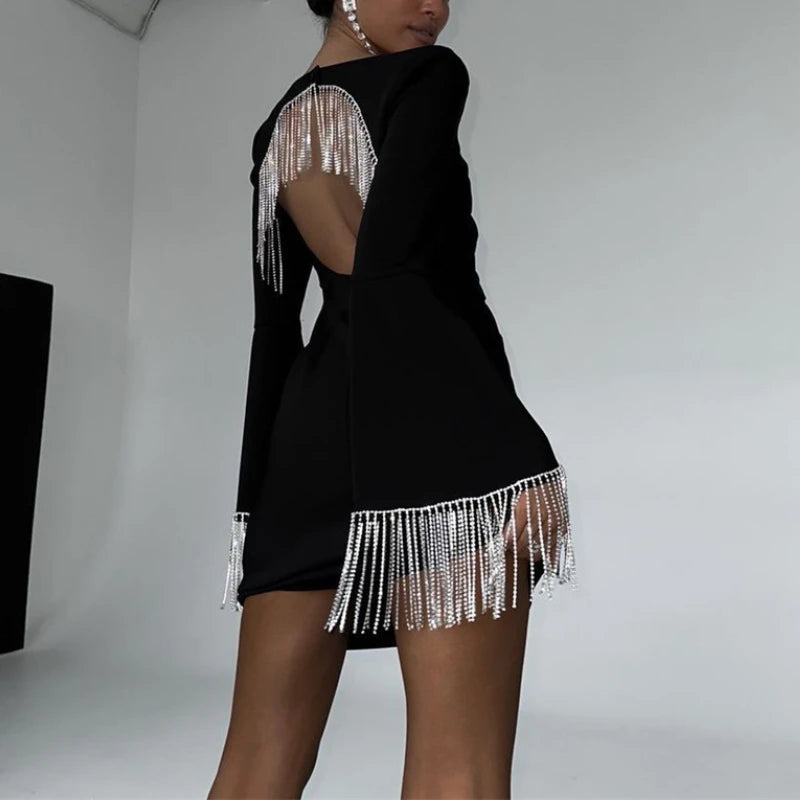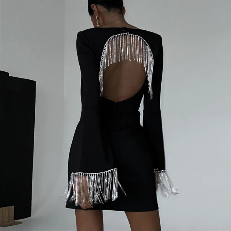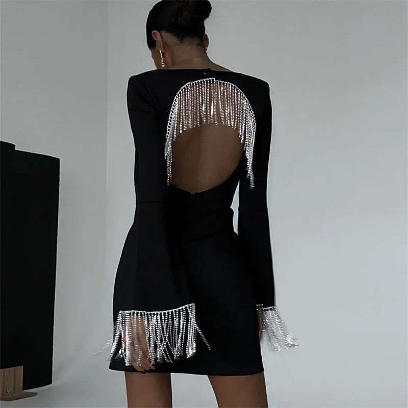 Purpdrank Sexy Square Collar Hollow Backless Club Dress Solid Flare Sleeve Tassel Edge Party Dresses High Street Mini Dresses
